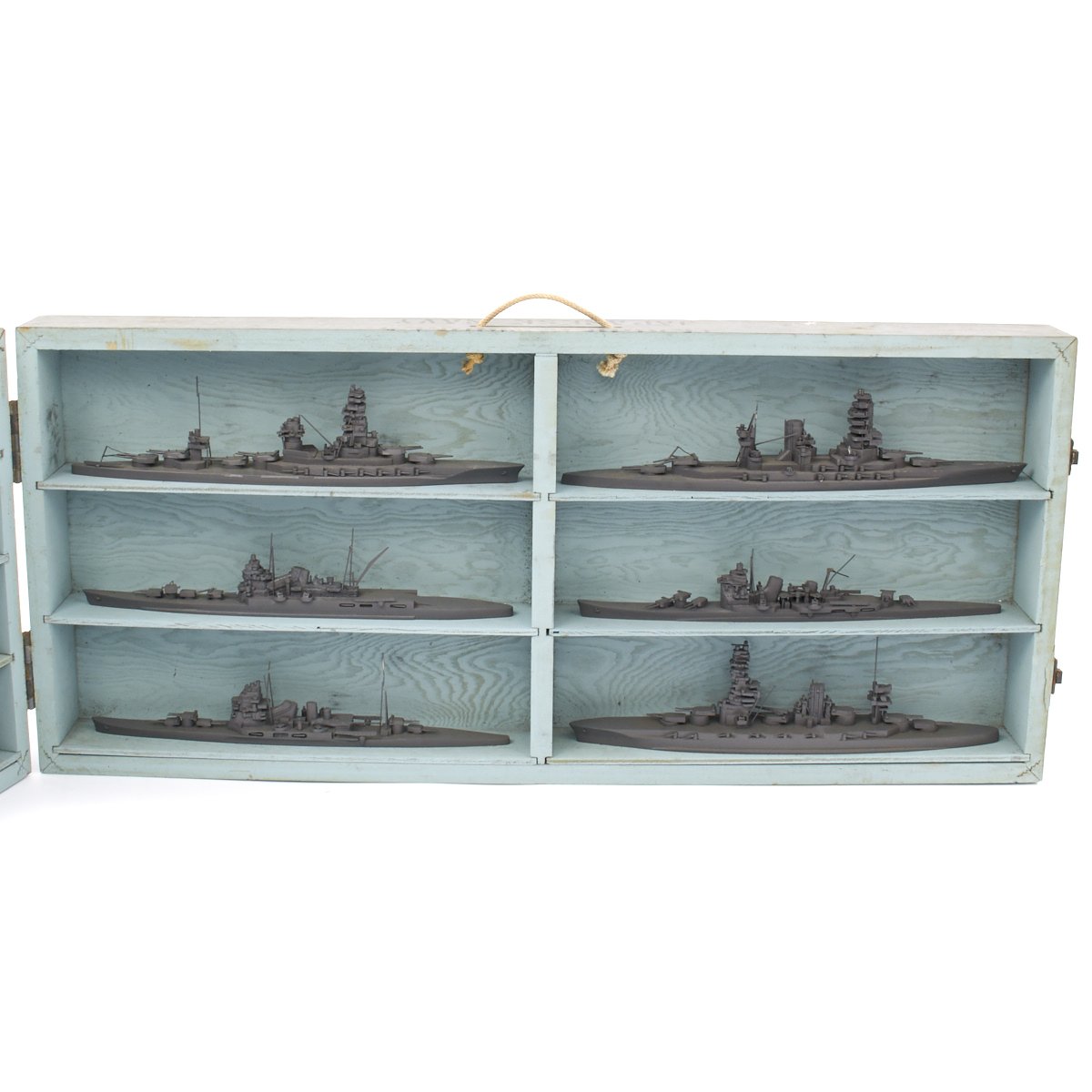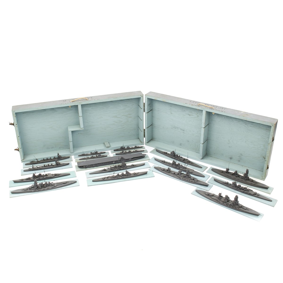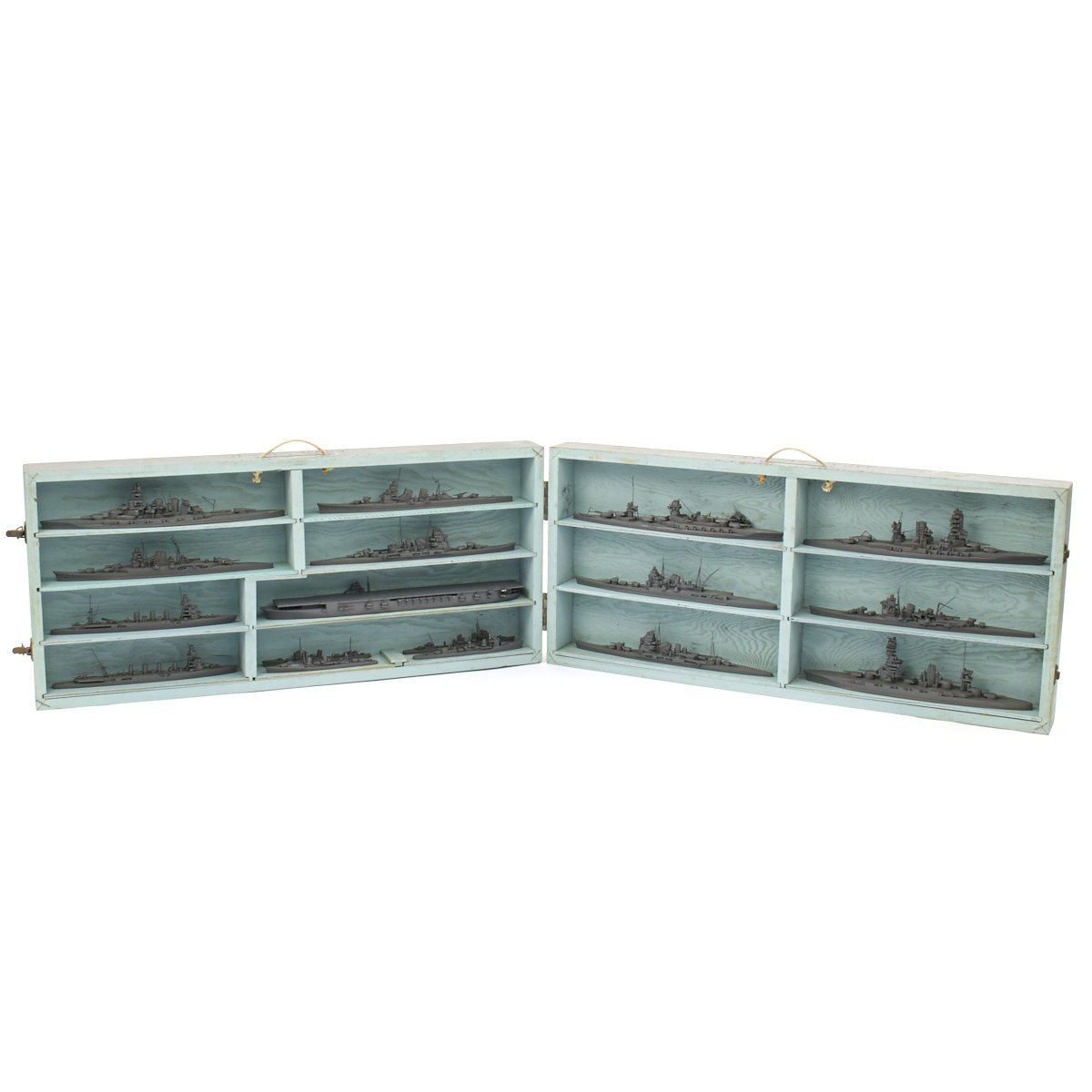 This set is contained in a wood chest measuring that opens like a book to display 16 individual slots each containing a Japanese Fleet model vessel. Each vessel is made from lead is marked with the ship's name or class.