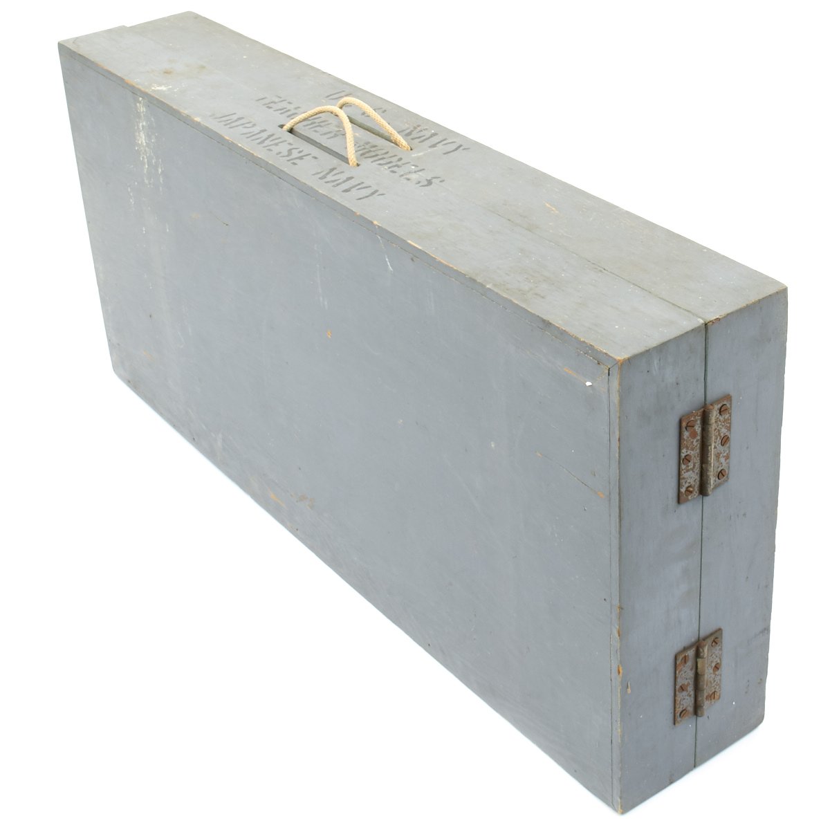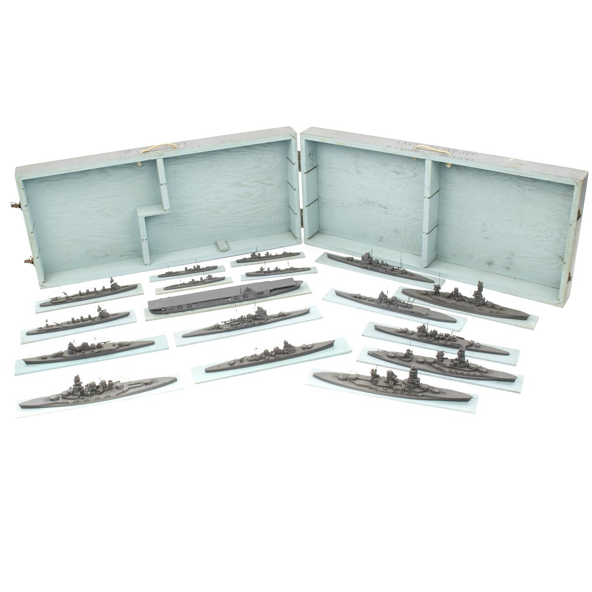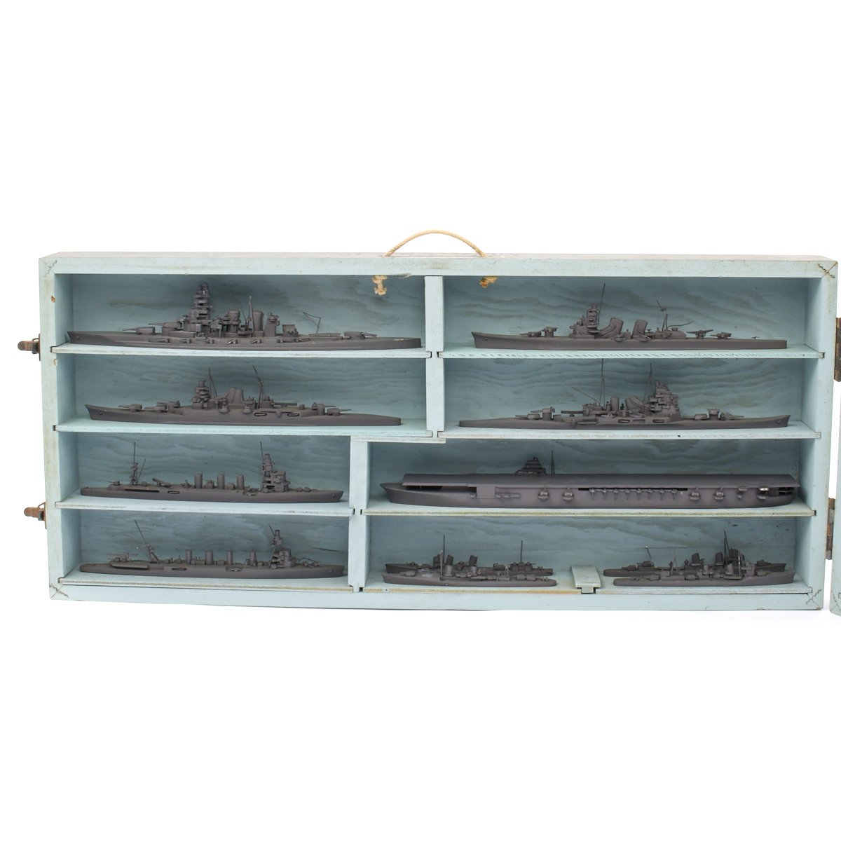 This set is contained in a wood chest measuring that opens like a book to display 16 individual slots each containing a Japanese Fleet model vessel. Each vessel is made from lead is marked with the ship's name or class.