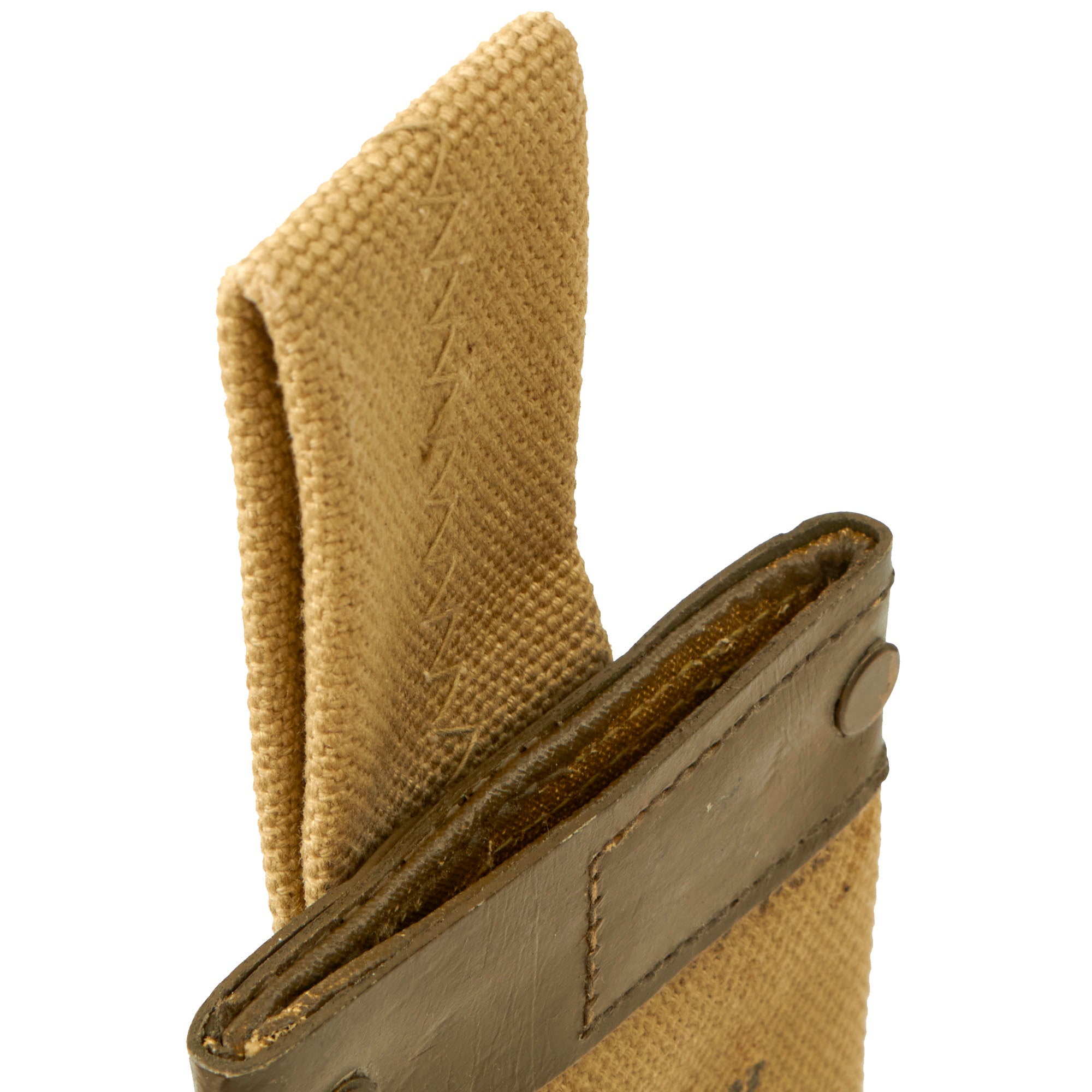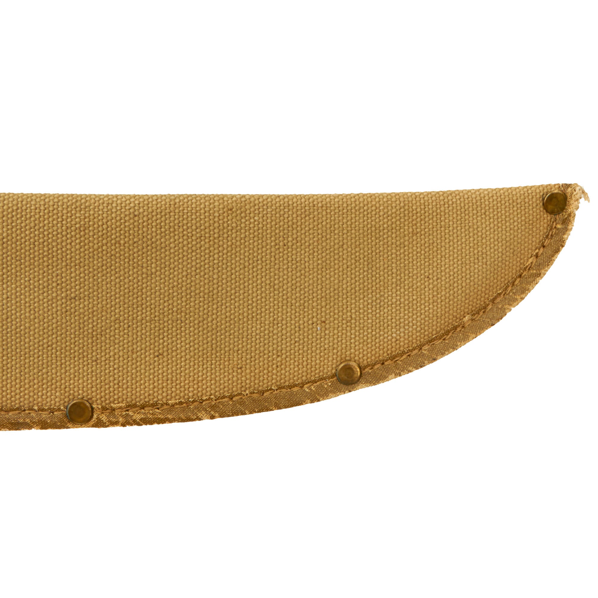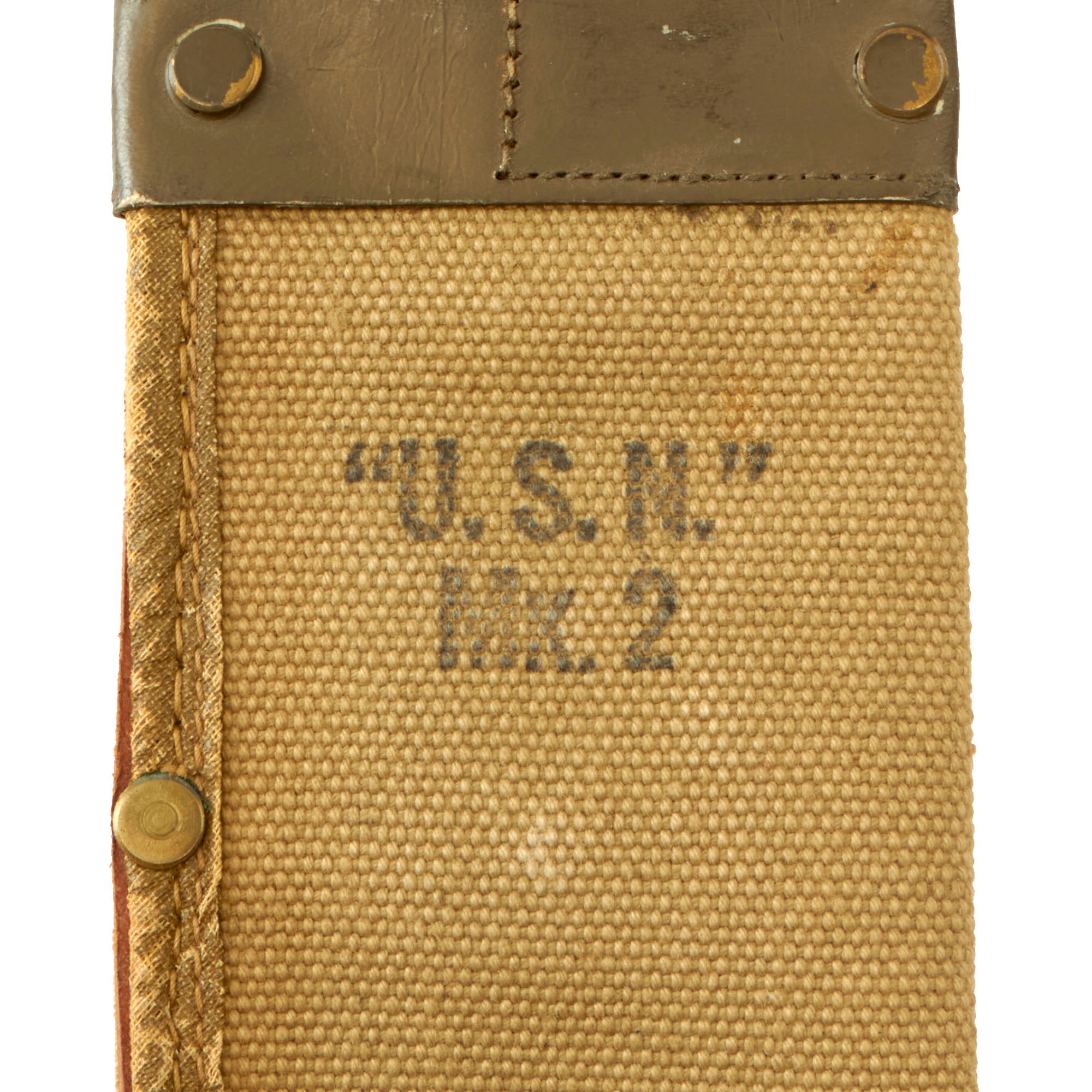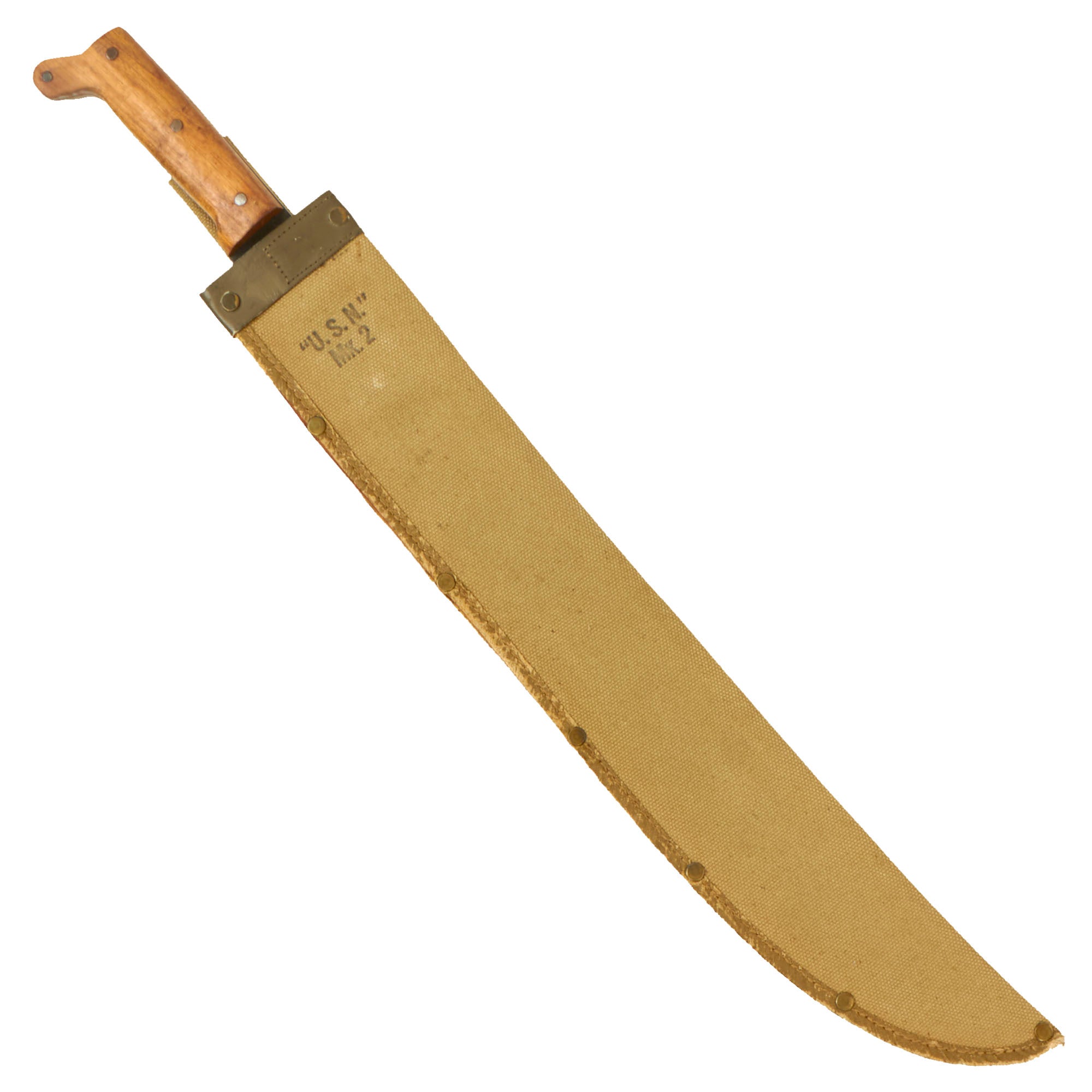 The machete comes with a very good "U.S.N." / Mk.2 marked canvas scabbard with a rawhide throat, which is in good used condition. The canvas does have staining, and it has faded a bit from service, but is still intact, with a complete belt loop.