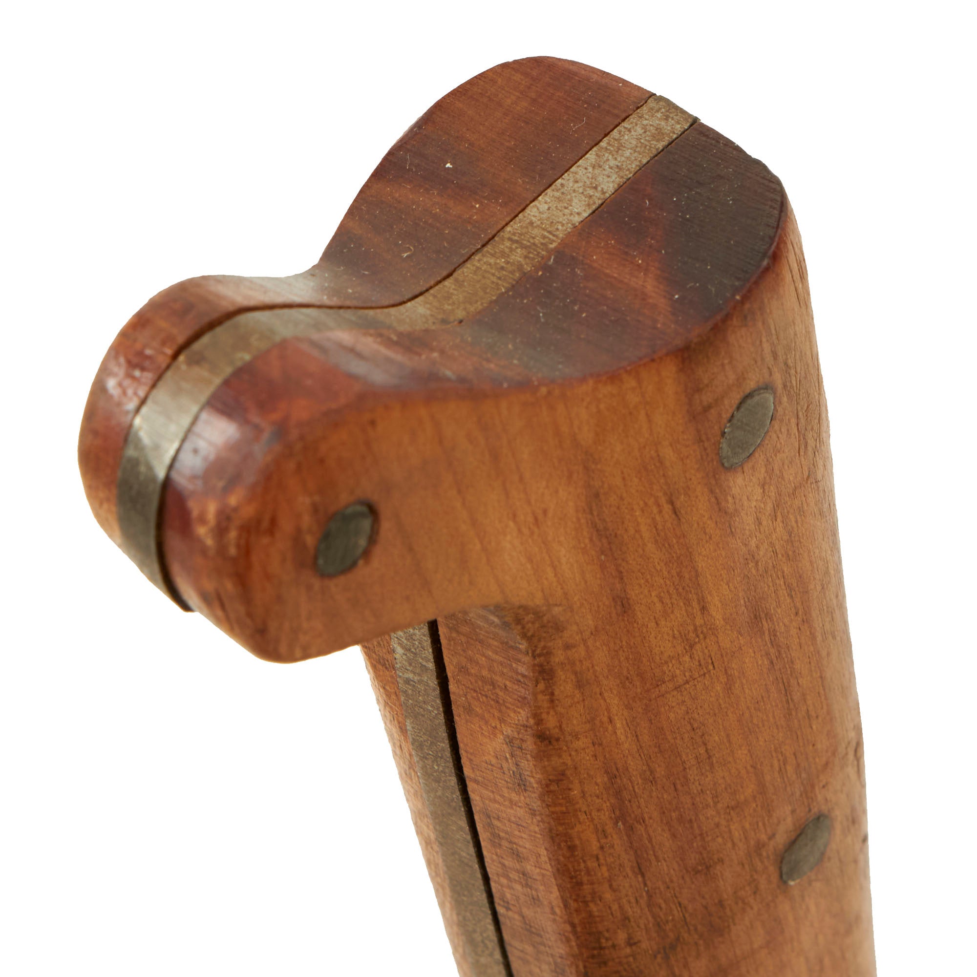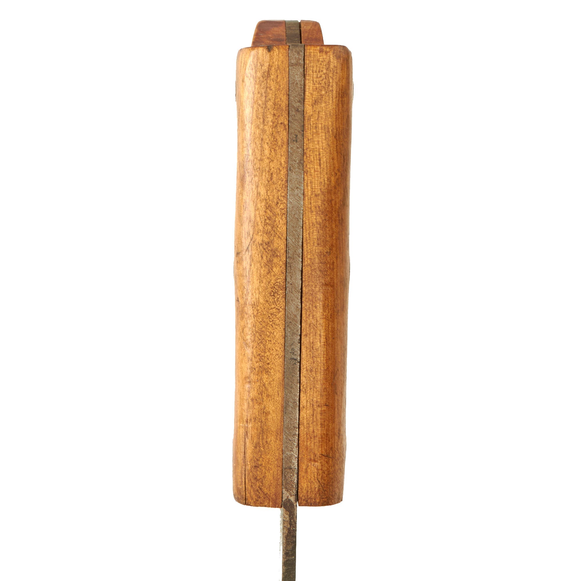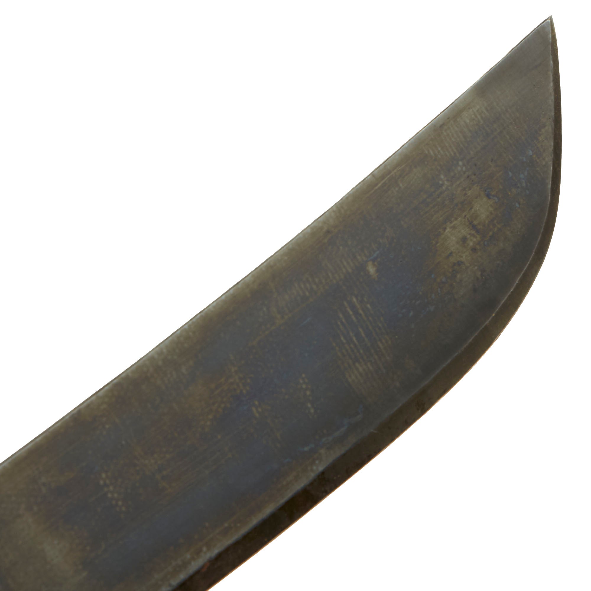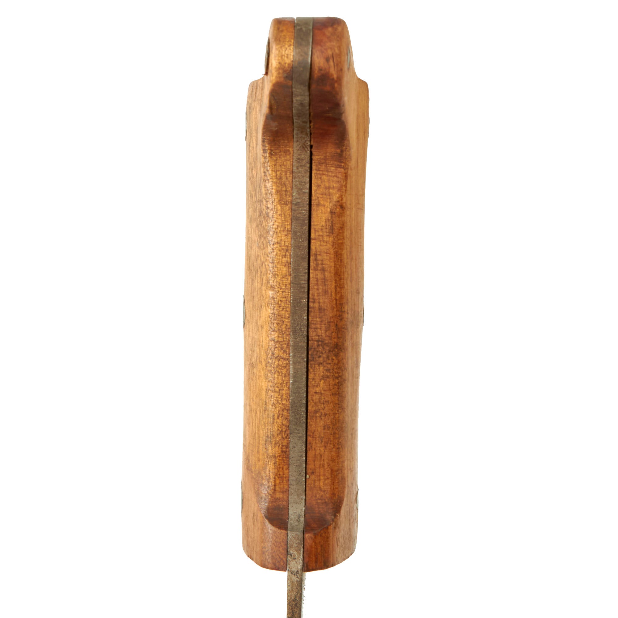 The blade is in very mint condition, with the factory bluing still fully intact. There are also some nicks and dents on the edge, and some overall light staining from age. The wooden handle is in very good shape, with no chips, cracks, or other major issues.
