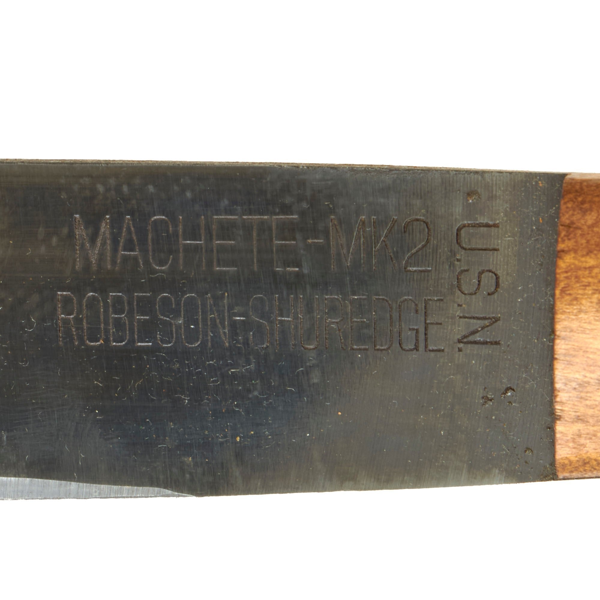 Original Items: Only one available. These long machetes are extremely rare on today's market, especially in such amazing condition, with their original scabbards. Made by Robeson-Shuredge, this is a long jungle machete. The Machete has an impressive overall length of 27 1/2 inches, with a slightly curved 22 inch Bush/Collins machete shape blade. The blade is about 2 1/4 inches wide at the thickest point. The ricasso is nicely marked: