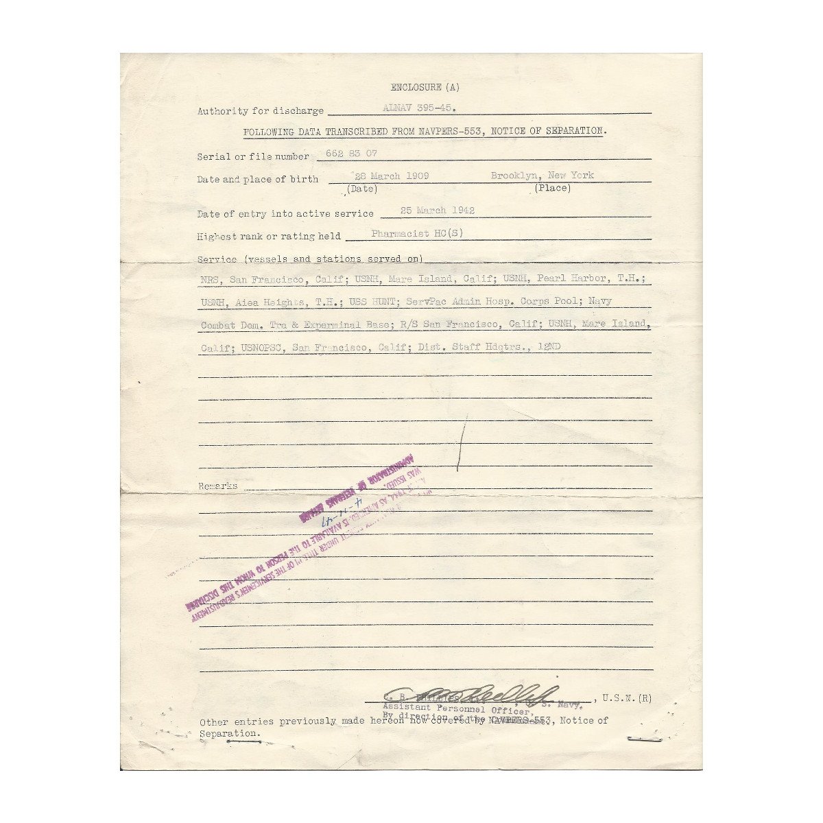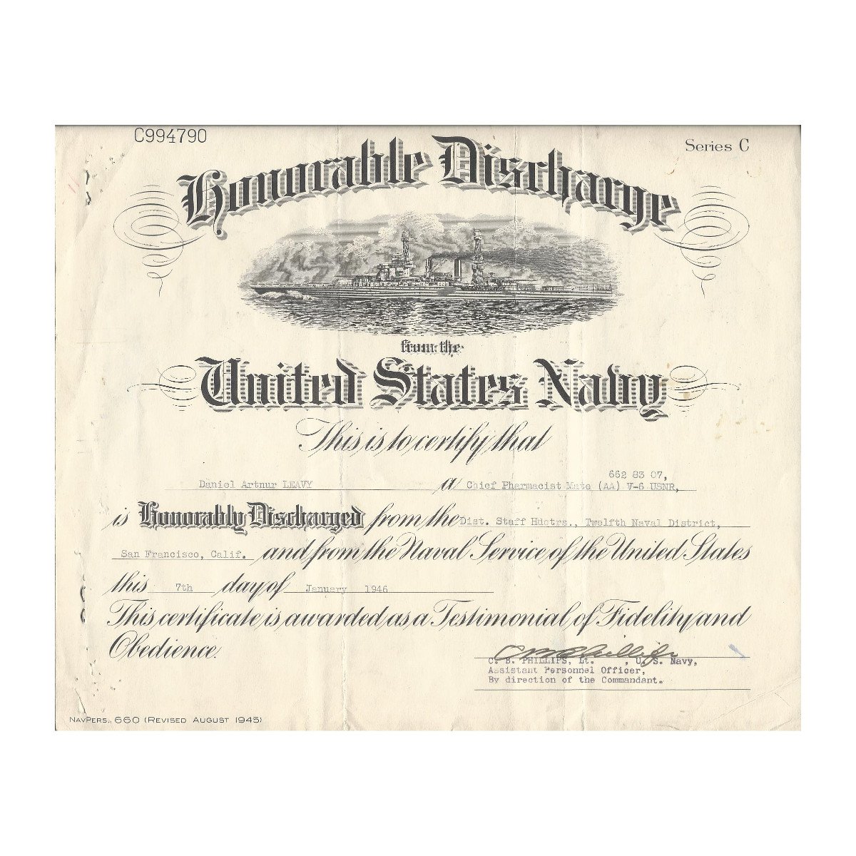 - Original Honorable Discharge dated January 1946.