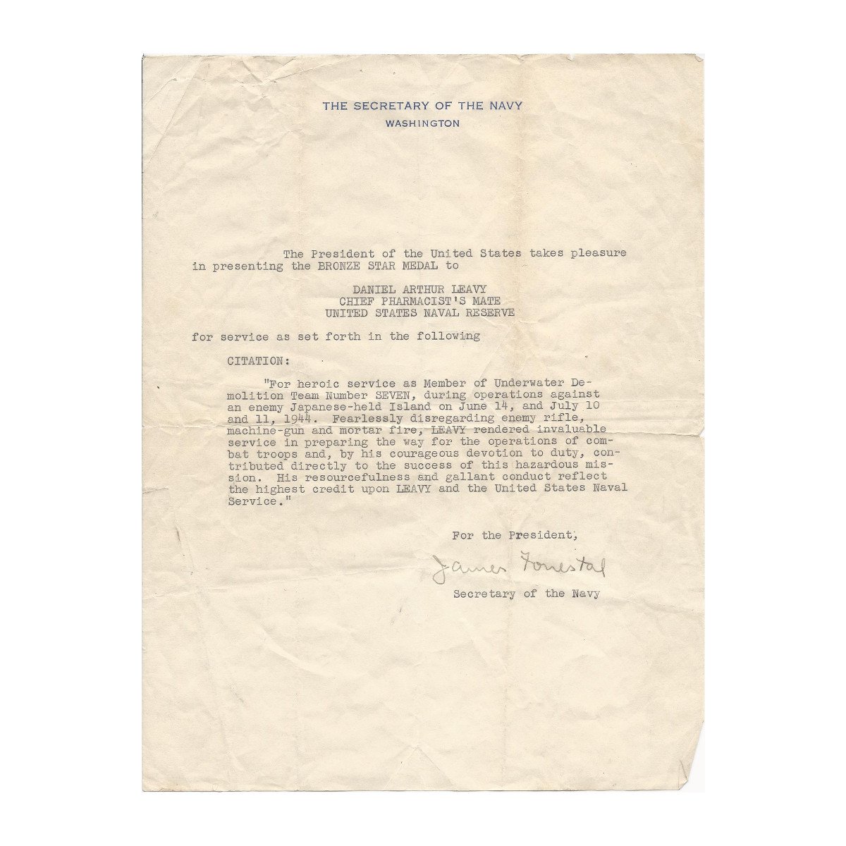 For heroic service as a Member of Underwater Demolition Team Number SEVEN, during operations against an enemy Japanese-held Island on June 14, and July 10 and 11, 1944. Fearlessly disregarding enemy rifle, machine-gun and mortar fire, LEAVY rendered invaluable service in preparing the way for for the operations of combat troops and, by his courageous devotion to duty, contributed directly to the success of this hazardous mission. His resourcefulness and gallant conduct reflect the highest credit upon LEAVY and the United States Naval Service.