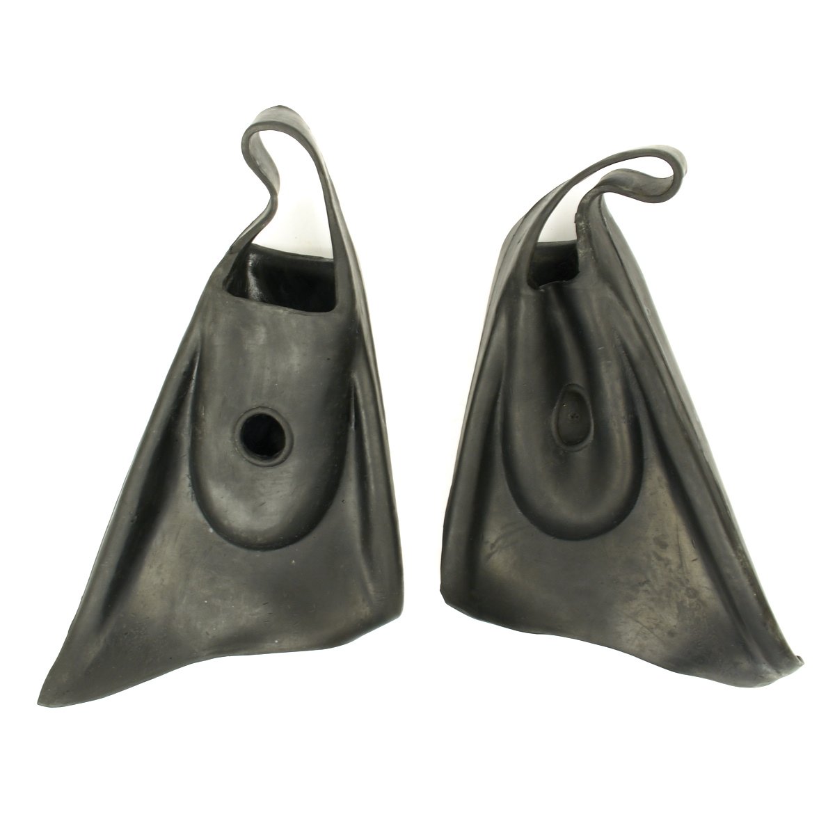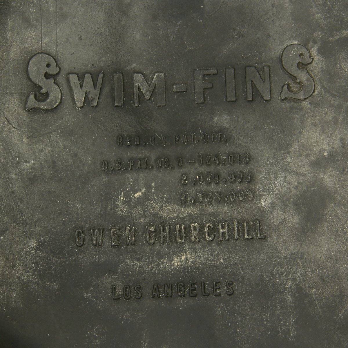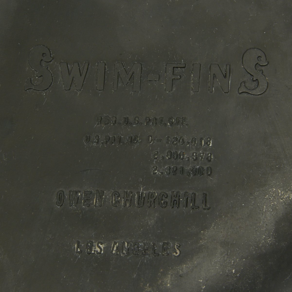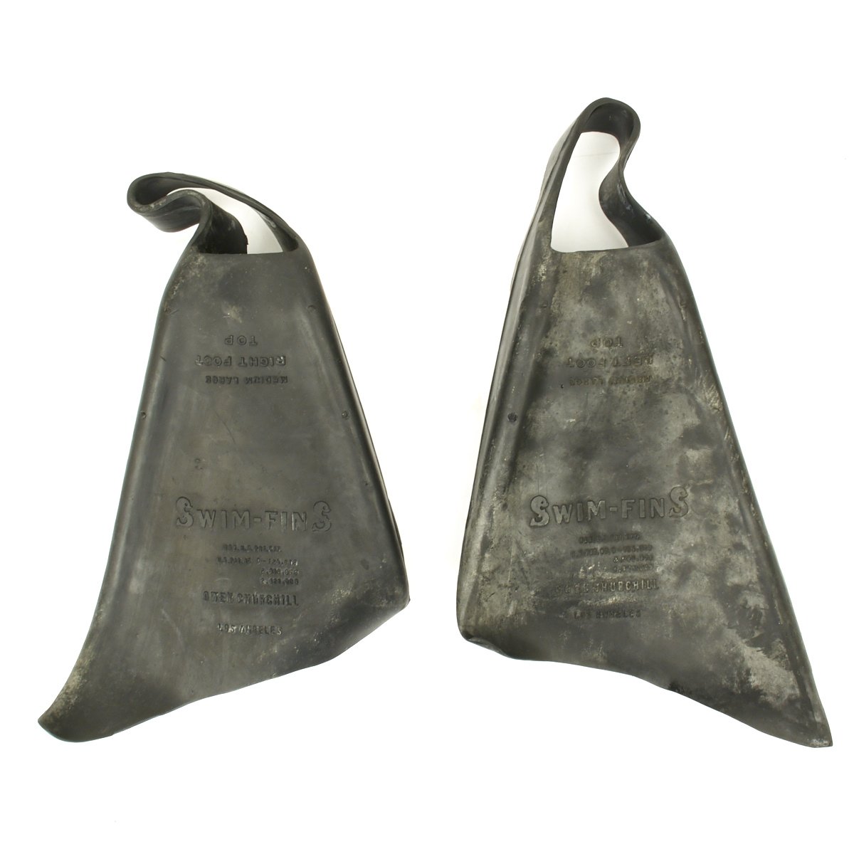 - Rubber flippers (left and right) that read OWEN CHURCHILL SWIM-FINS, Los Angeles in excellent condition.