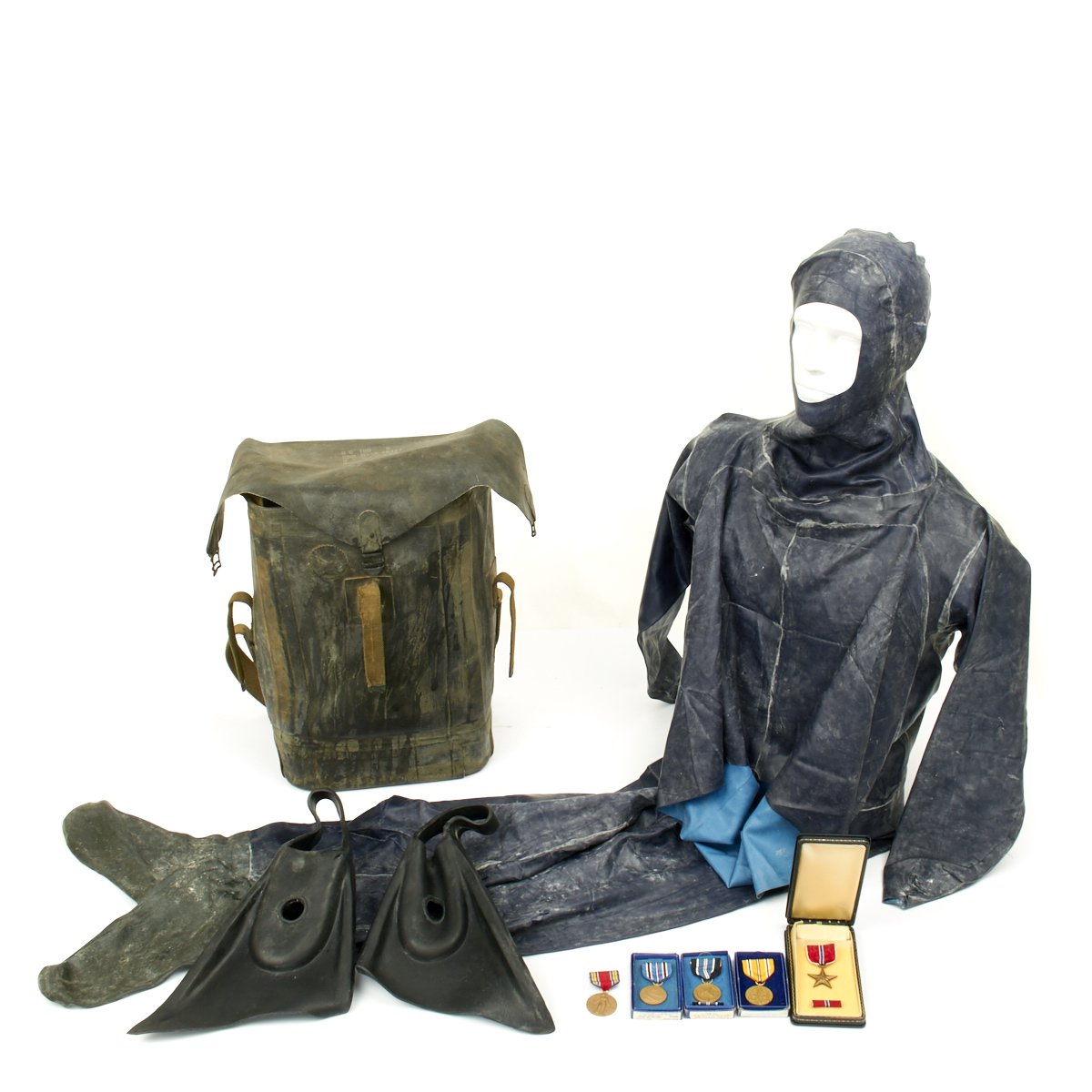 All in all, this is an exceptionally rare grouping, due to the the rarity of the wet suit and fins, the unit to which he was assigned and the Bronze Star Certificate personally signed by James Forrestal, Secretary of the Navy. An incredible piece of U.S. WWII Naval history!