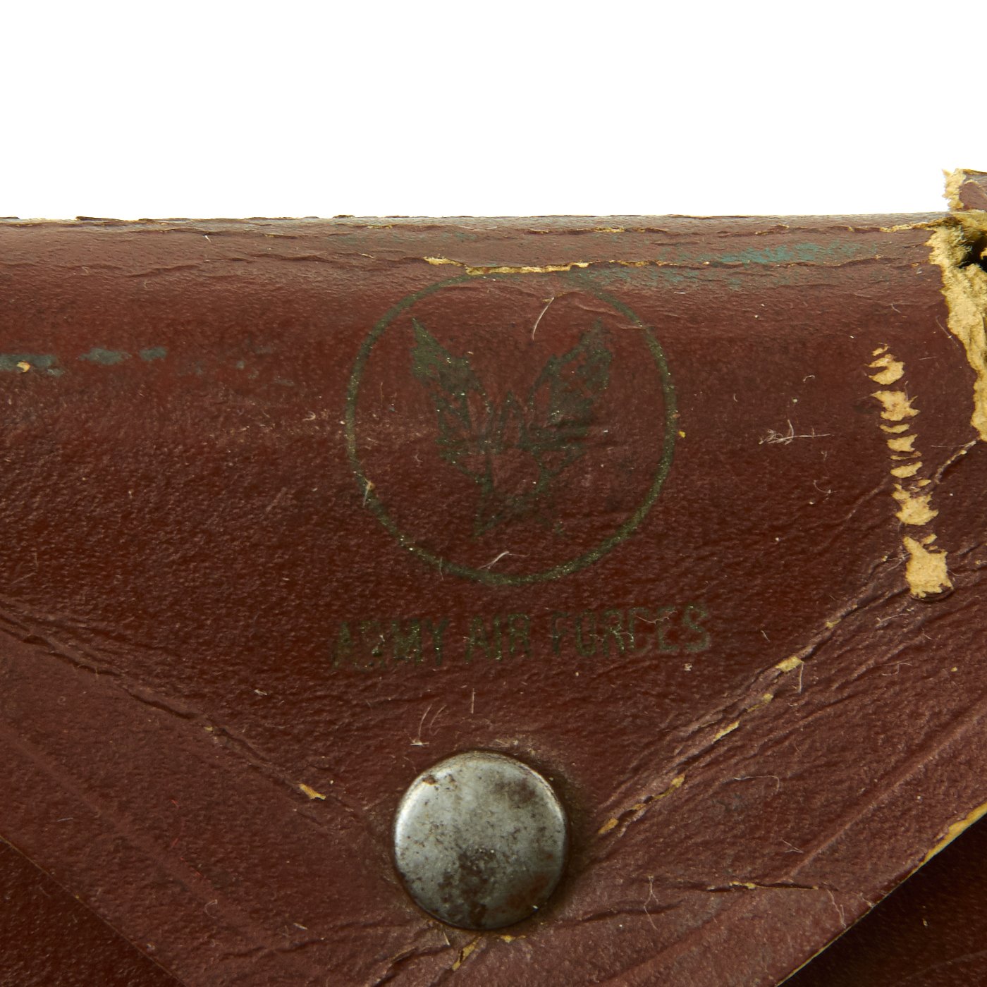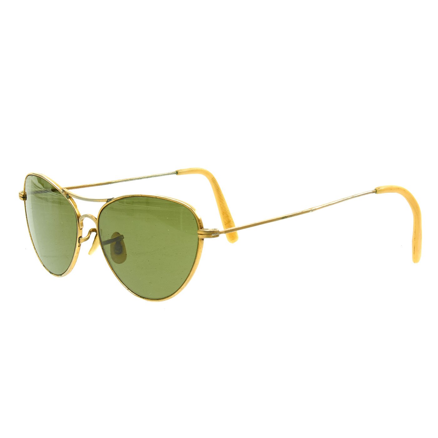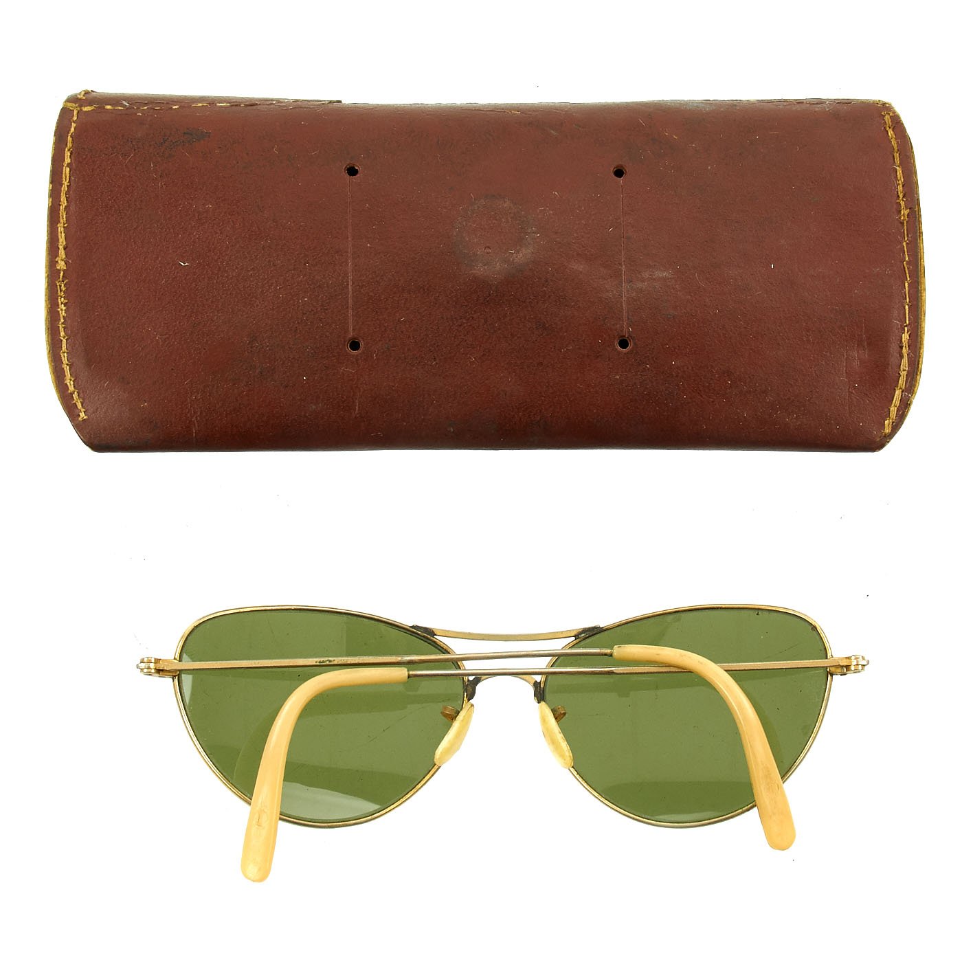 - Original Item: Only One Available. This is a fantastic seldom encountered pair of cat's eye aviator sunglasses from World War Two. They feature green glass lenses and gold wash frames. They come complete with an Army Air Forces marked fiber case with snap button closure. The case has a small area of damage to the front the gales are offered in excellent condition.