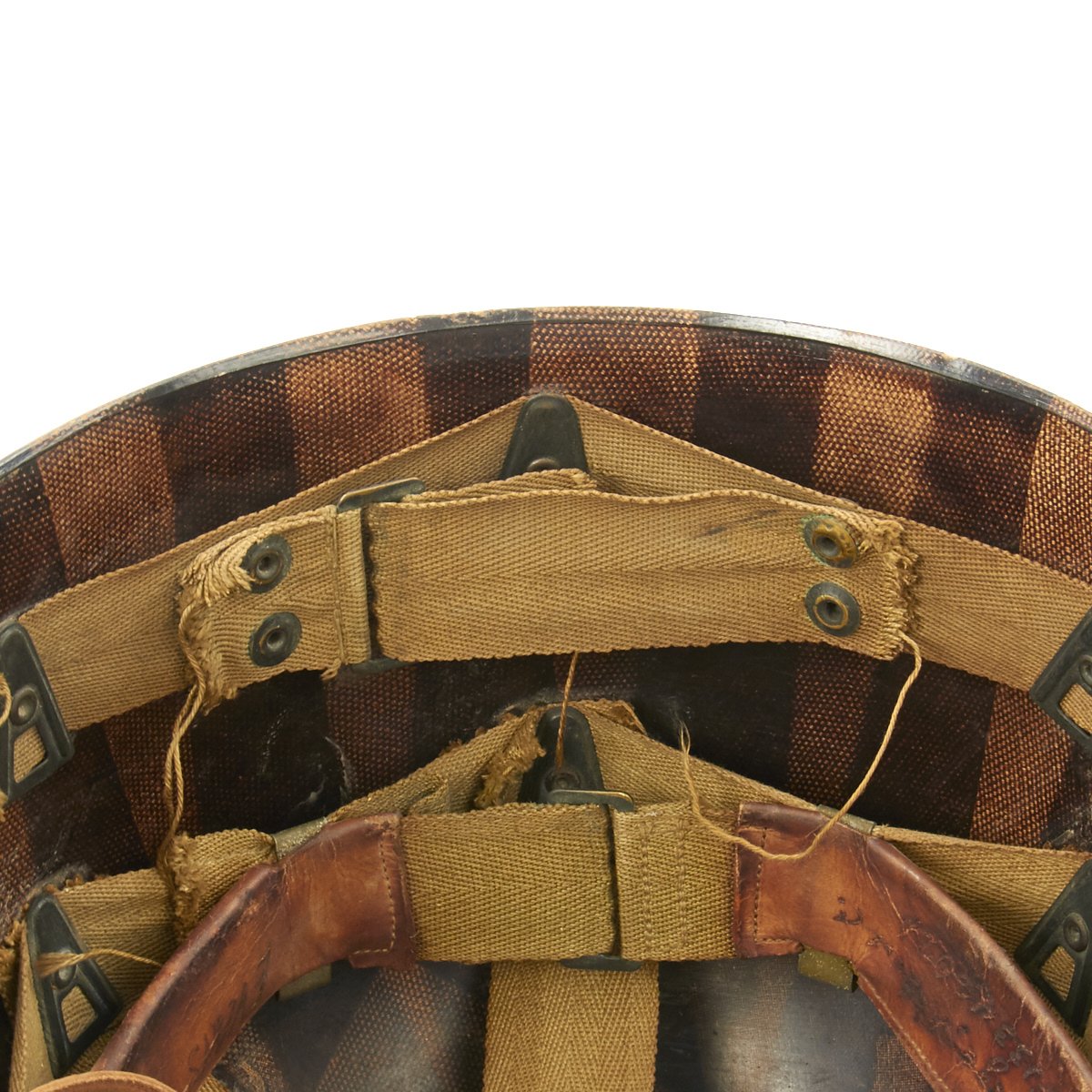 This true almost excellent condition US WWII M-1 helmet liner be identified through the frontal eyelet hole. Other correct WW2 features include cotton herringbone twill (HBT) cloth suspension dated 1943. This HBT suspension is held tightly within the M-1 helmet liner by rivets and a series of triangular "A" washers. The three upper suspension bands are joined together with a shoestring. This way the wearer could adjust the fit.