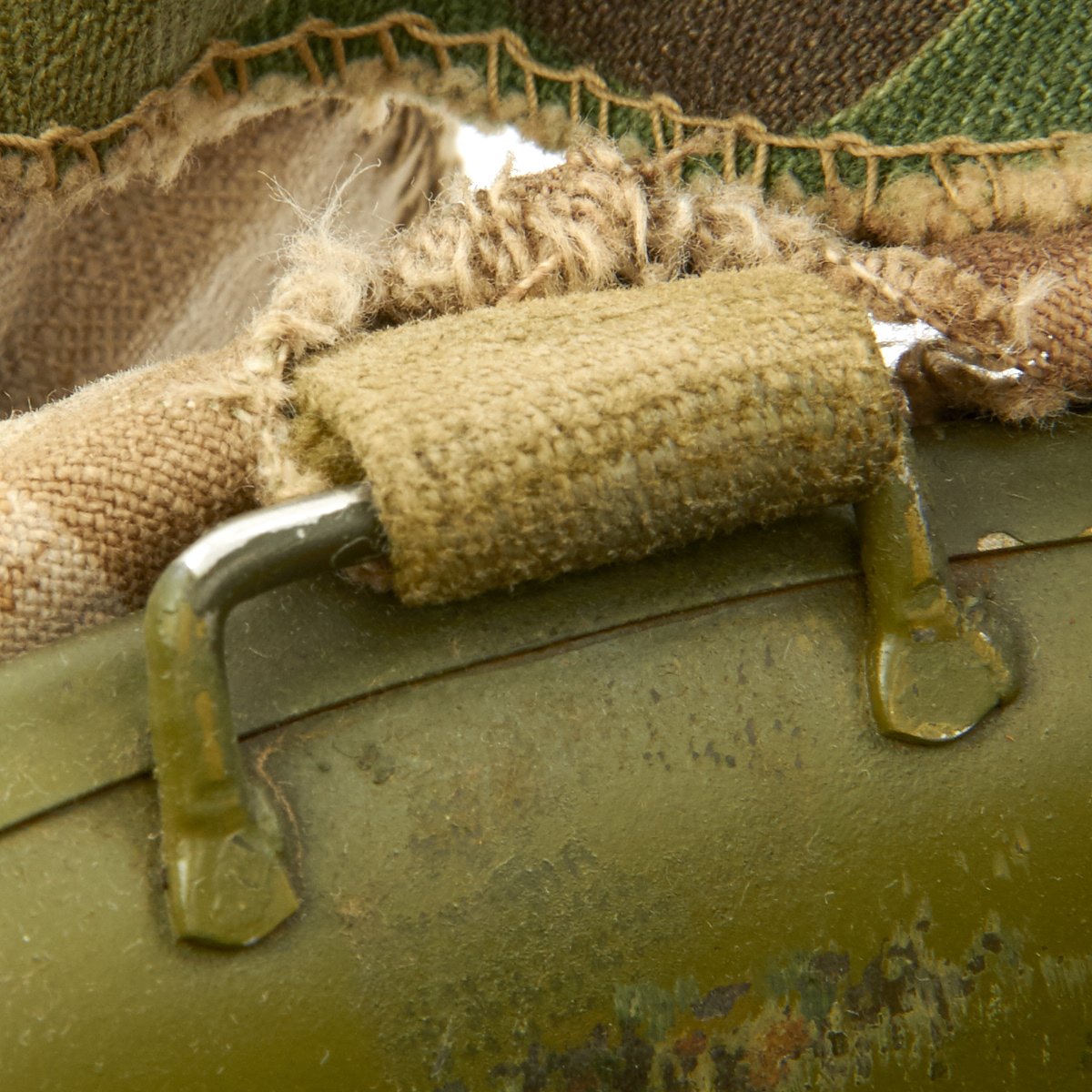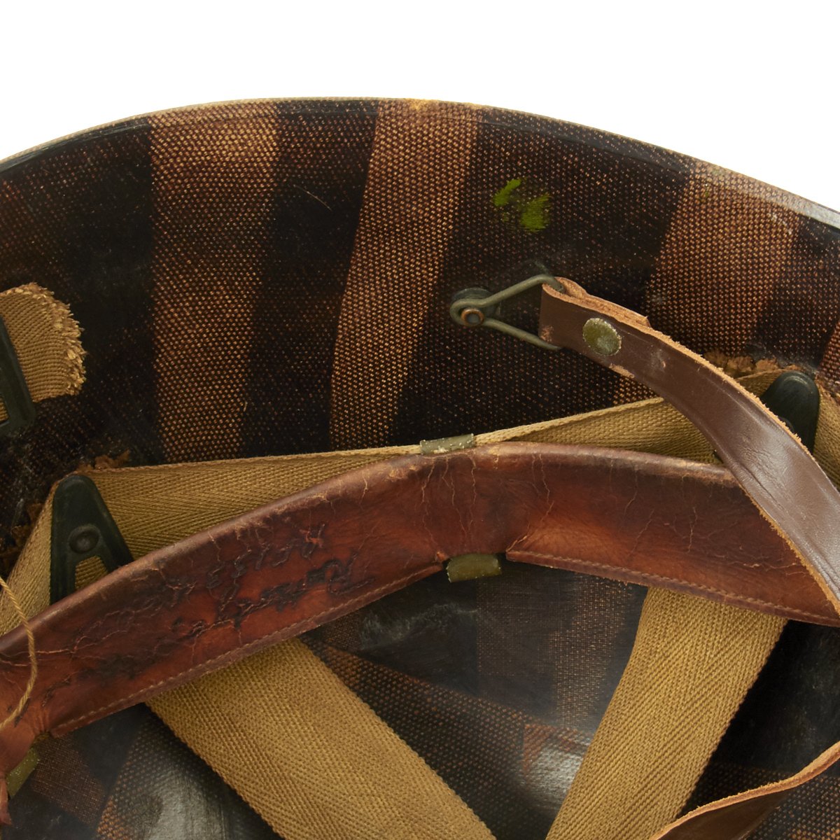 Manufactured in Pittsburgh, Pennsylvania this “high pressure” manufactured M-1 helmet liner is identified by an embossed MSA in the crown. Mine Safety Appliance started M-1 helmet liner delivery to the US Army in September 1942. They produced approximately between 2,000,000 – 4,000,000 M-1 helmet liners and discontinued production around August 17, 1945 when the war ended.