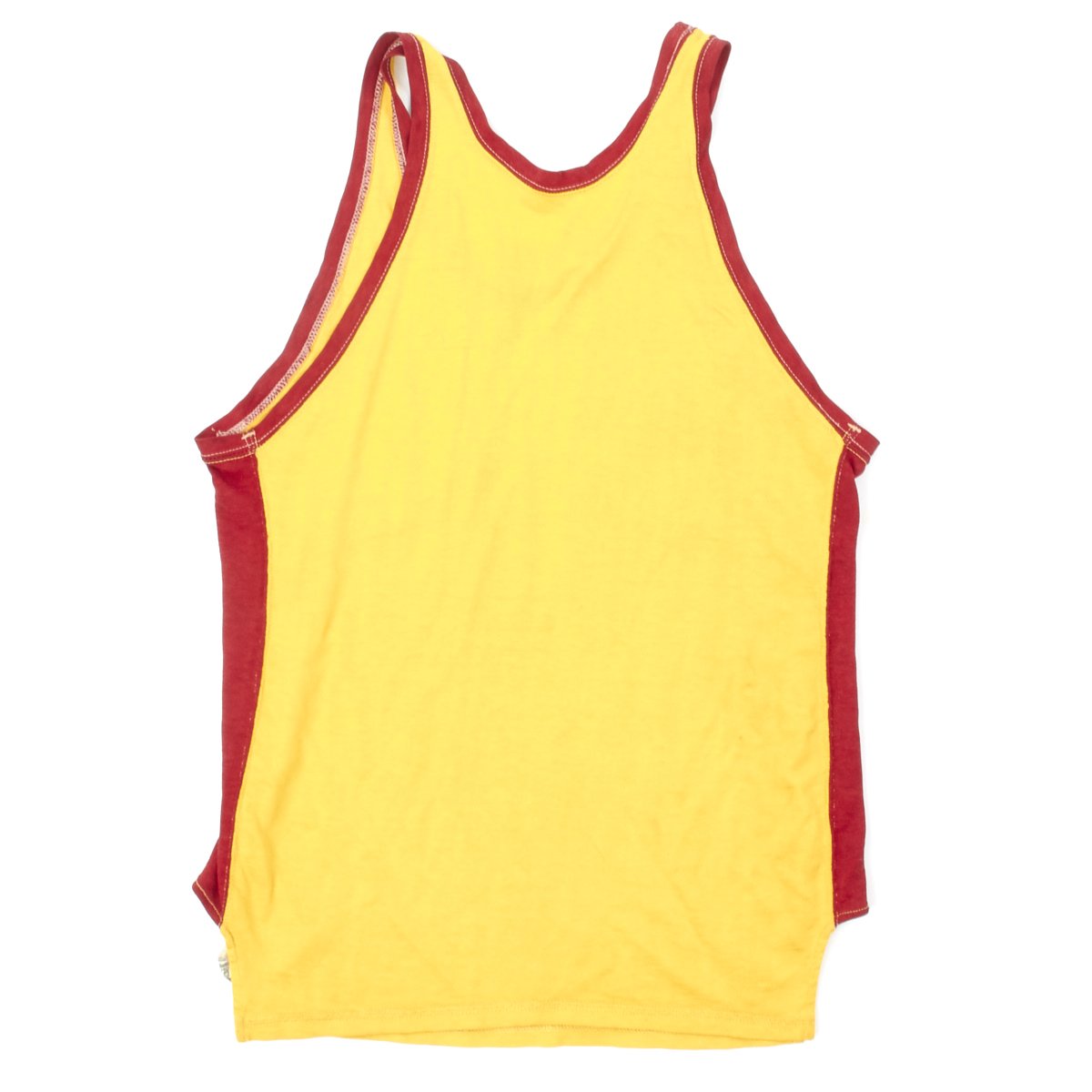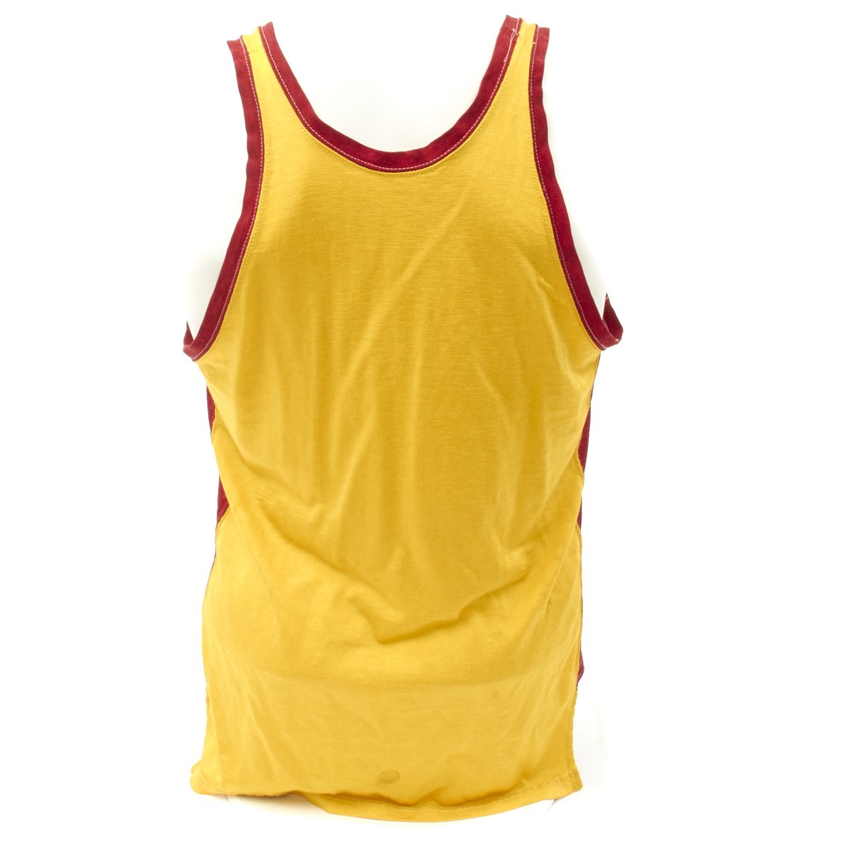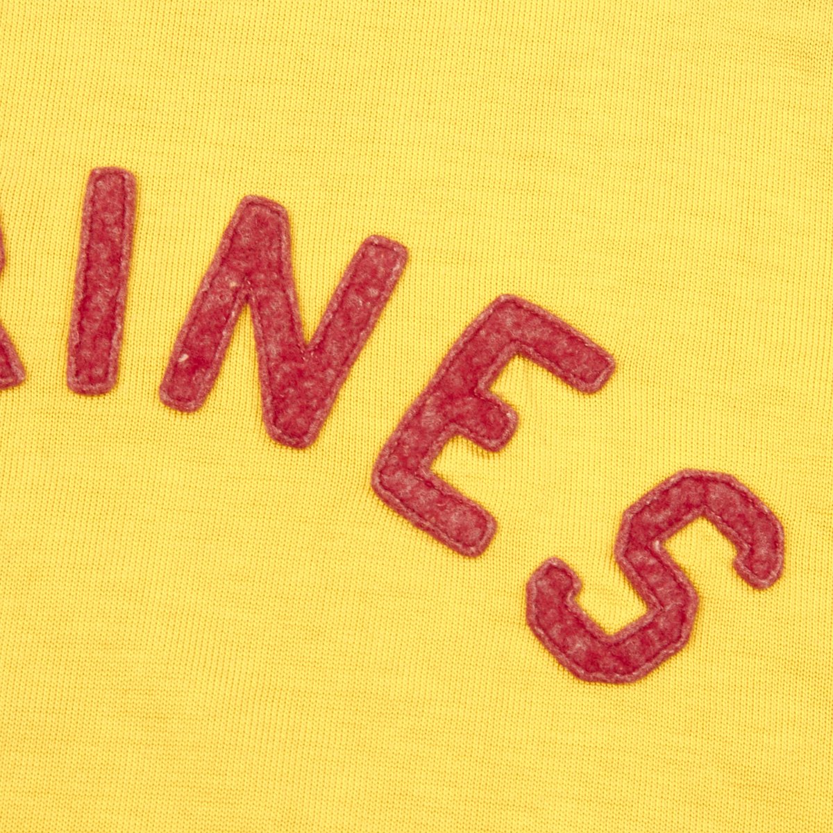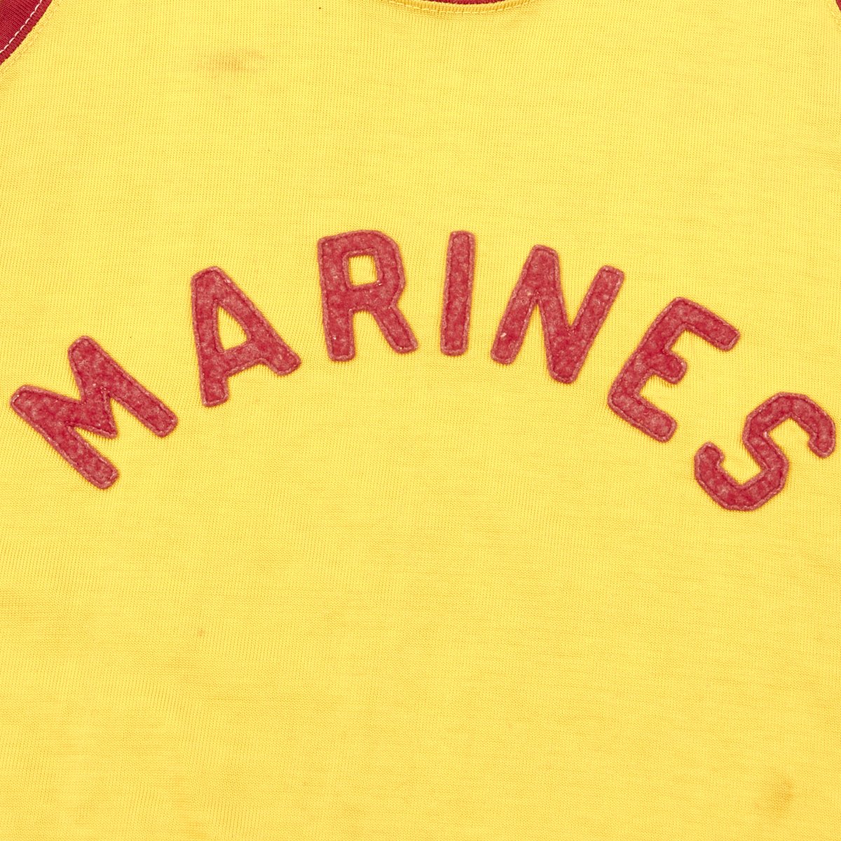 This is a size 40 WW2 Marine Corps basketball jersey with stitched on red letters that read: MARINES. The jersey features red borders and yellow base. Overall condition is very good.