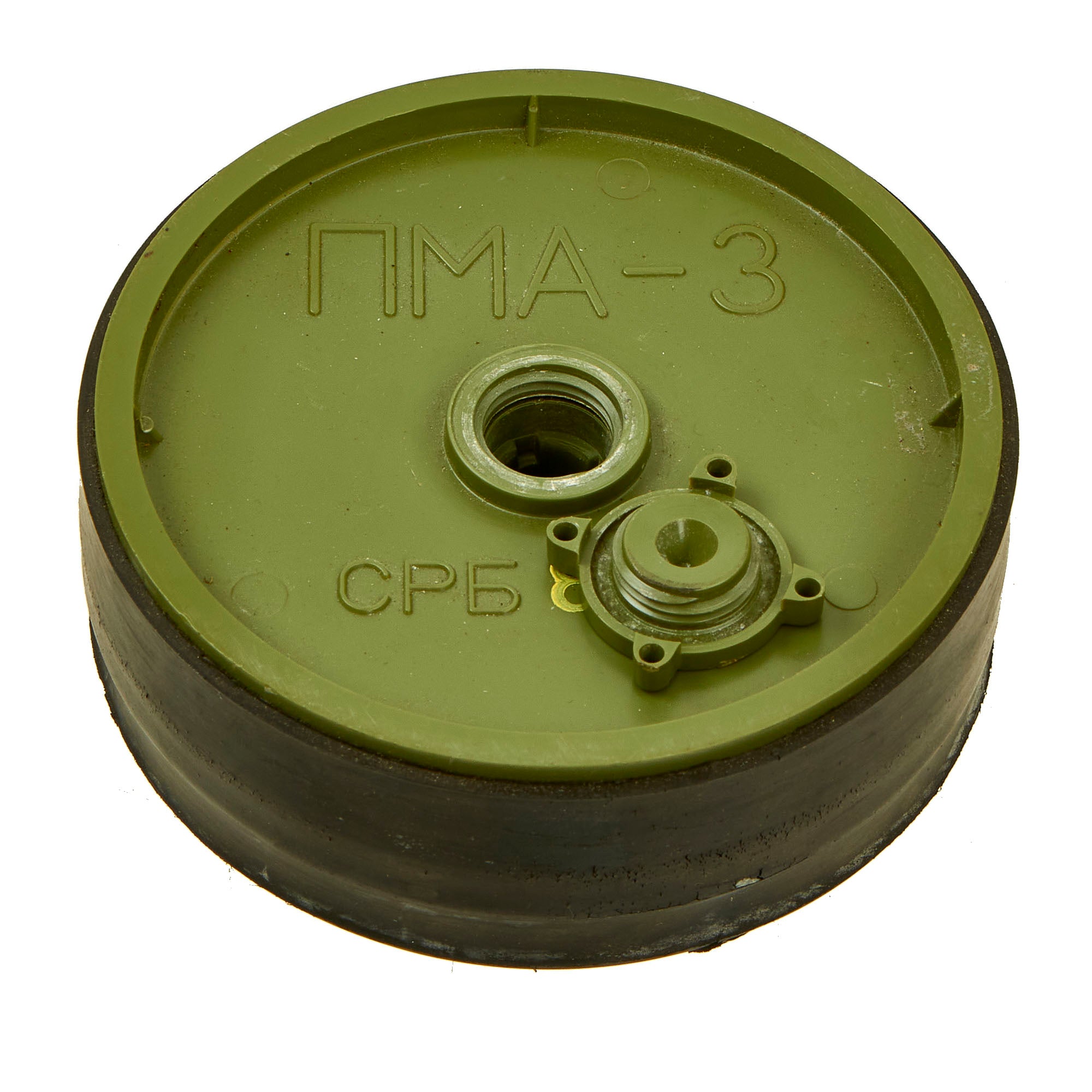 The PMA-3 is a Yugoslavian blast resistant minimum metal anti-personnel mine. It is circular, consisting of a plastic upper and lower half joined together by a rubber cover. A safety collar is normally wrapped around the outside of the mine, preventing the upper half of the mine tilting when in transit. Once deployed the safety collar is removed. Sufficient pressure on the top surface of the mine causes it to tilt. The tilting drives a pin through a friction sensitive pyrotechnic compound, which fires the detonator and then the main explosive charge.