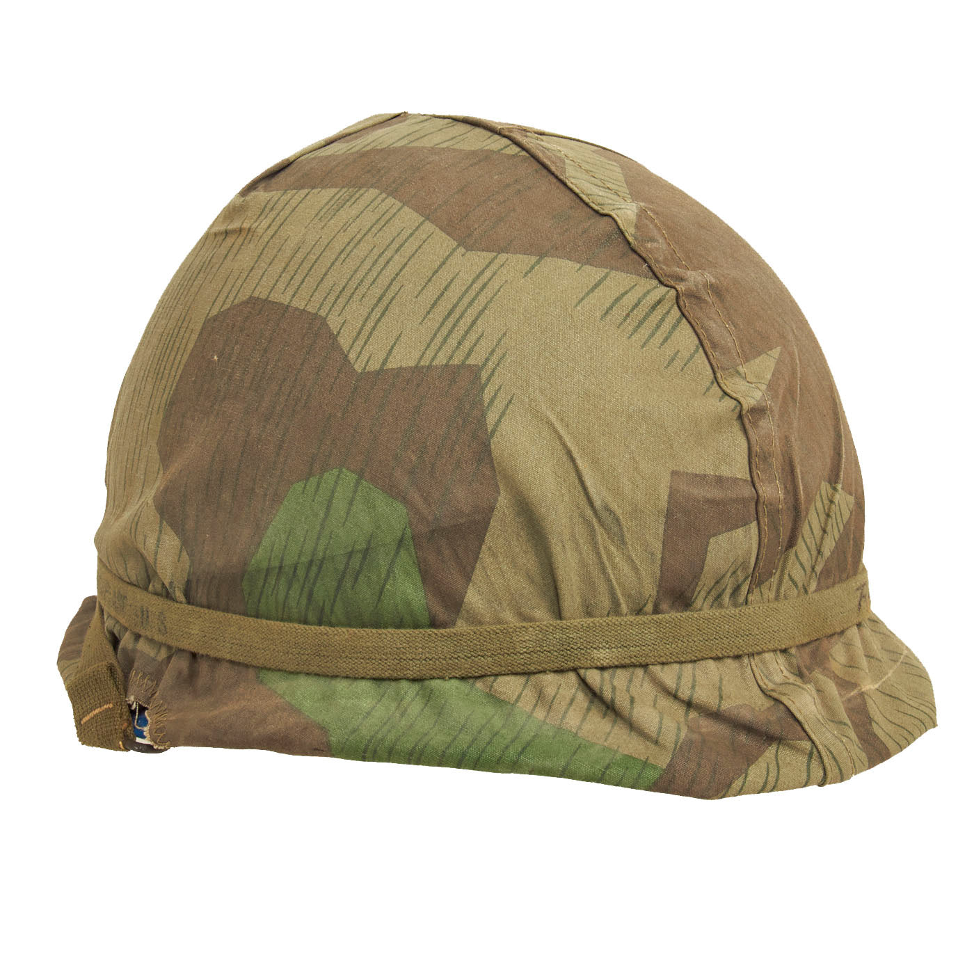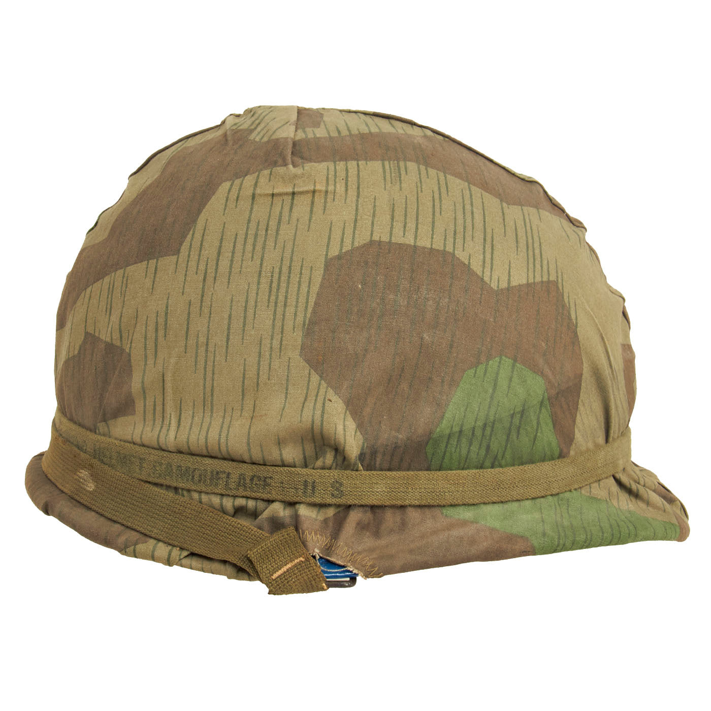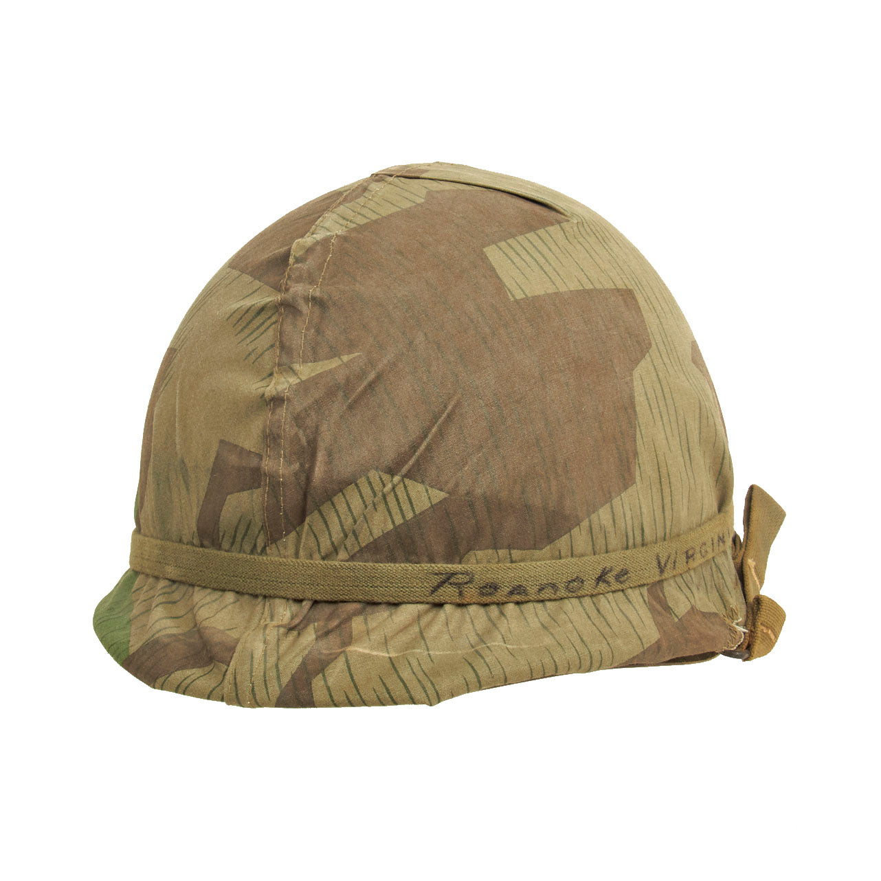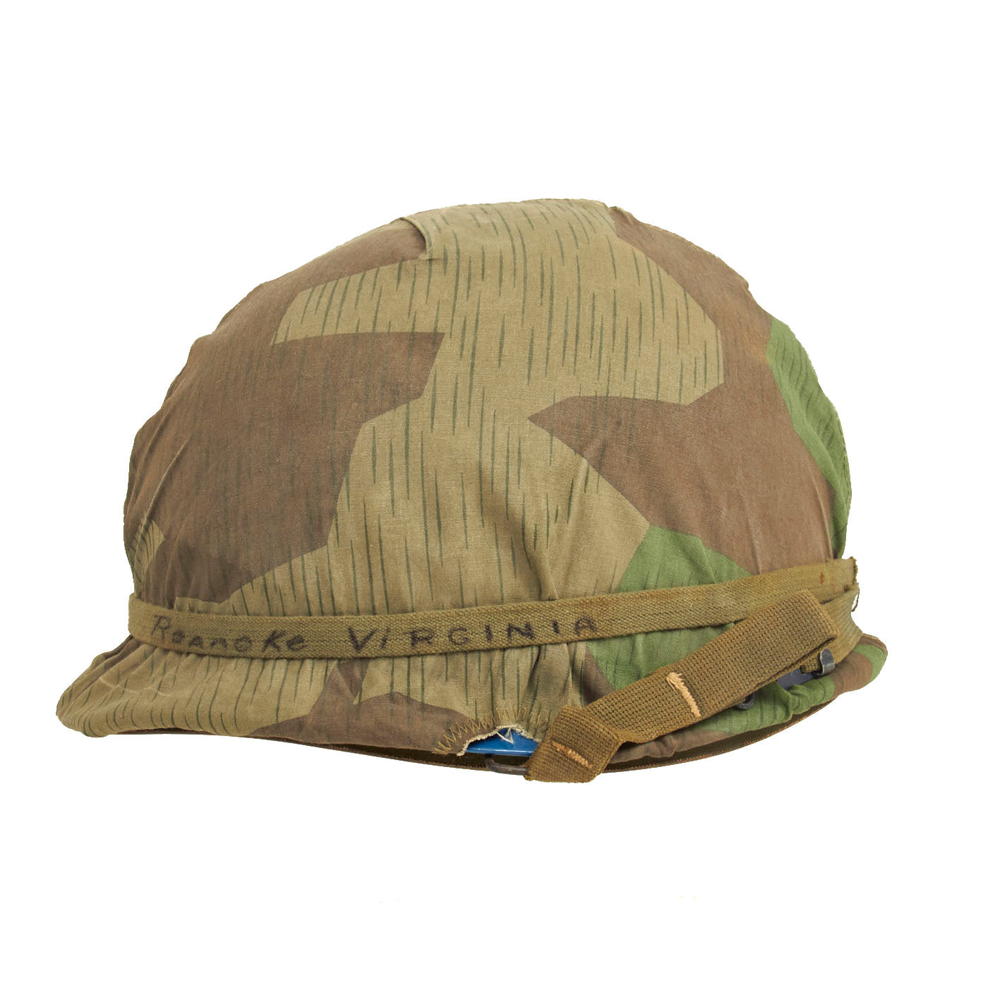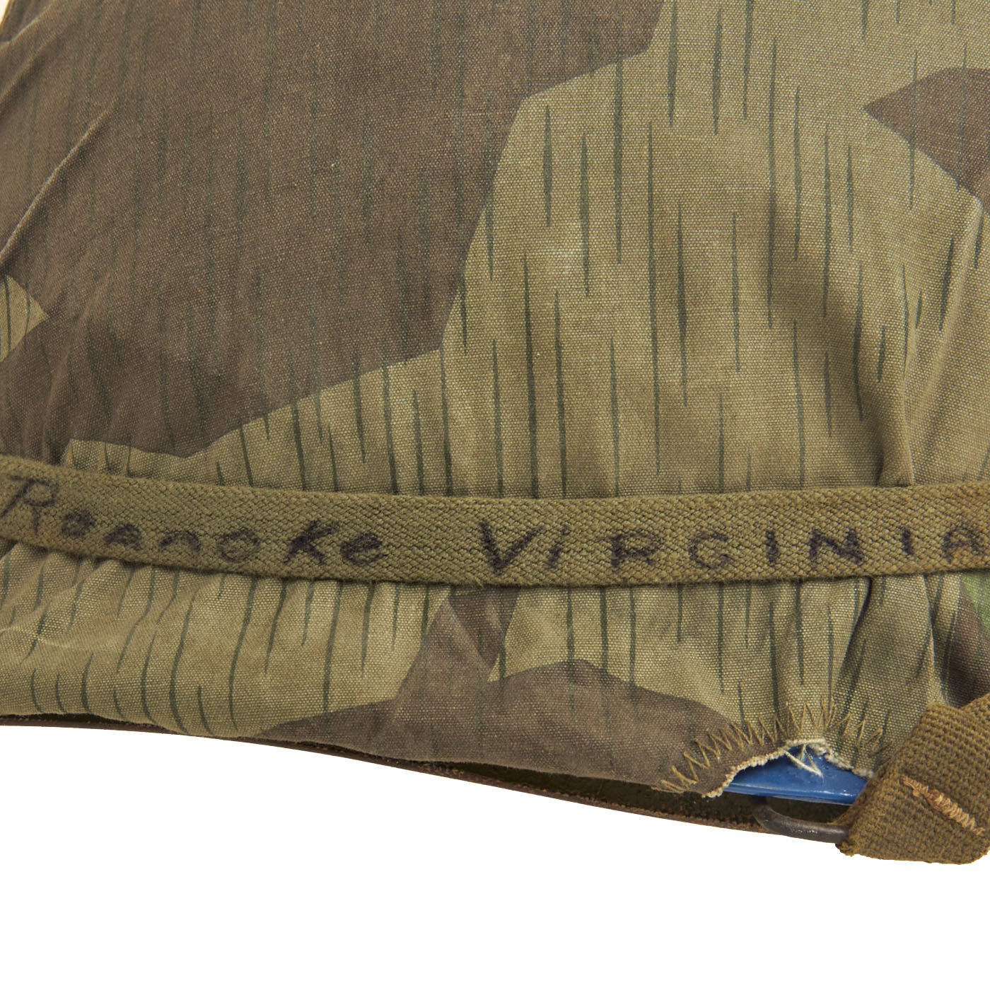The cover itself is well made, with the cut pattern being made to approximate the design features of the US designed helmet covers of the period. The cover likely was tailored from salvaged material, either uniforms or old WWII vintage Zeltbahns. The cover shows honest signs of wear and age. Fitted to the exterior of the cover is an early U.S. Army issue elastic camouflage helmet band. The original owner wrote his hometown on the band “Roanoke, Virginia”, which adds a unique juxtaposition to the German Spinter Camouflage Cover when displayed.