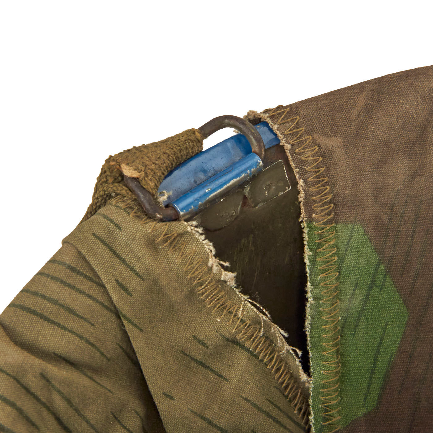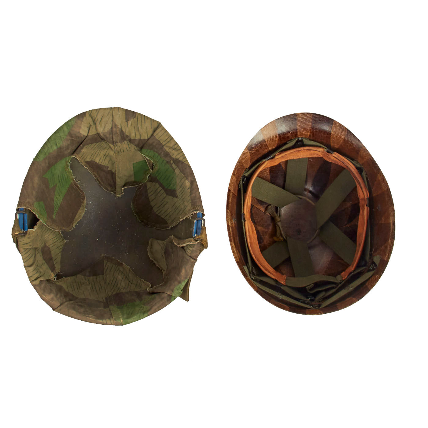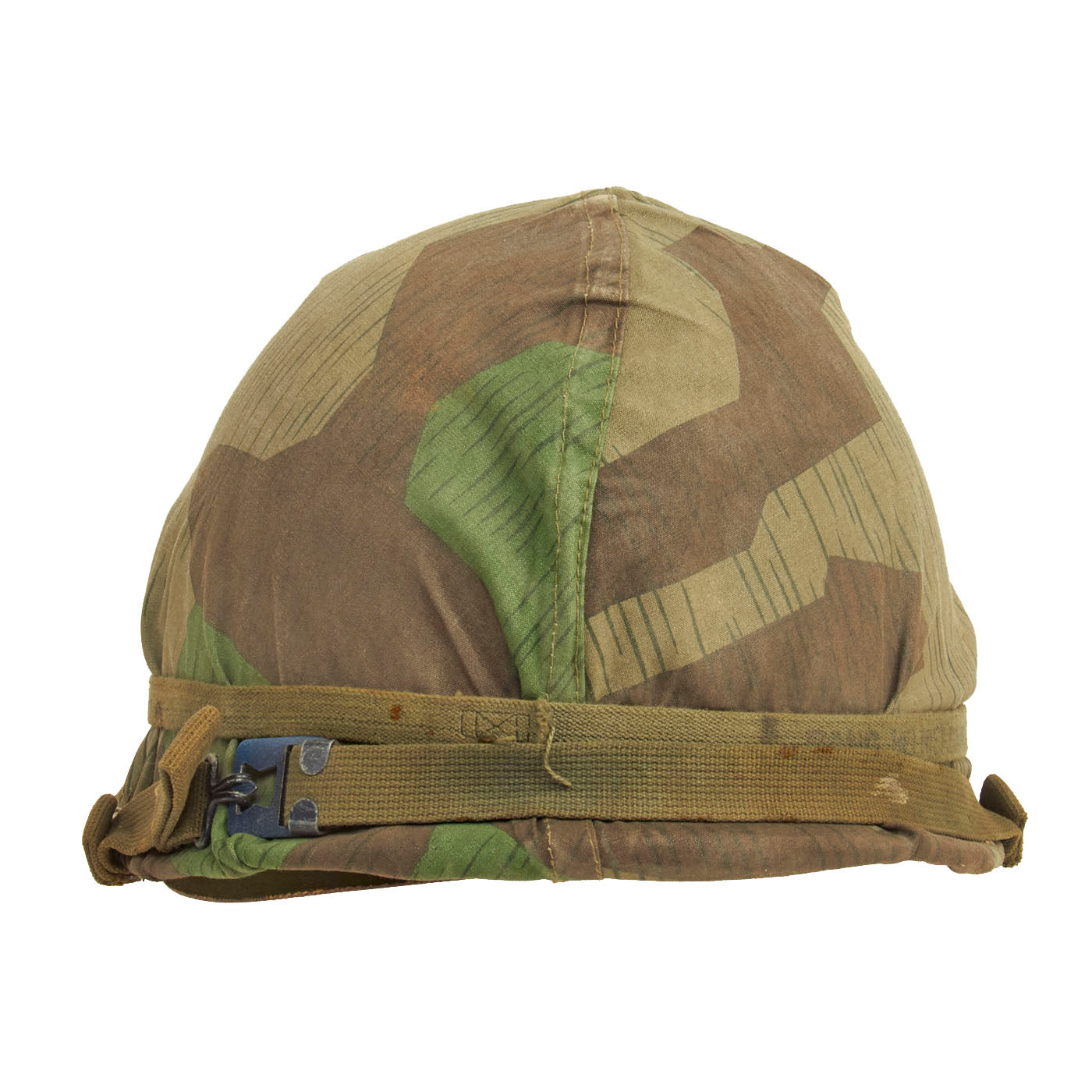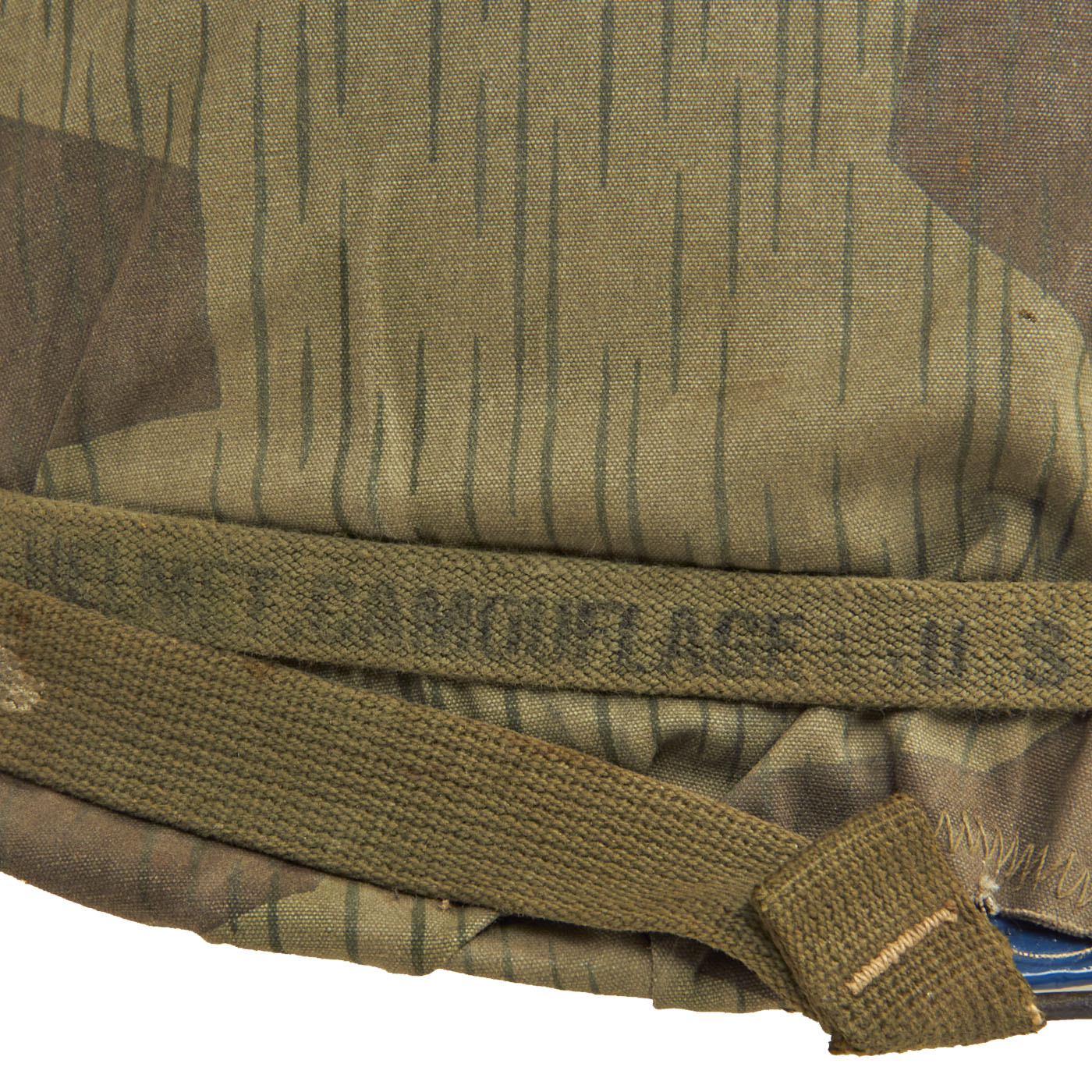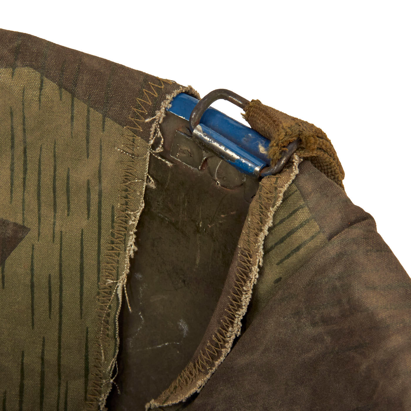 The cover itself is well made, with the cut pattern being made to approximate the design features of the US designed helmet covers of the period. The cover likely was tailored from salvaged material, either uniforms or old WWII vintage Zeltbahns. The cover shows honest signs of wear and age. Fitted to the exterior of the cover is an early U.S. Army issue elastic camouflage helmet band. The original owner wrote his hometown on the band “Roanoke, Virginia”, which adds a unique juxtaposition to the German Spinter Camouflage Cover when displayed.