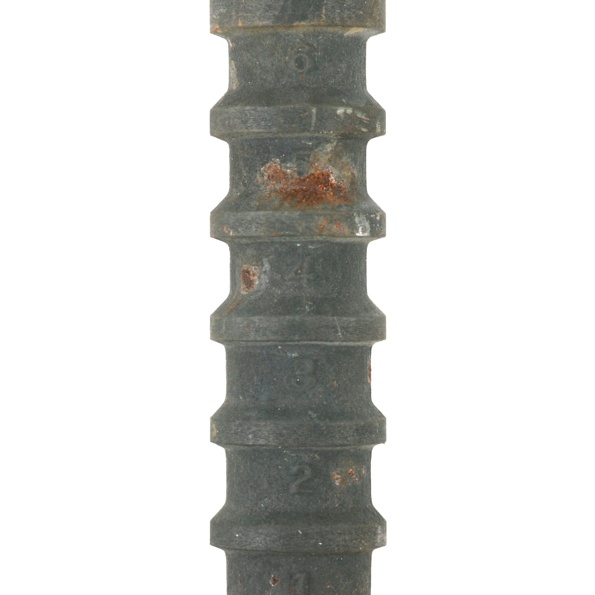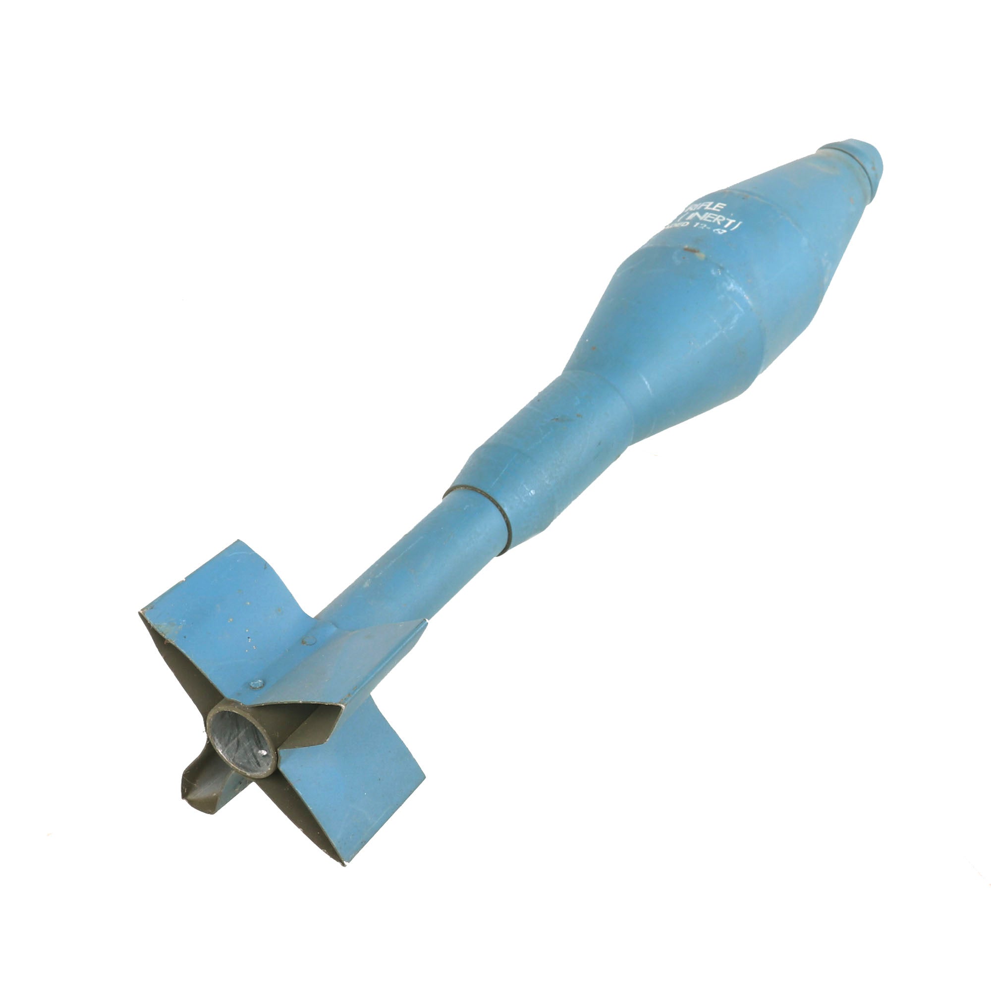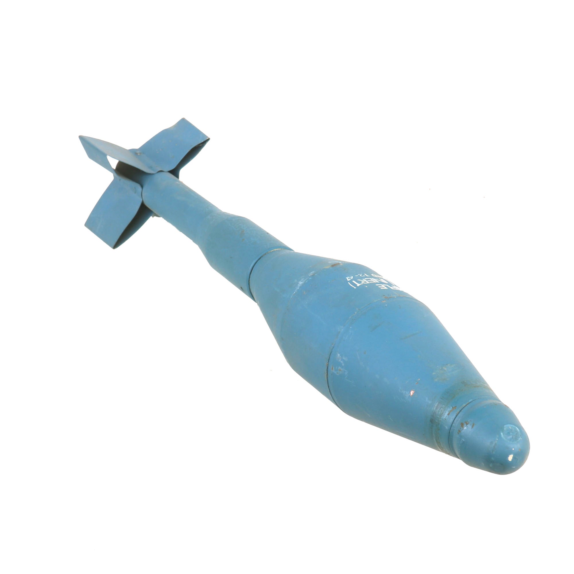 The practice grenade measures roughly 16½” long, and the launcher measures roughly 10½” long on its own. The launcher itself has been filled and cannot be used. The fins of the launcher are a bit misshapen but can be fixed. The launcher can be inserted into the end of the practice grenade but takes some force to insert & remove. The practice round is stamped:
