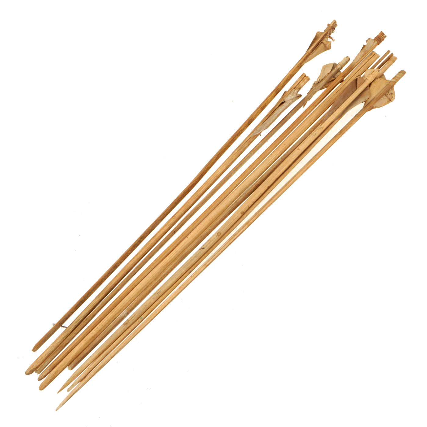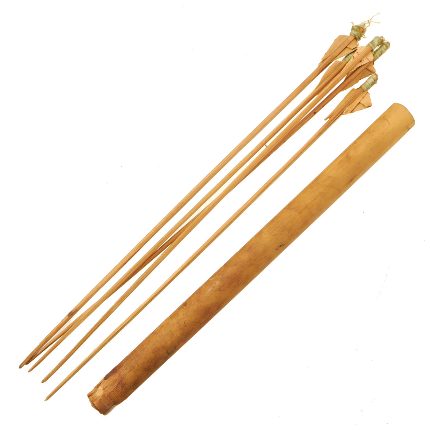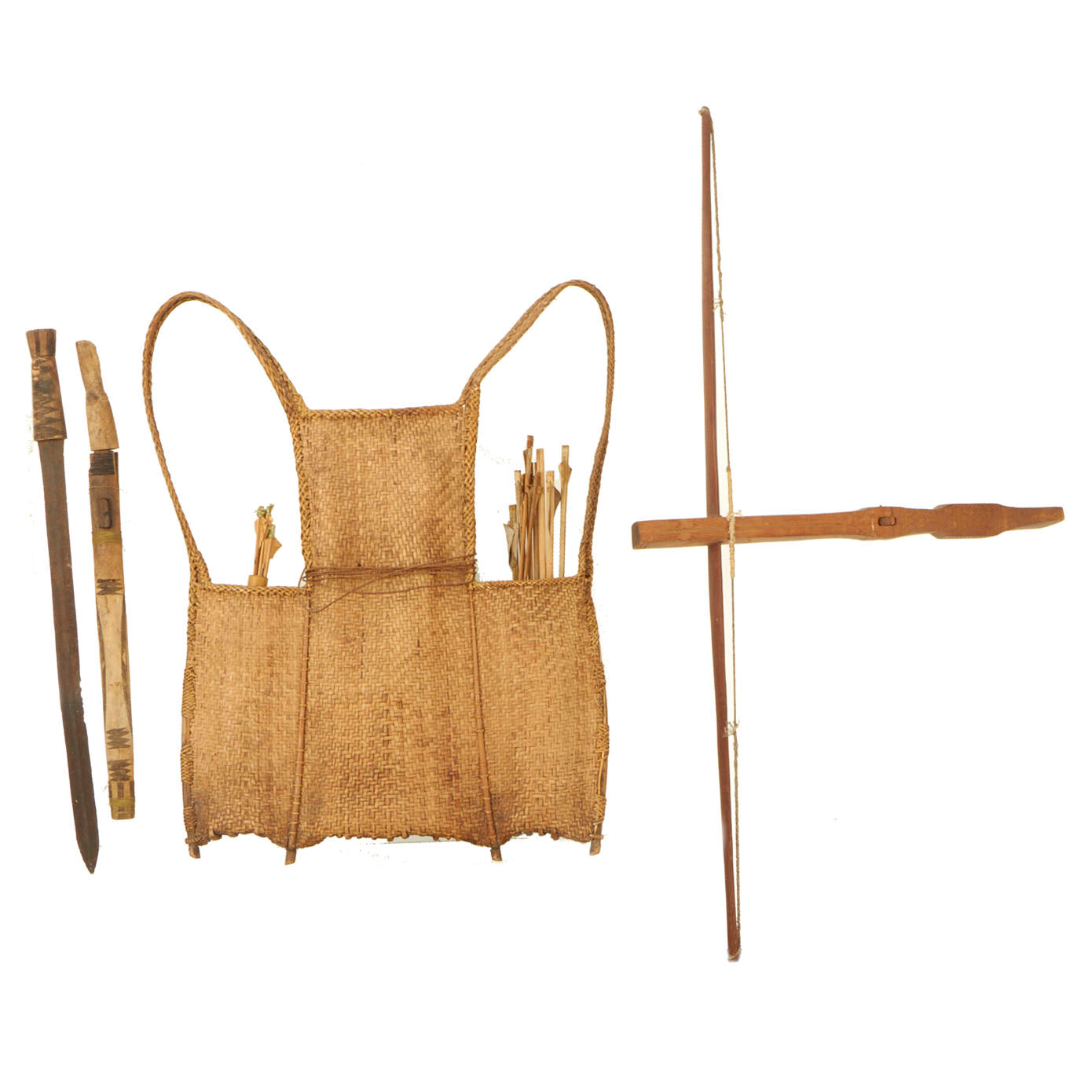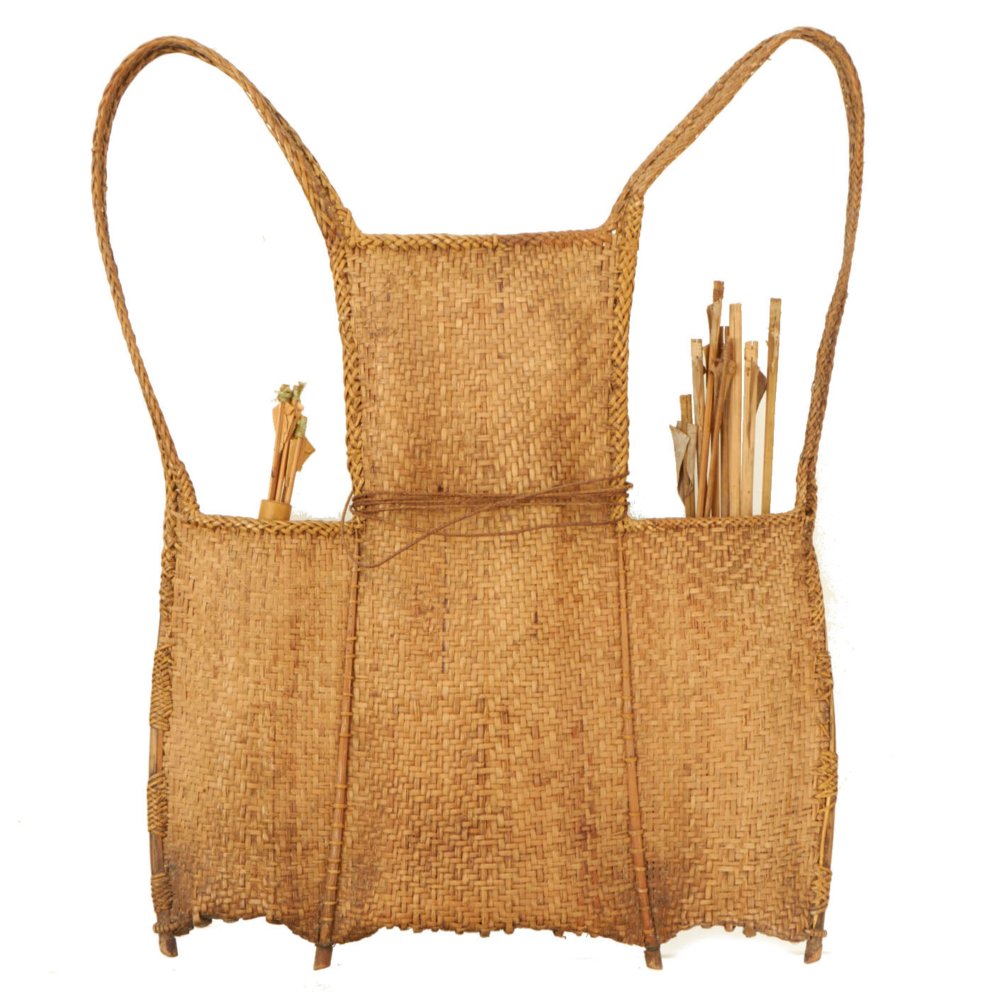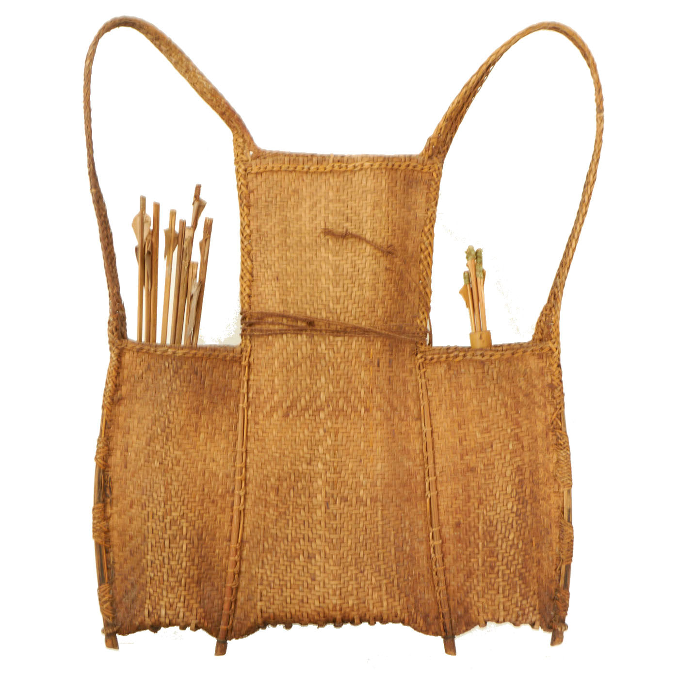 -Scarce Hmong Hunting Vest constructed of woven reeds. The vest is intended to be worn on the front of the wearer (of the back depending on preference). The vest consists of three pockets (One large center pocket, and two smaller side pockets). The vest has two shoulder straps, and a length of handwoven crude multipurpose twine which has been wrapped around the main pocket of the vest for a very long time. In the smaller pockets of the vest, which appear to have been used as quivers, are arrows; Nine Long Arrows in one side (ranging from 13”-16” each in length), and on the other side a bamboo quiver containing five short arrows (approximately 12” long each). The vest overall is in excellent condition for its age, with the expected wear from honest period use, and decades in storage.