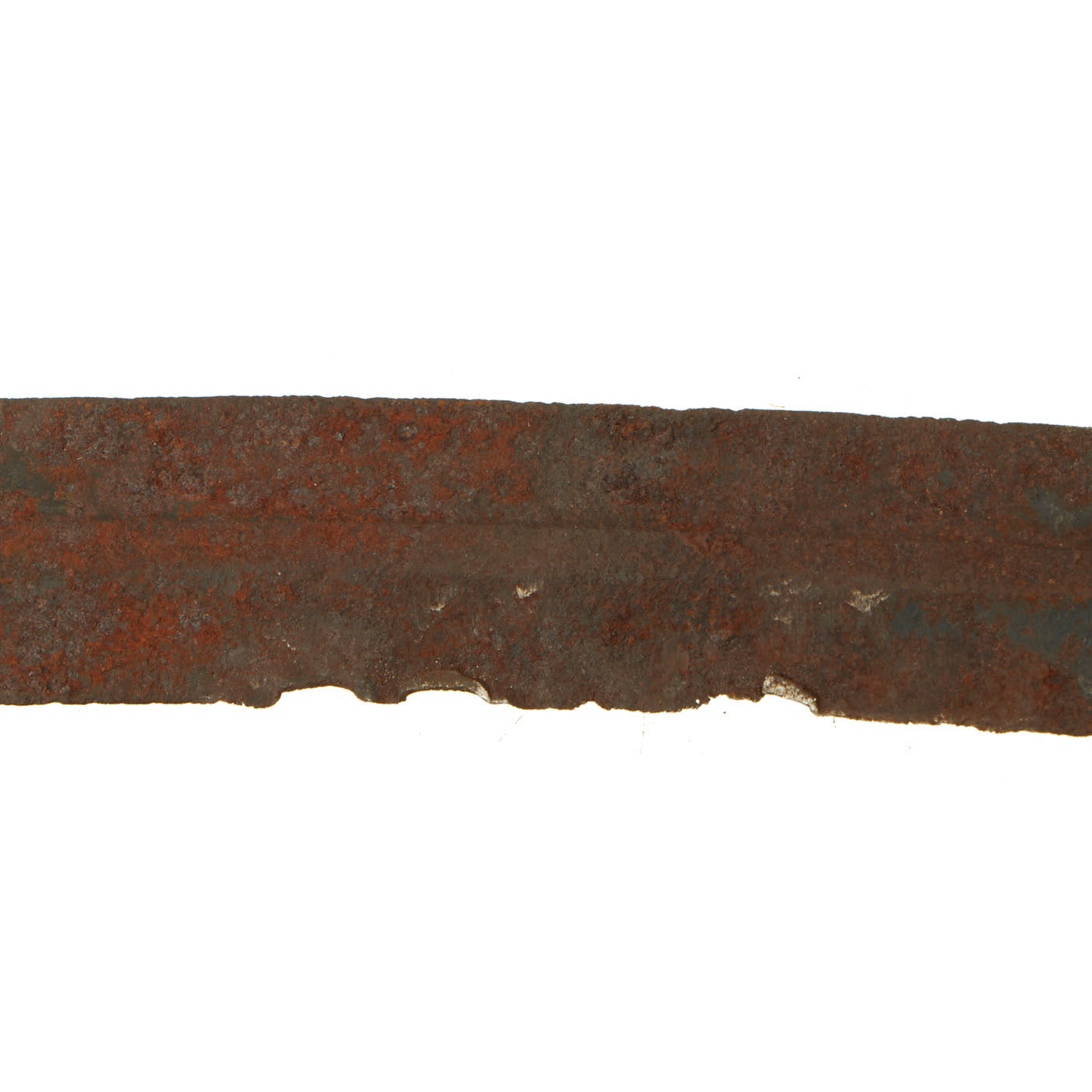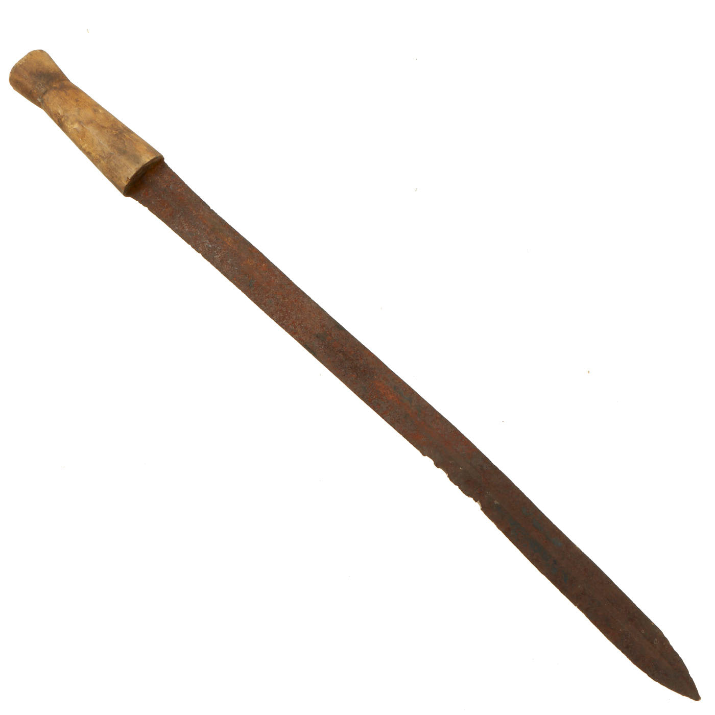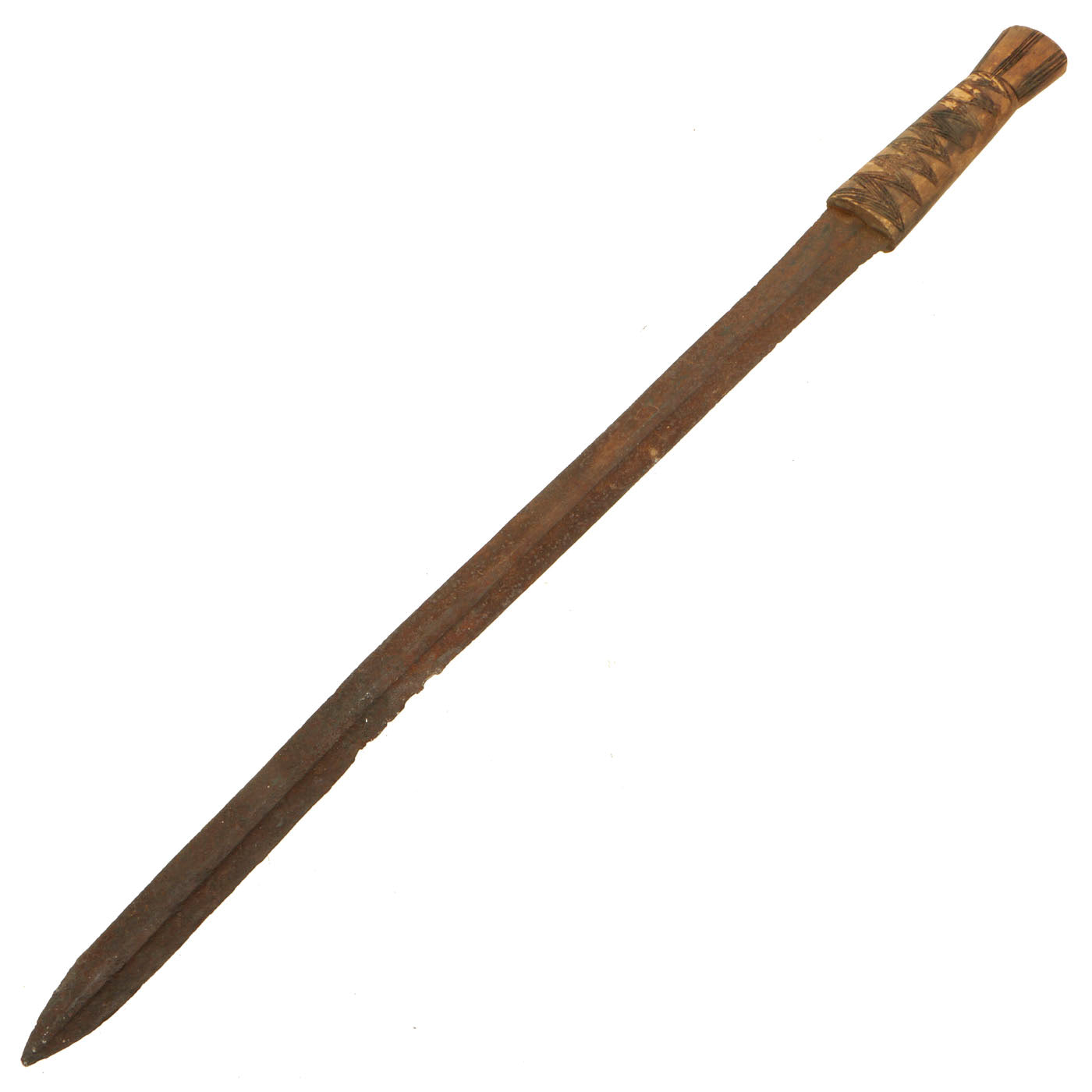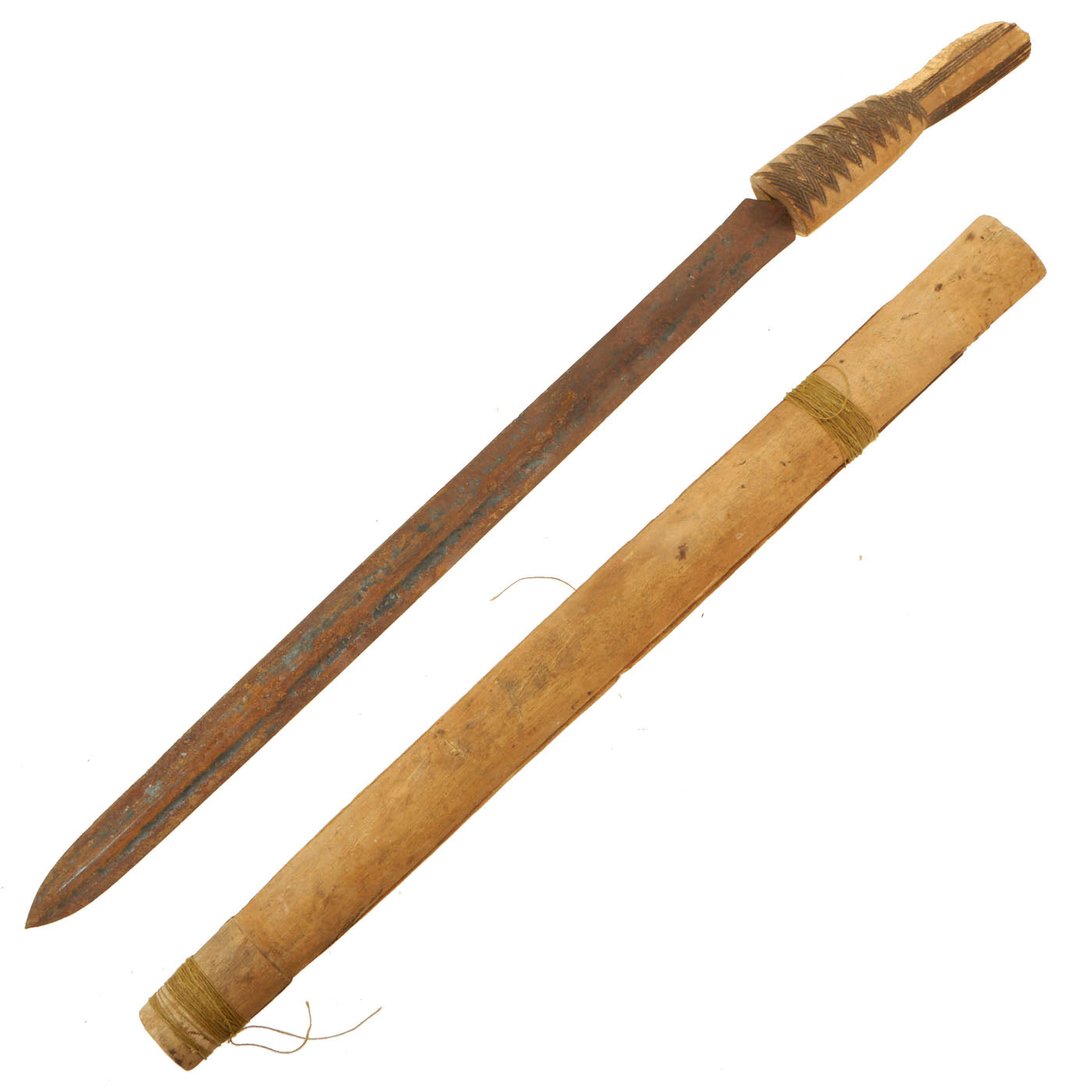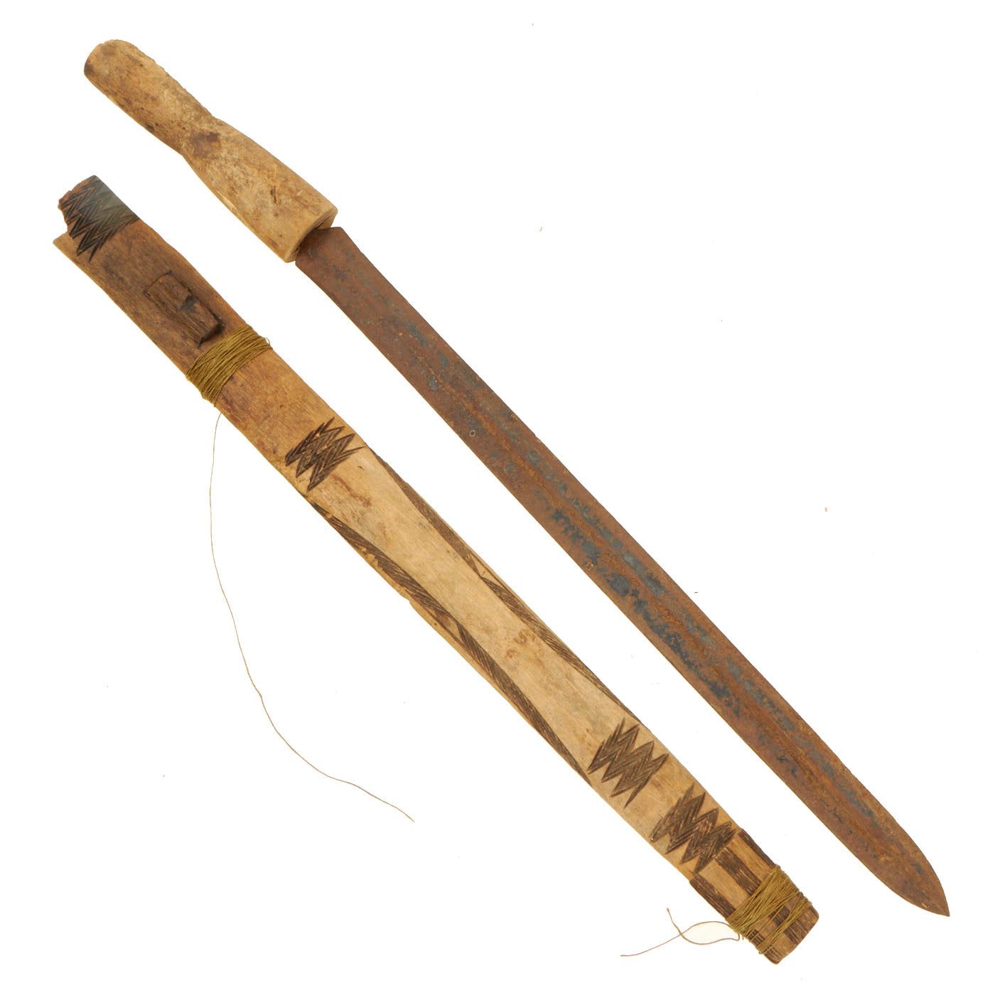-Two Short Swords. One with a crude iron blade fitted into a handle with a decorative design carved into it The first sword measures approximately 22 ¾” long overall, with a 12 ¼ “ blade. The second sword, which is of similar construction measures approximately 18 ¾” long in overall length, with a blade length of approximately 14”. The Second sword comes with its original decoratively carved wooden sheath. The sheath is split, however, and is lashed together with heavy period thread.