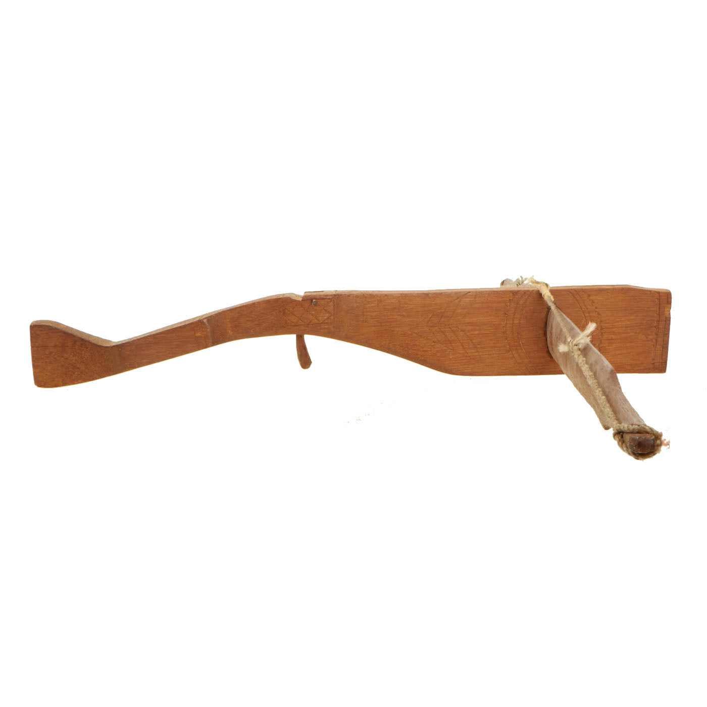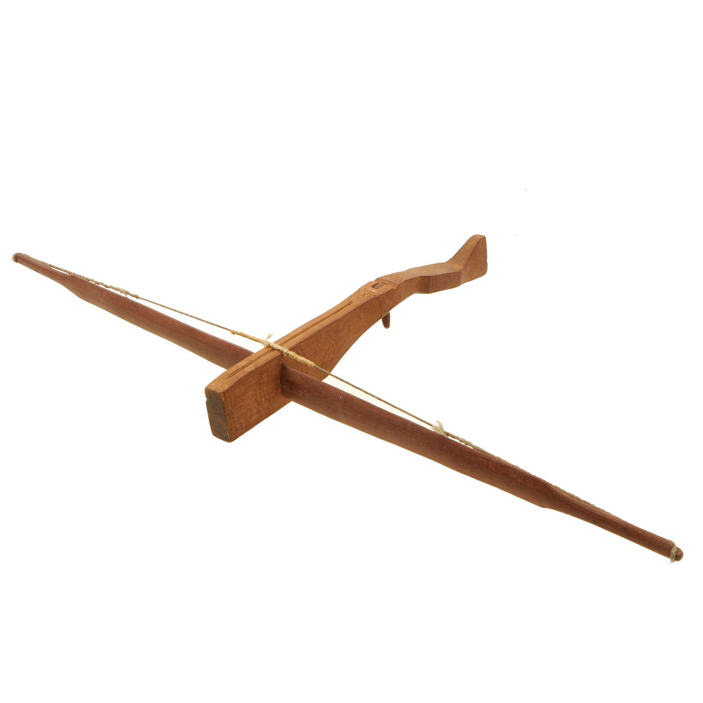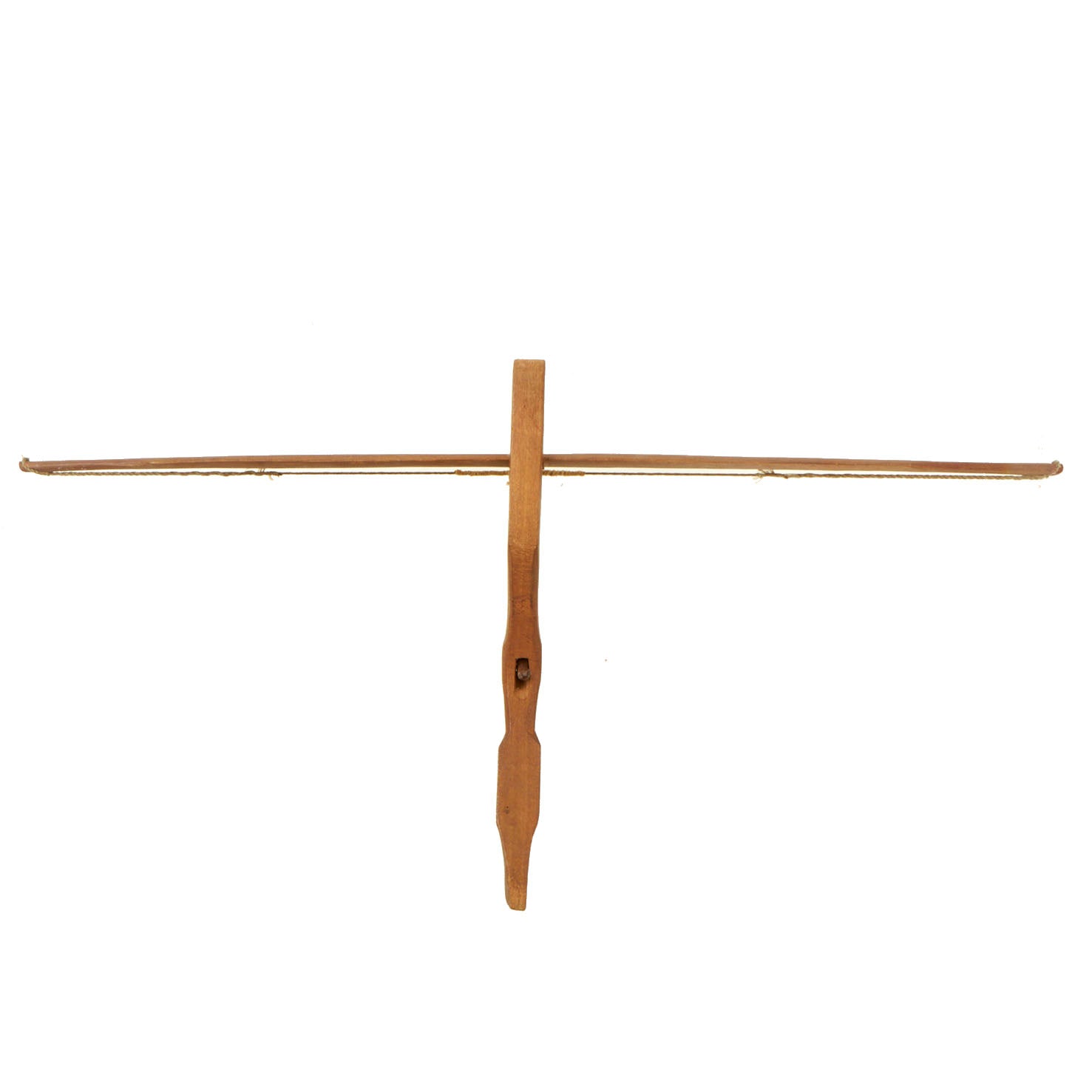 -The crossbow is in the traditional Hmong style. Constructed of a South Asian hardwood, the stock of the bow is decoratively carved with various designs and patterns. The handmade woven bowstring is original and completely intact, as is the original wooden trigger assembly. The bow measures approximately 35” x 18”.