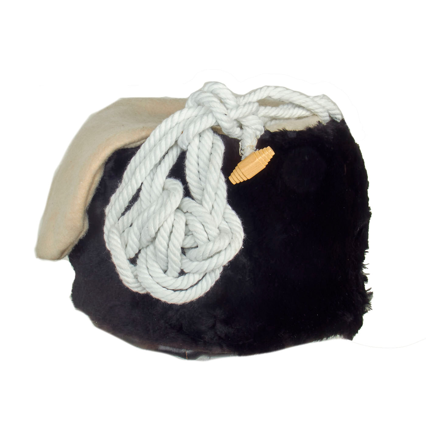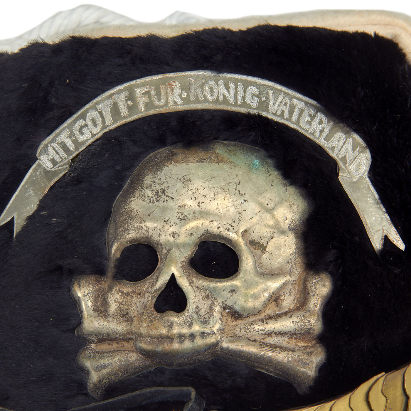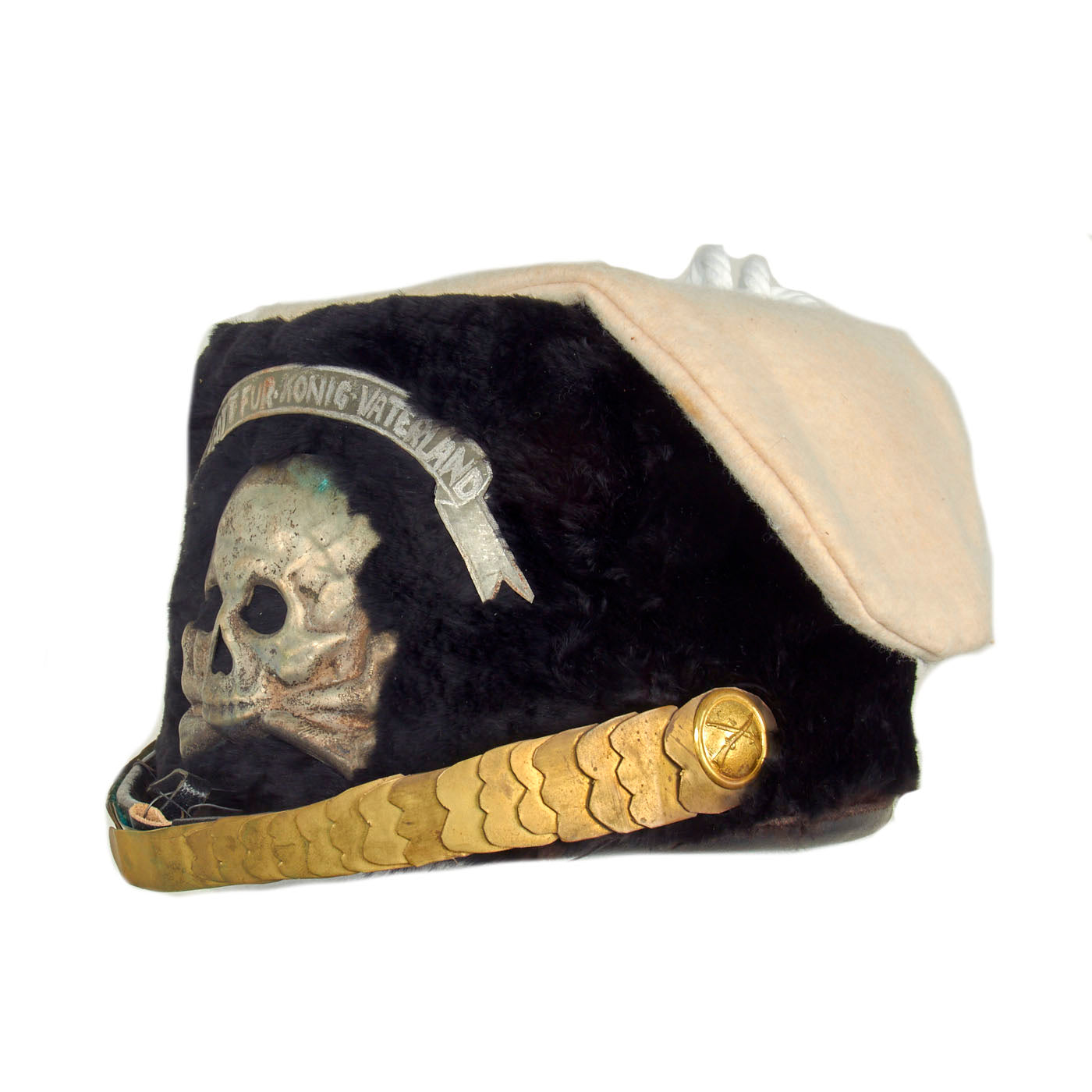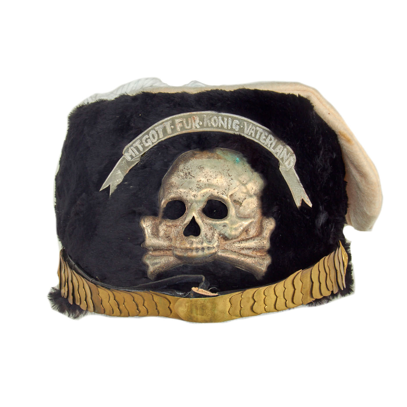 After this the size and design were scaled down, and they became much more for looks than for actual protection. This example is very similar to the British Busby used by Hussars, but is definitely German in design. On the front is a massive Death's Head (Totenkopf) helmet plate in white metal, only used by the Leib Husaren (Life Hussars) regiments, and the helmet comes with its white Kolpak (slouch bag) hanging over the left ear. It also has a bandeau (ribbon) helmet plate with the Prussian Motto MIT GOTT FÜR KÖNIG UND VATERLAND (With God for King and Country, i.e. Prussia) on it. The white bag indicates it is for the 2nd Life Hussars "Queen Victoria of Prussia", first raised in 9 August 1741 along with the 1st Life Hussars. The rear of the helmet has a replica Fangschnur (securing cord) present, which looks good but is not really correctly made.