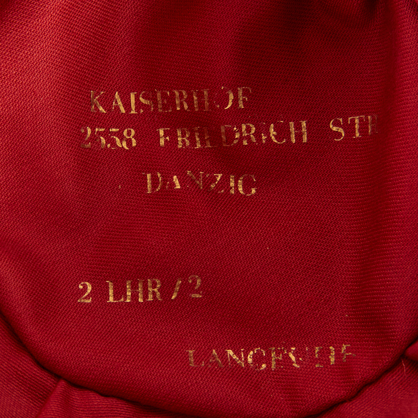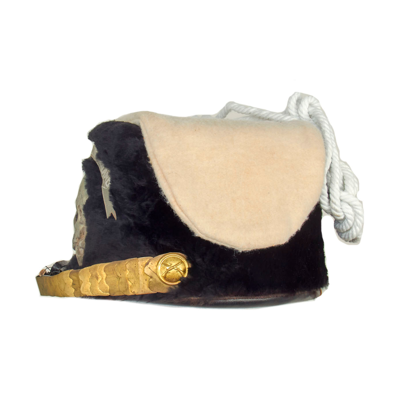 The busby is fitted with brass chin scales, which are attached to the sides of the helmets, and it has a Black / White / Red Reichskokarde around the attachment for the right side. The front of the helmet is however missing the correct Black / White Feldzeichen cockade. In 1897 the new Reichs-Kokarde in Red-White-Black was introduced for all ranks to commemorate the 100th anniversary of the birth of Kaiser Wilhelm 1st. The Reichs-Kokarde was to be worn on the right side of headwear, around the chinstrap lug.