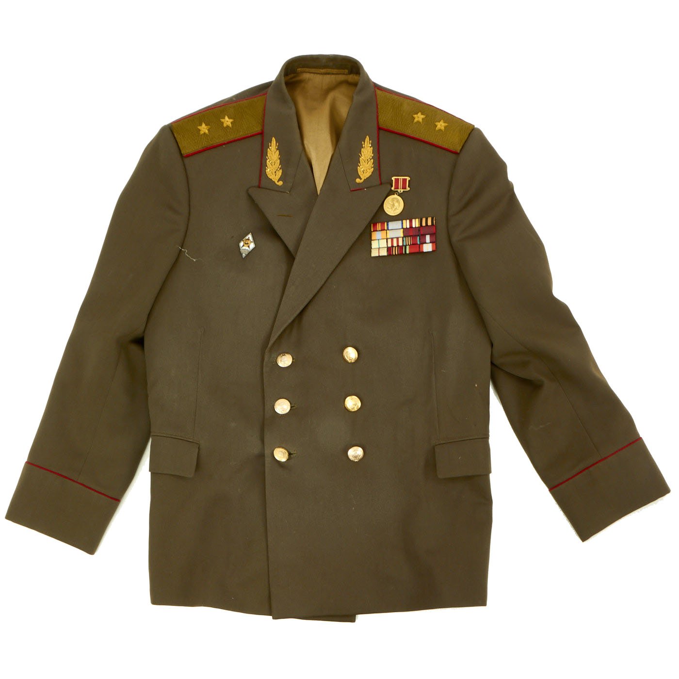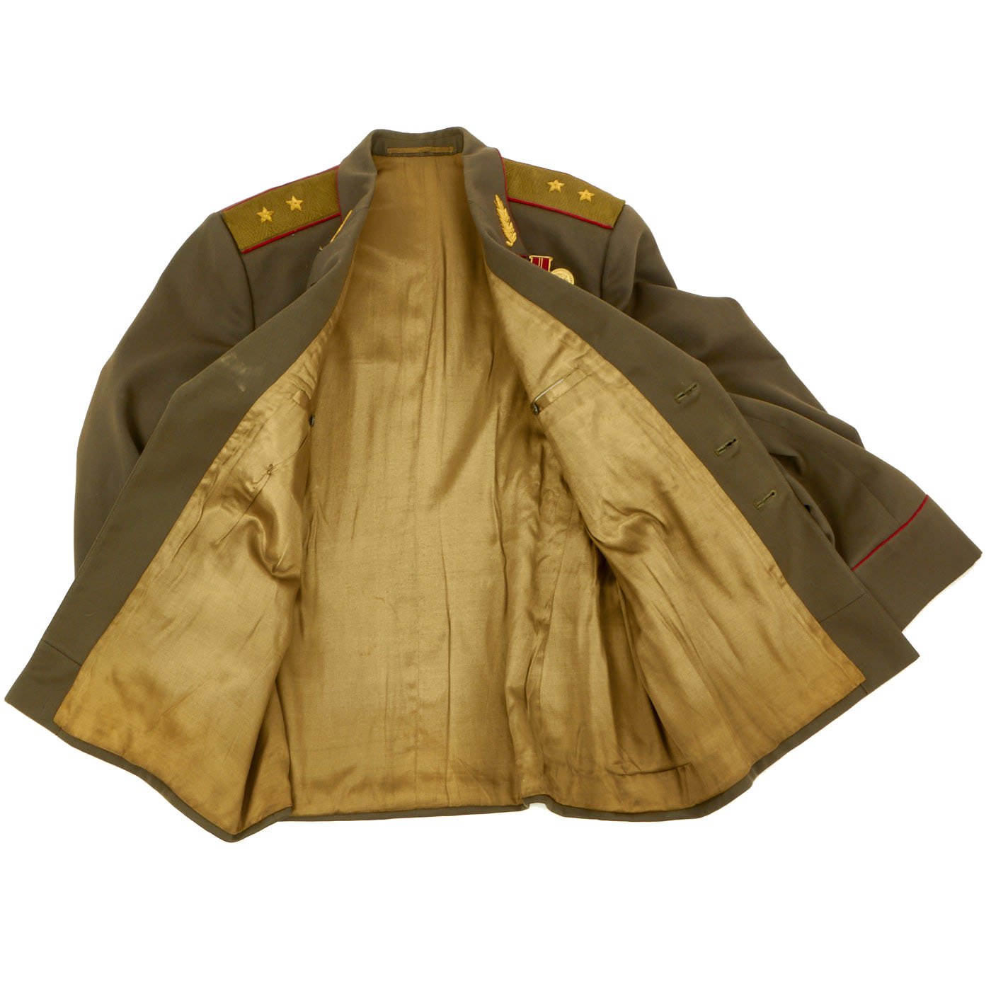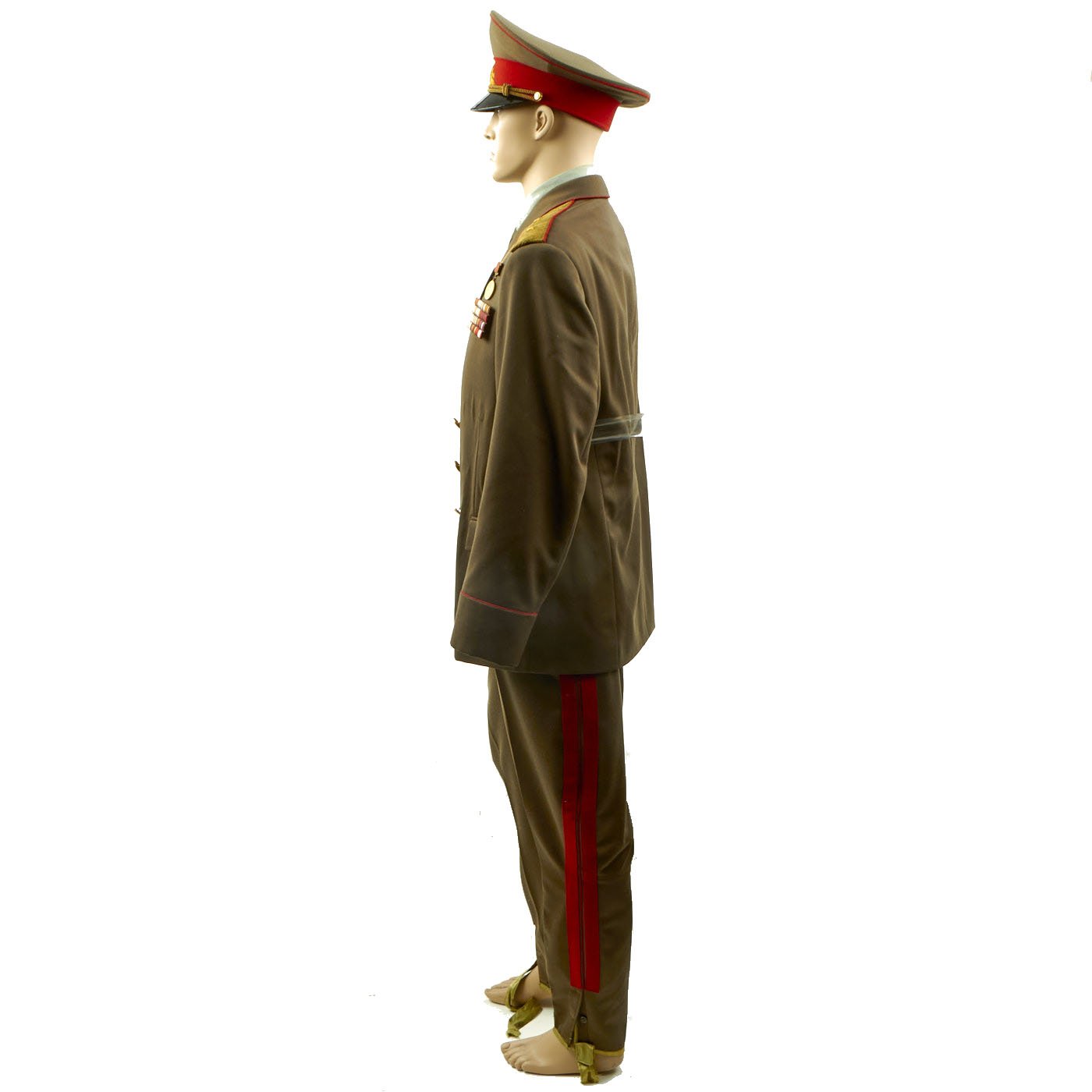 Original Items: Only One Available. Cold War, circa 1980s Lieutenant General’s Uniform Grouping with Display Mannequin. Service Dress Uniform Jacket with awards and ribbons. Matching Lieutenant General’s Rank Boards on each shoulder. Comes with matching General’s trousers with inseam stripe and corresponding Junior General’s Visor Cap. Comes with a display mannequin.