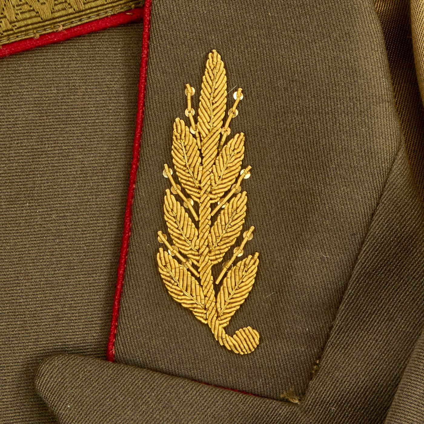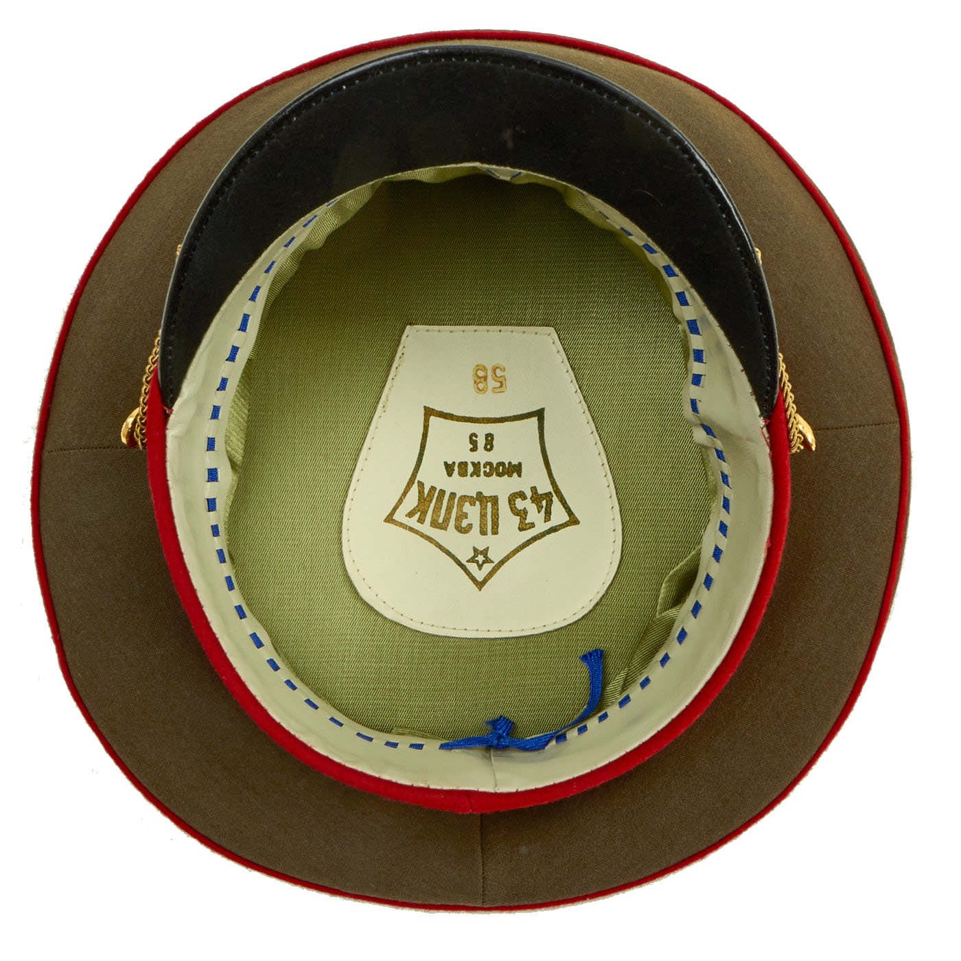1989 - 1991 Soviet Uniforms: 1989 regulations promulgated many interim uniform changes introduced after 1970, and continued in effect until completely new Russian military uniforms were introduced in 1994. Parade and service uniforms remained largely unchanged. Officer service caps now sported gold cords introduced in 1975 under a change to the 1969 regulations. Visors on officer and enlisted caps got larger, and were universally manufactured from plastic (or by special order and for generals - patent kid leather) instead of the painted cardboard/fiberboard used from 1917 into the 1970's.