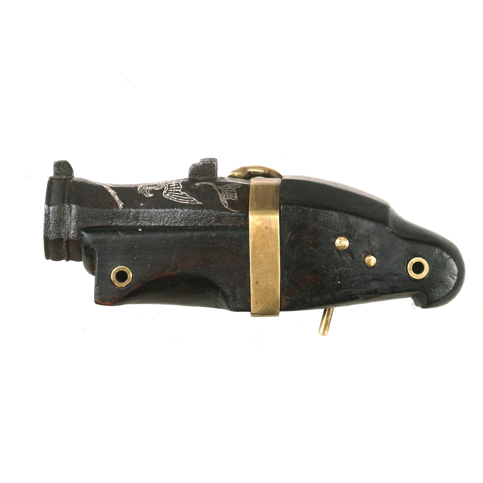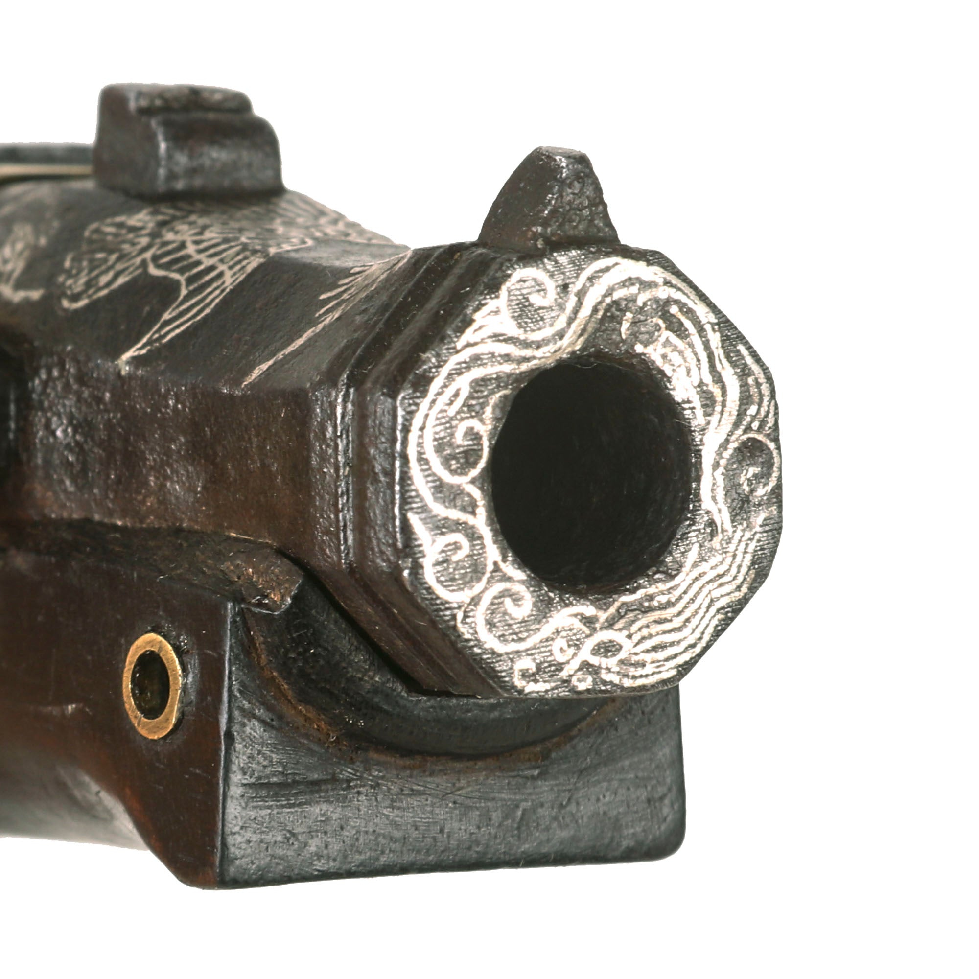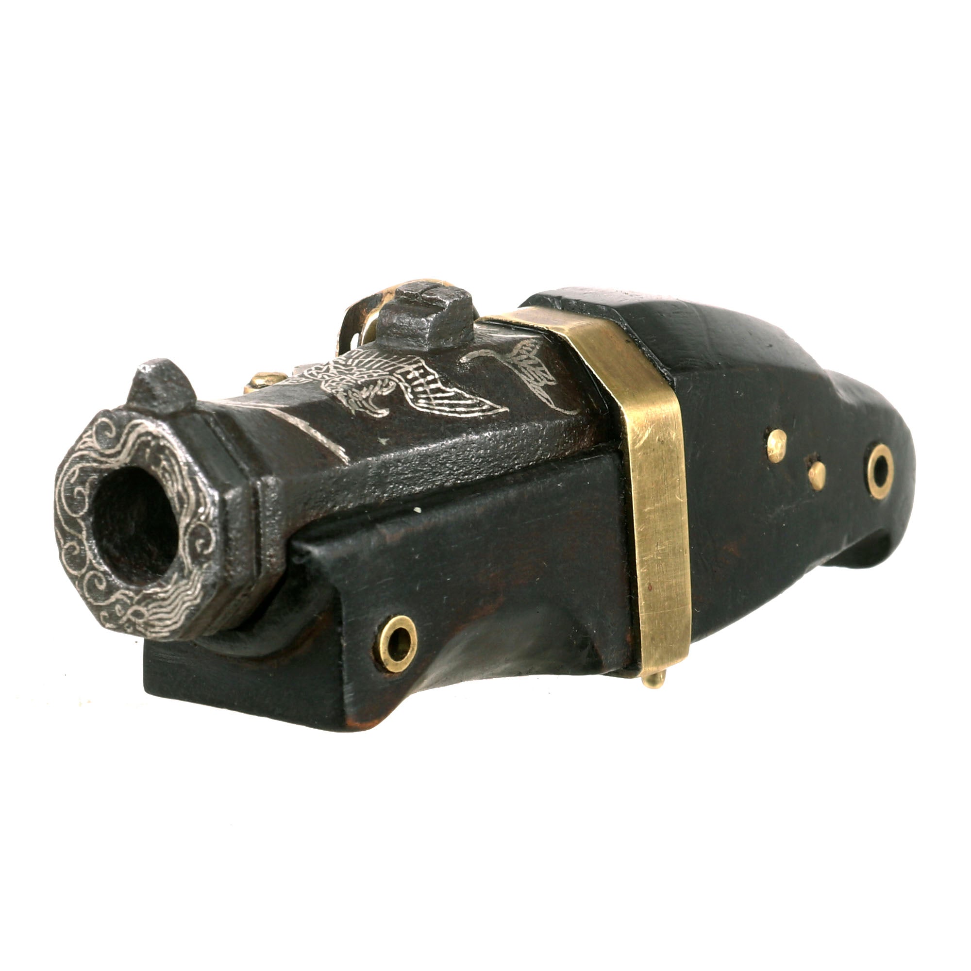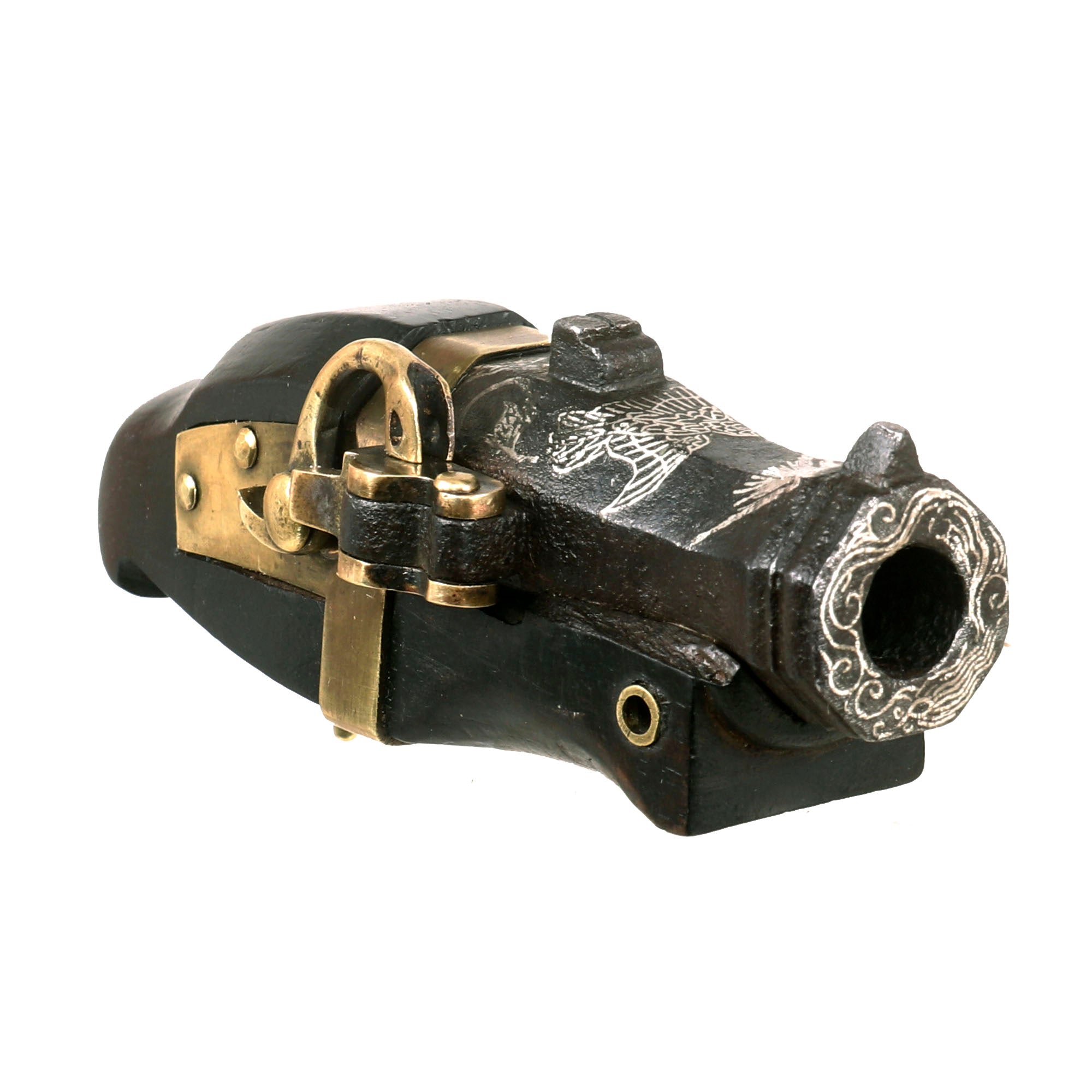 This is one of the tiniest examples of a matchlocks we have ever seen. Similar examples can be found in museums around the world including the Metropolitan Museum of Art in New York. It measures 3” overall with a 1.5" barrel. Intricately engraved and designed. RARE
