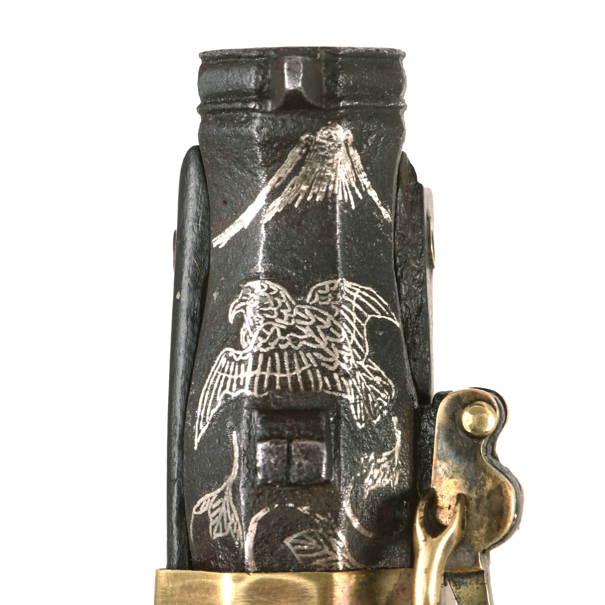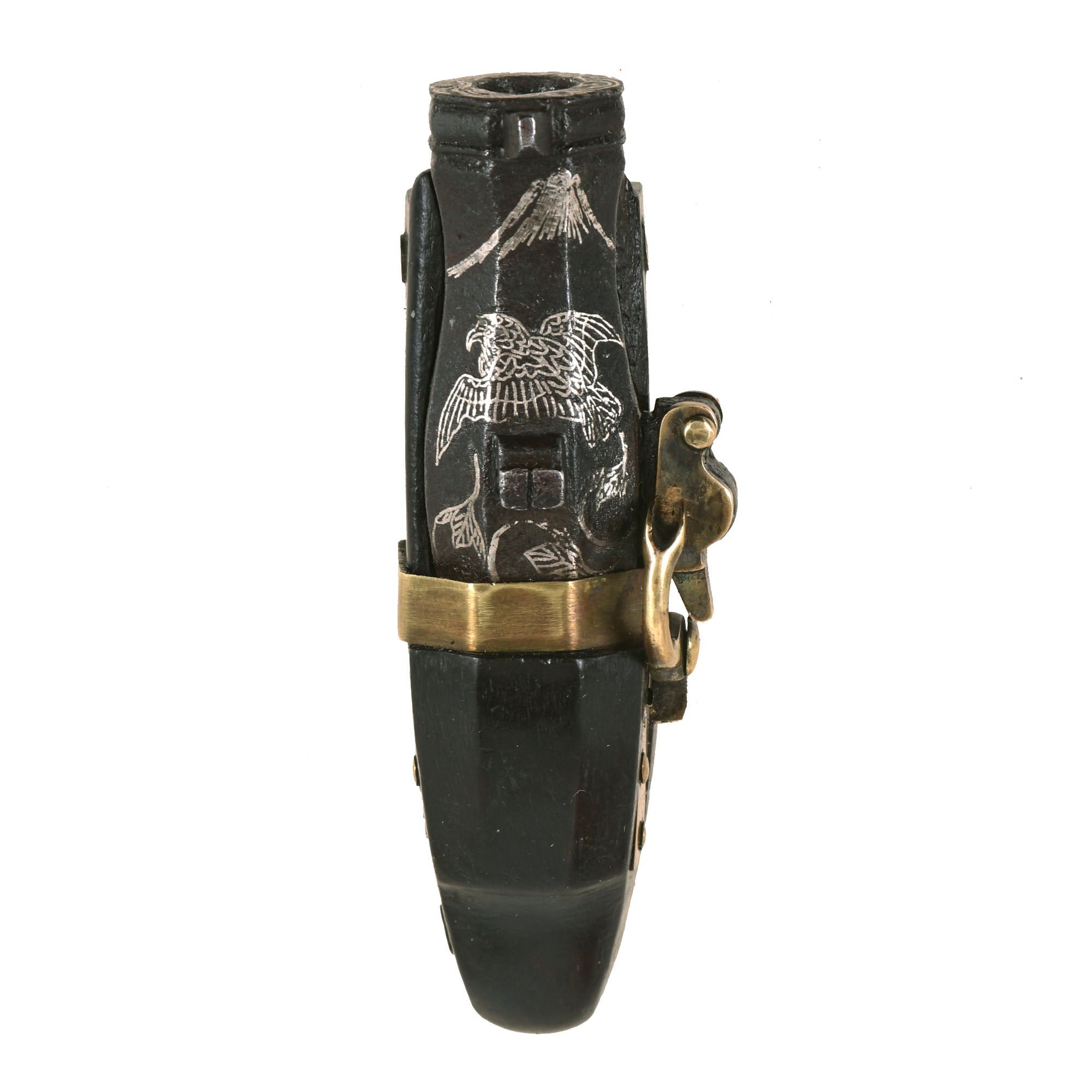 Original Item: Only One Available. Likely dating from the end of the The Edo period, also known as the Tokugawa period, is the period between 1603 and 1868. This is a fascinating tiny fully functional antique matchlock pistol features a 1.5 inch barrel, intricate silver inlay, brass fittings and a hardwood stock. This Japanese vintage firearm was designed to be worn as "netsuke", but it is still a functional matchlock.