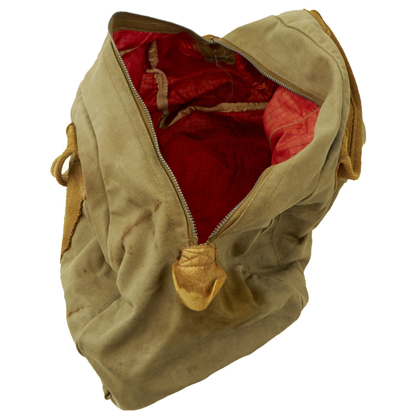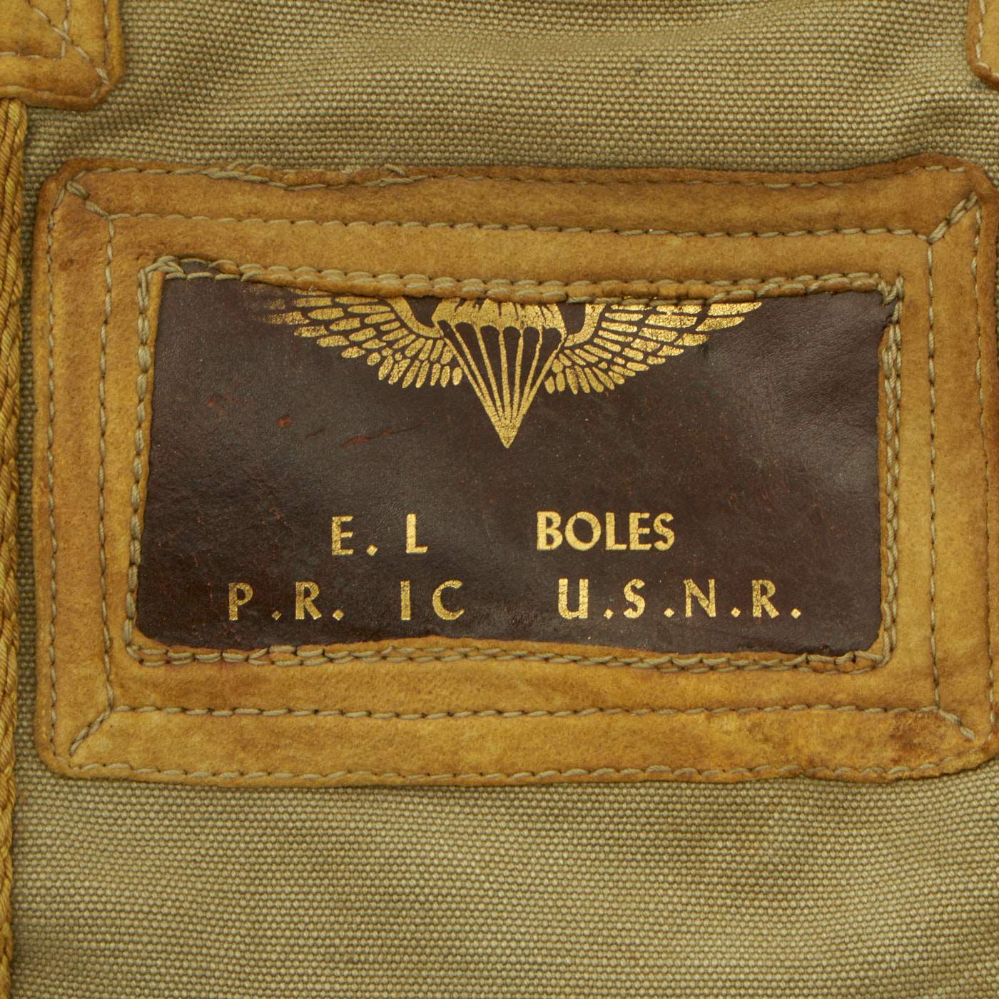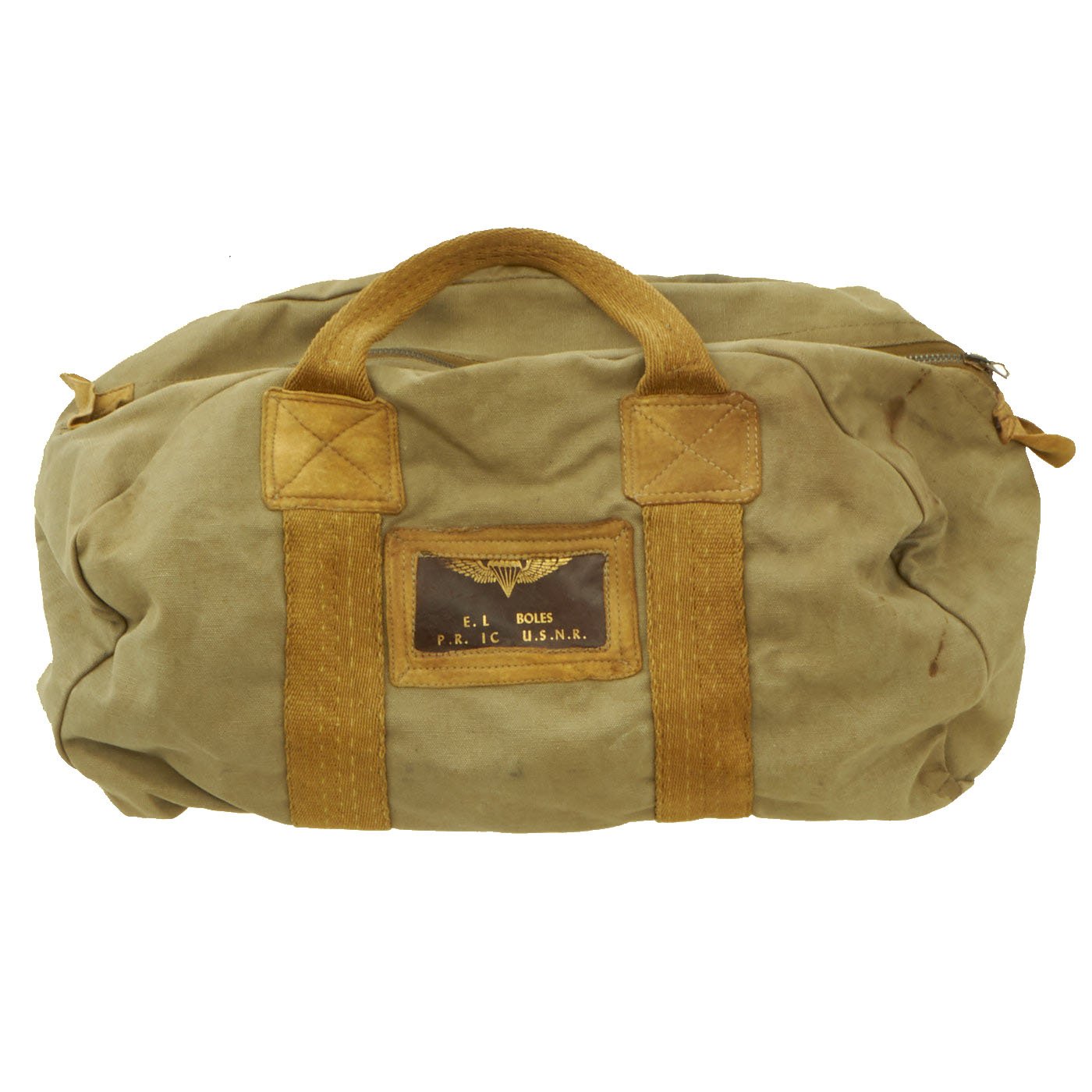 - Original Item: Only One Available. This is a United States Navy parachute traveling bag named on leather tag in gilt lettering to E.L. BOLES. These bags were also used by the Army Air Corps and called "Kit" bags. Zipper is functional and free from corrosion. Typical stains and snags from age and use but in overall very good condition. Also comes with some extra original patches, correspondence, and more.