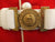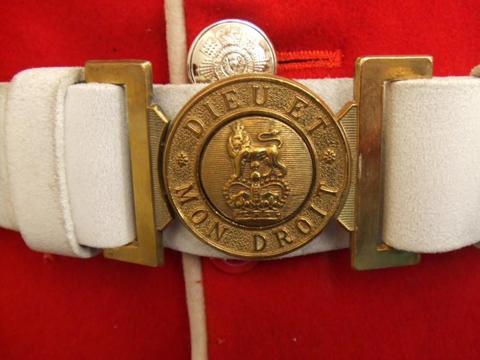 • White Adjustable General Service leather belt with brass buckle showing Crown over Lion motif and motto: " Dieu et mon droit", (God is my right).