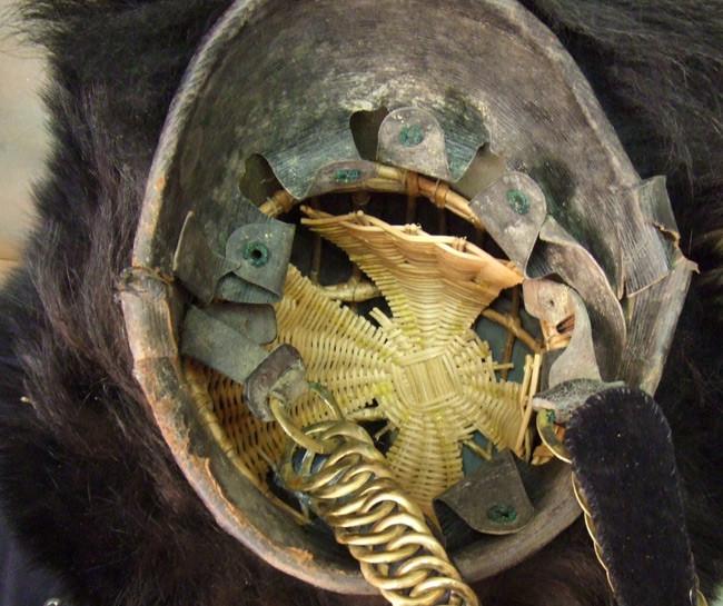 • Full Senior NCO (Junior Officer's) Bearskin, taller than the Other Ranks issue, but not as tall as the Commissioned Officer's version. Complete with whicker cage, leather headband and brass ringed leather backed chin scales. Note: By tradition the Scots Guards wore NO hackle on the Bearskin. In Battle order they were the FRONT-CENTER, with Grenadier Guards and Coldstream Guards on side and Welsh Guards and Irish Guards on other side. Each of the "Side Regiments" wore a colored horsehair hackle on the side of the helmet away from the center. The Scots in the middle wore none.