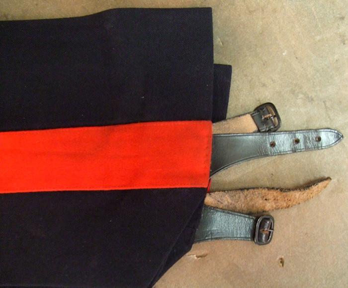 • Pair of "Coveralls" (Trousers) Officer's very tapered grade with leather strap and buckle at cutaway bottom hem for securing under the boot directly in front of the heel. This helps to keep Overalls skintight and dashing. (Very Officer like!)