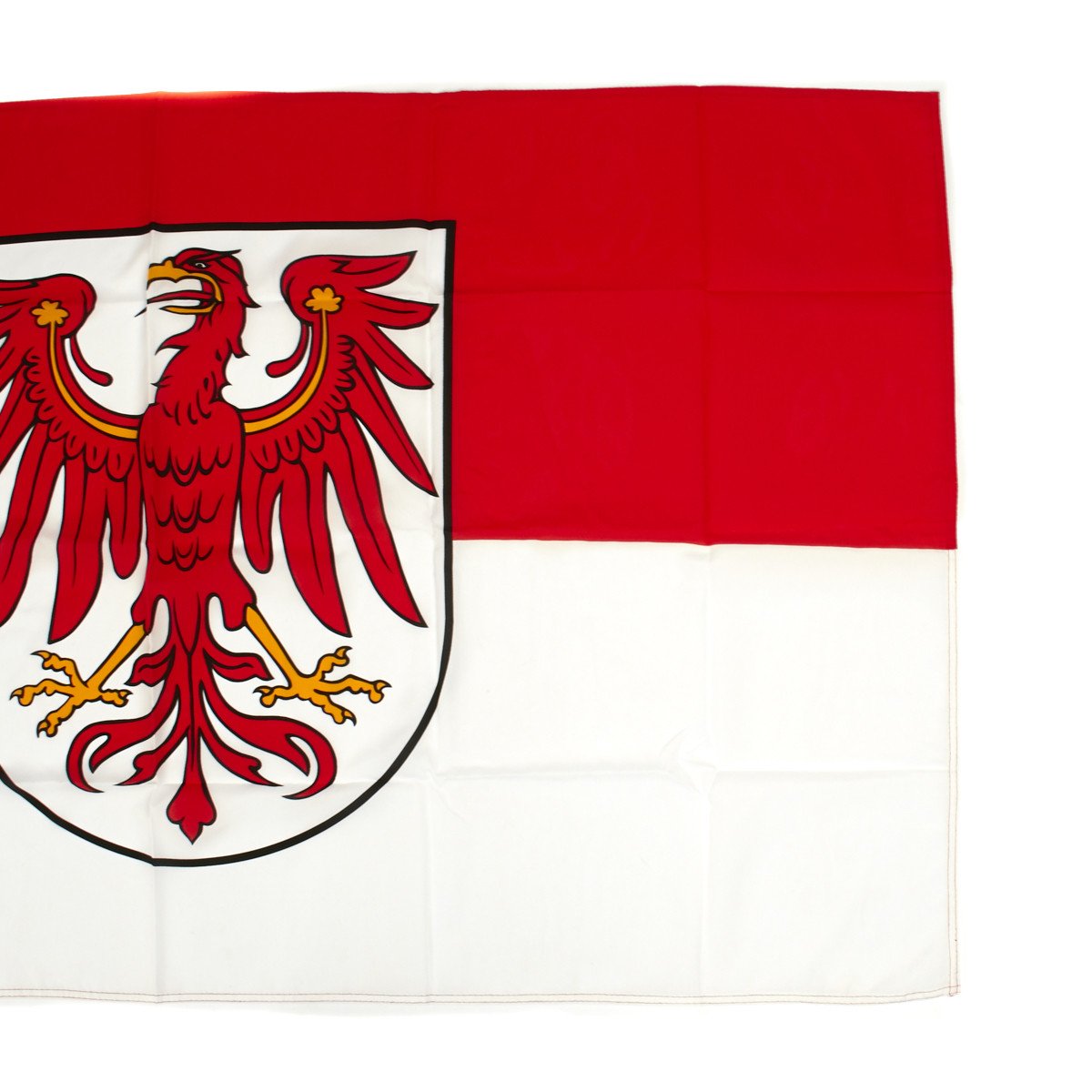 The flag of Brandenburg is a horizontal bi-color of red over white, with the arms of the state (land), in the center. The coat of arms of the state shows on a shield in white (silver) a red eagle, looking to the right, with wings decorated with trefoils in gold and armored gold. In its current form, the flag was adopted on 20 January 1991, with further enshrinement in Article 4 of the Constitution of the State of Brandenburg.