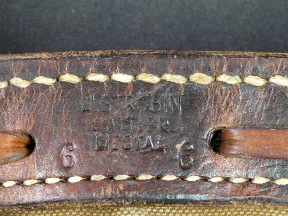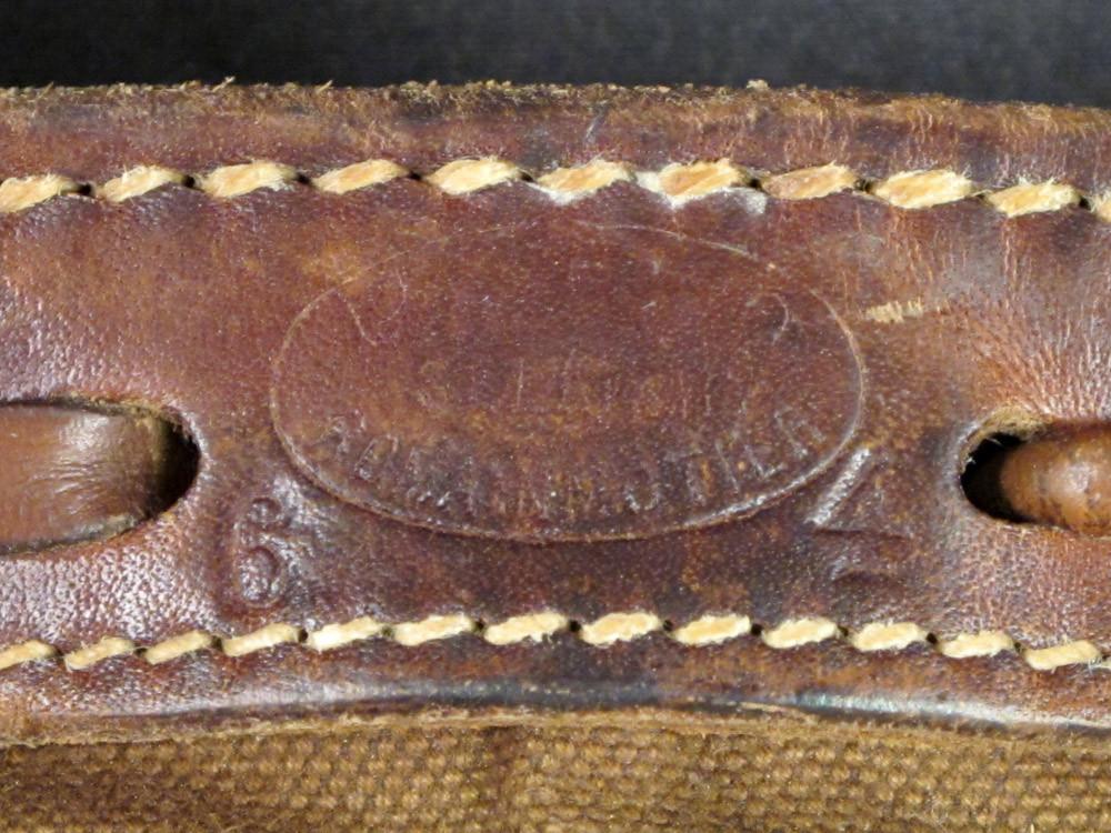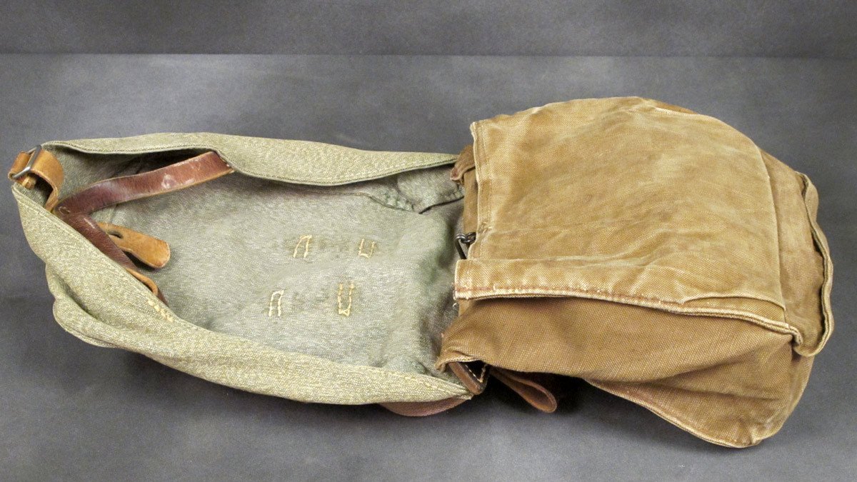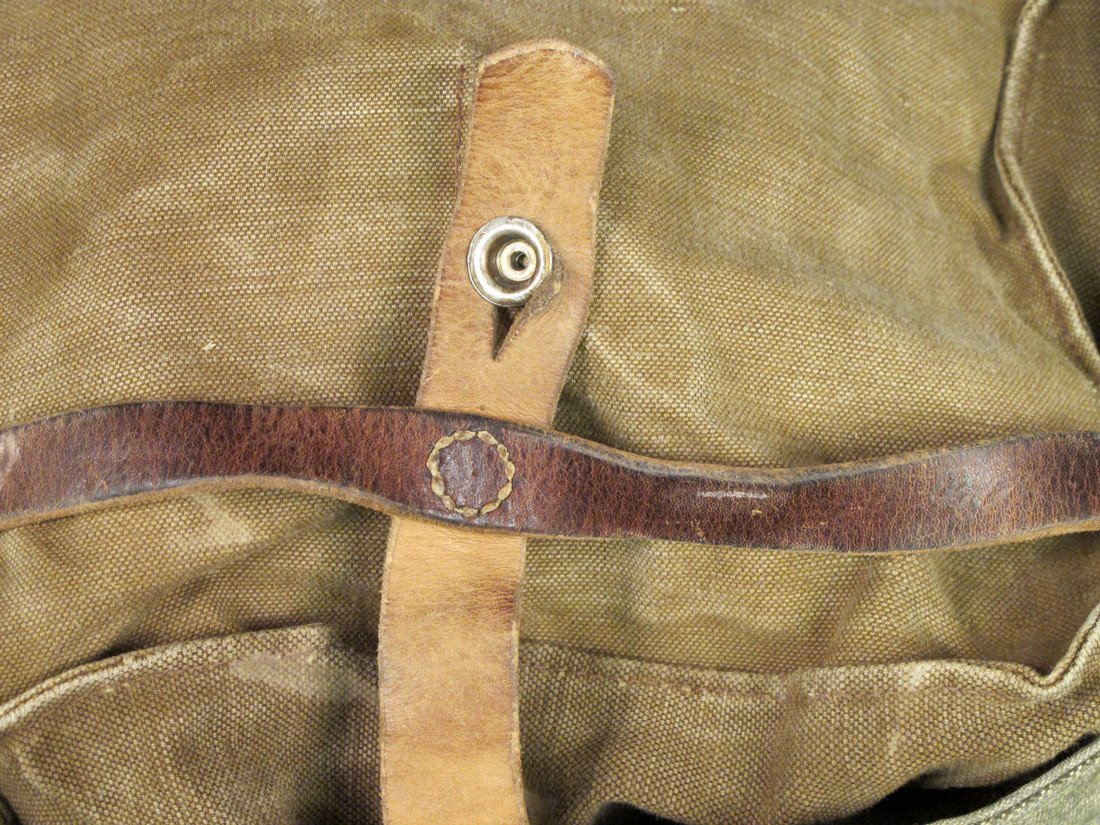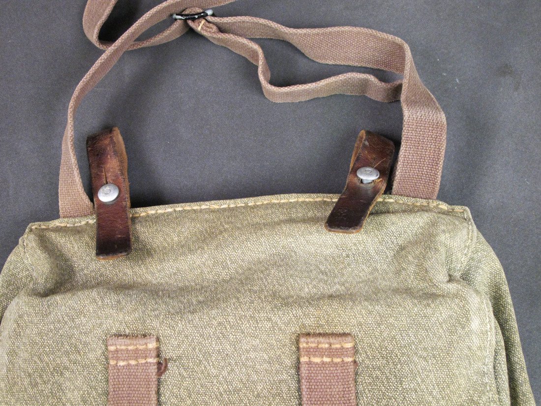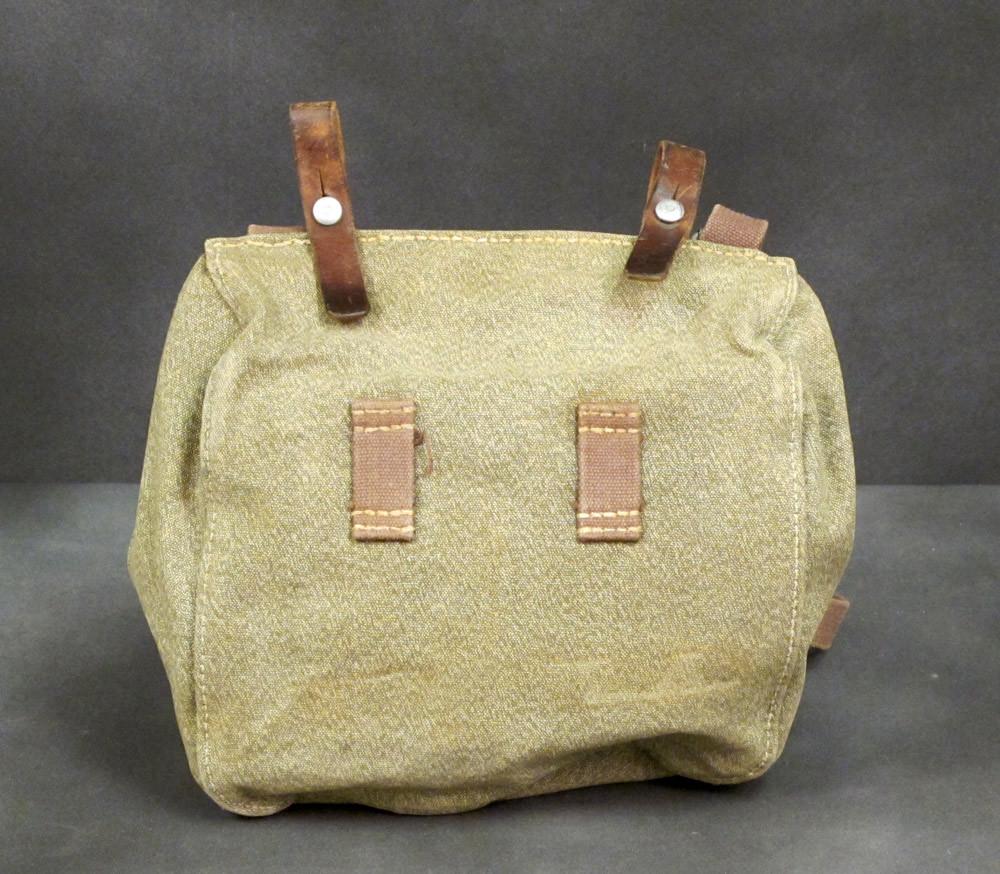 Original Item: Reminiscent of German WWII bread bags, this Swiss Army Bread Bag in Olive Drab with Salt & Pepper canvas cover has a canvas main compartment, two interior compartments, adjustable shoulder straps, leather trim, belt loops, German WWII style aluminum buttons, and even comes marked with manufacturers name and 1950/60s dates. Very good to excellent condition.