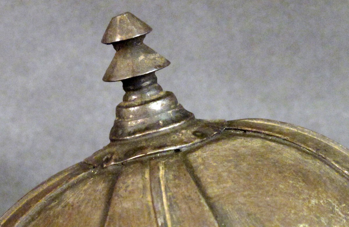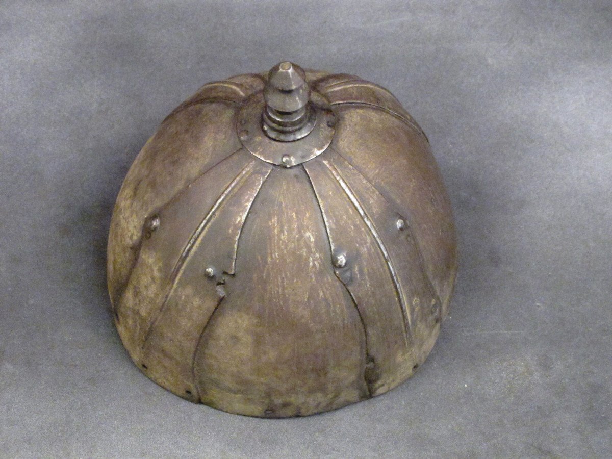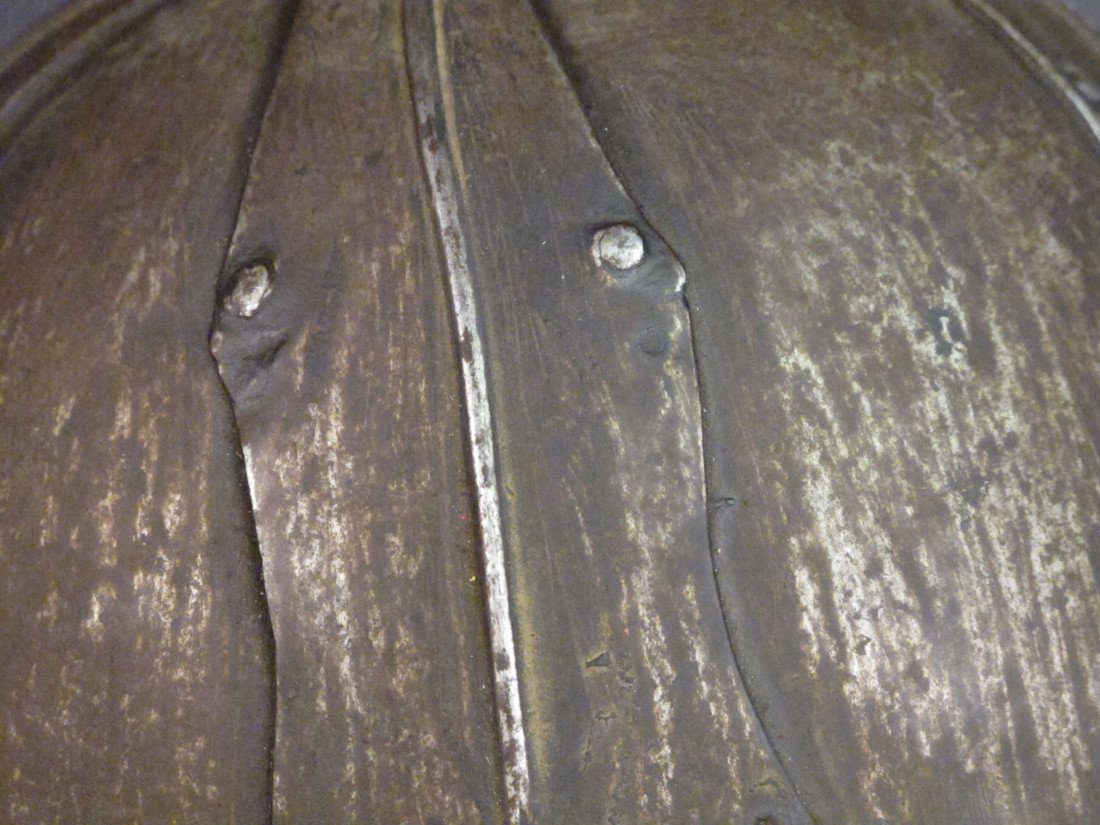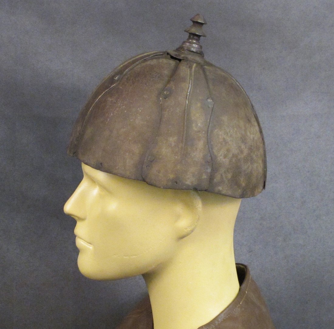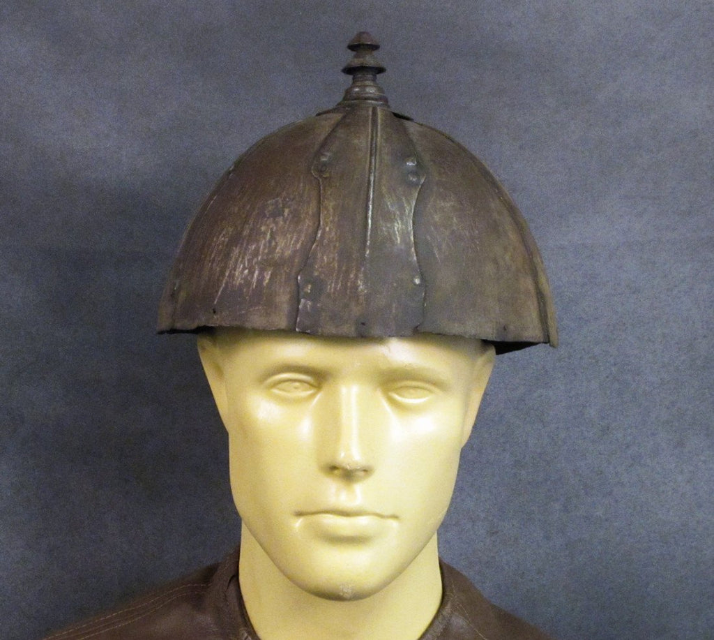 Original Item Recovered in 2003 from the palace of Lagan Silekhana, Katmandu Nepal; This is an exceptionally rare primitive War Helmet originating we believe from Tibet deep within in the Himalayan Mountain Range of Central Asia. This helmet shows very early style construction, reminiscent of the Viking headwear, comprised of steel panels riveted together by decorative outer panels, the total surmounted on the top by a decorative finial.