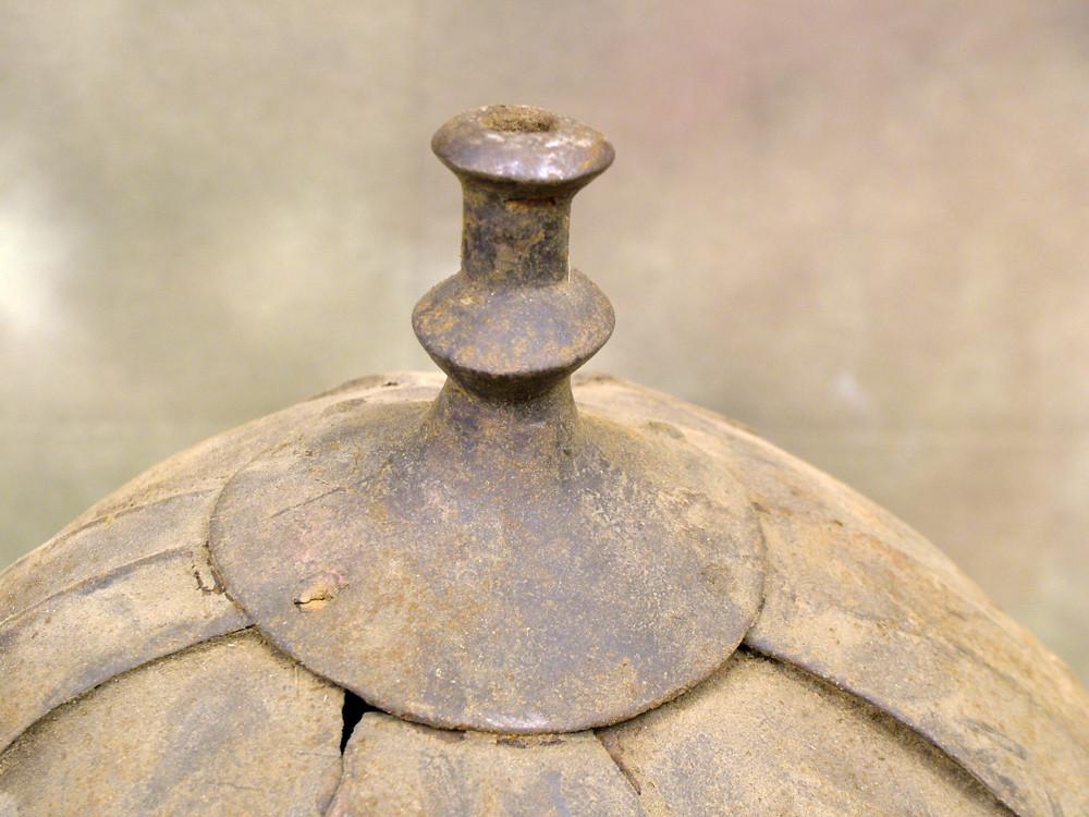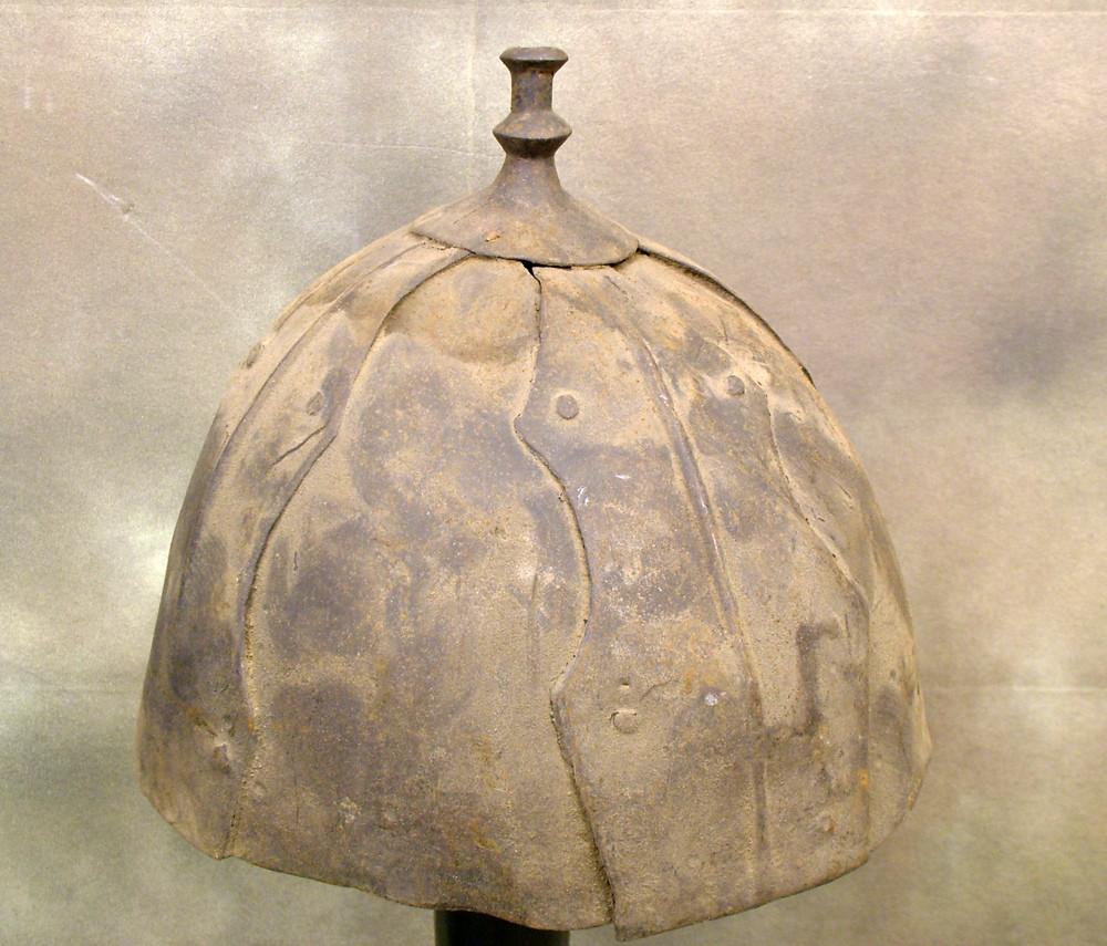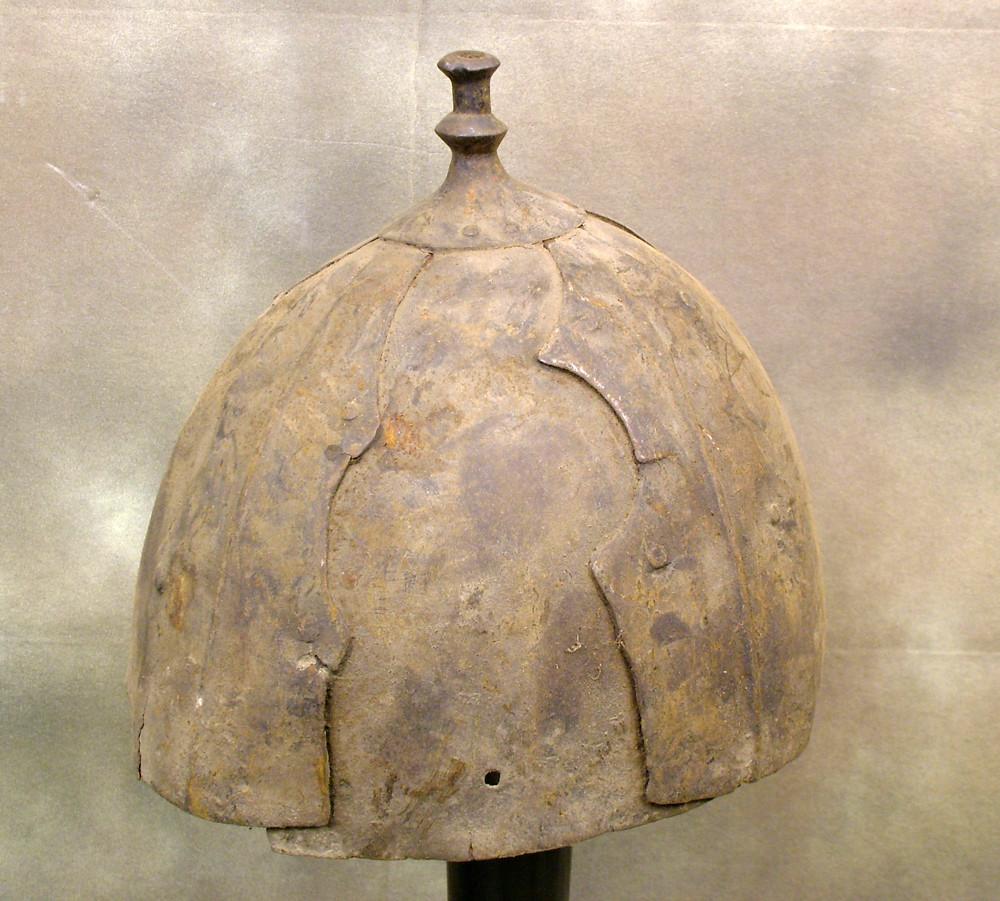 ?typical Tibetan 8-plate construction. The pairs of holes on the plates indicate that they were originally made to be laced together, which is the typical traditional method of assembly. On later and reused helmets you do sometimes see the plates riveted together, as on your examples. In any event, the shape of the plates and the form of the plume finial on the top of each helmet are characteristic for Tibetan helmets. Date is hard to judge. Could be anywhere from 17th to18th century.?