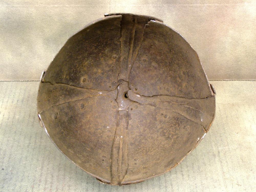 Original Item: One Only. This comes from a small collection of these exceptionally rare primitive War Helmets from TIBET in the Himalayas. Acquired by IMA in 2003 from the Nepalese Royal Armory. The early style construction, almost that of the Vikings, is of steel panels riveted together by decorative outer panels, the total surmounted on the top by what appears to be a plume holder. These certainly smack of Genghis Khan, although he was supposed to have come from a little further North in Mongolia. Clearly exceptionally old and apparently an extremely rare all original item.