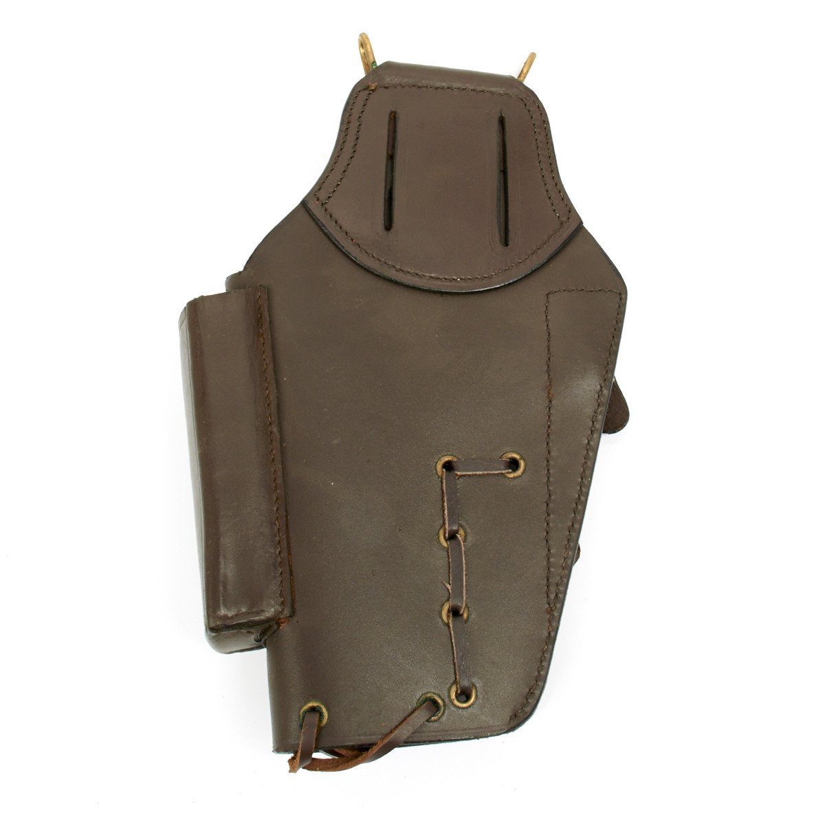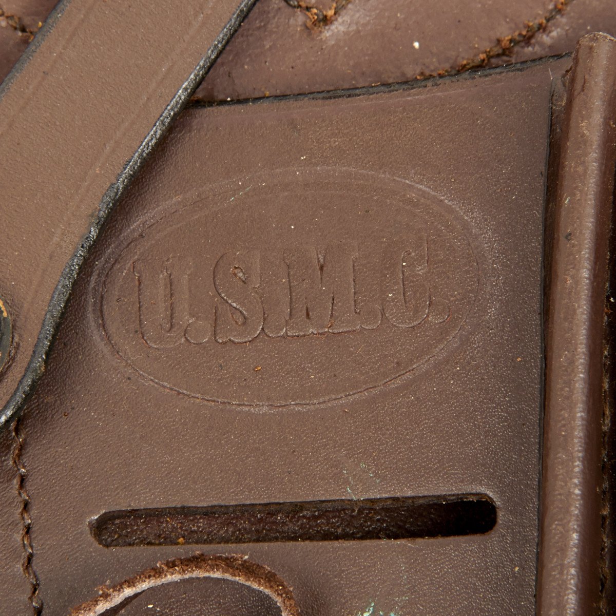 Also included is a leather thong threaded through grommet holes to restrict the size of the holster when light/laser attachments are not installed. Brass attaching hooks for standard U.S. military belt as well as belt loop for other belt models together with leather "gunfighter" tie-down thong complete this fancy rig. Offered only in dark brown leather stamped U.S.M.C.