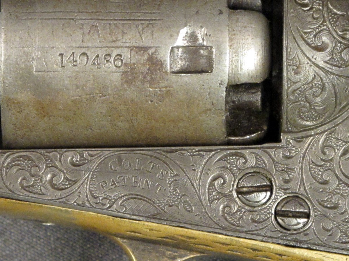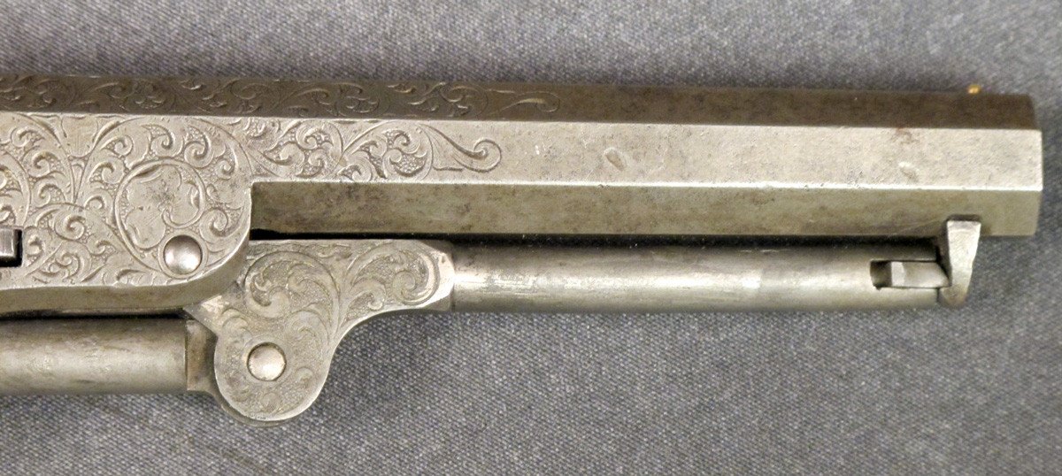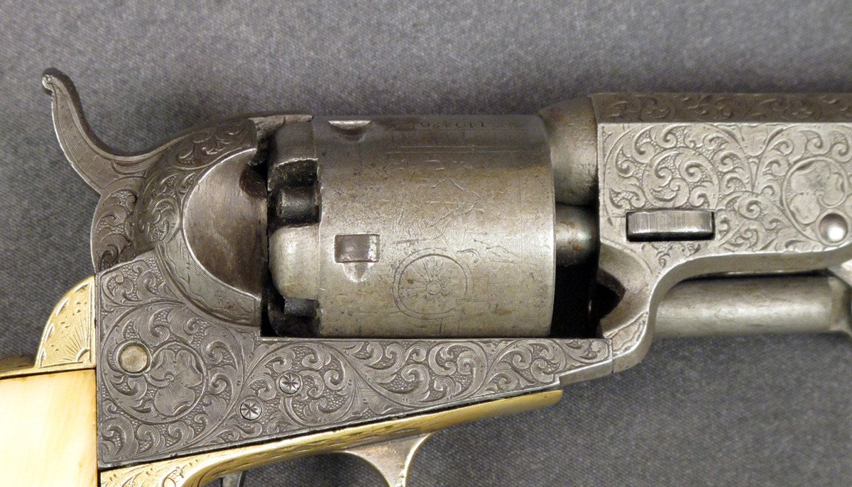 Original Item: One Only. This is a really unusual for IMA. Purchased from one of our collector customers who specializes in British Napoleonic Navy weapons, we got this truly remarkable U.S. Colt 1849 Pocket Revolver that was factory engraved by Gustav Young, his style is unmistakable, fitted with original ivory grips and bearing the owner name on back strap.