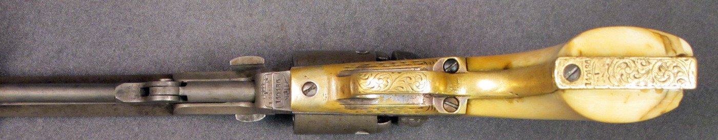 This revolver comes from a collection dating back many decades; this item was apparently obtained from a descendant of the original owner. Therefore, we conclude that this item is truly fresh to the collectors market. In very nice condition, the serial number is prefixed with the letter "I" indicating a factory engraved piece and the Gustav Young engraving is in fine shape. The original do have ivory grips a couple of chips and one small section where a slither of ivory is absent has been filled with some substitute.
