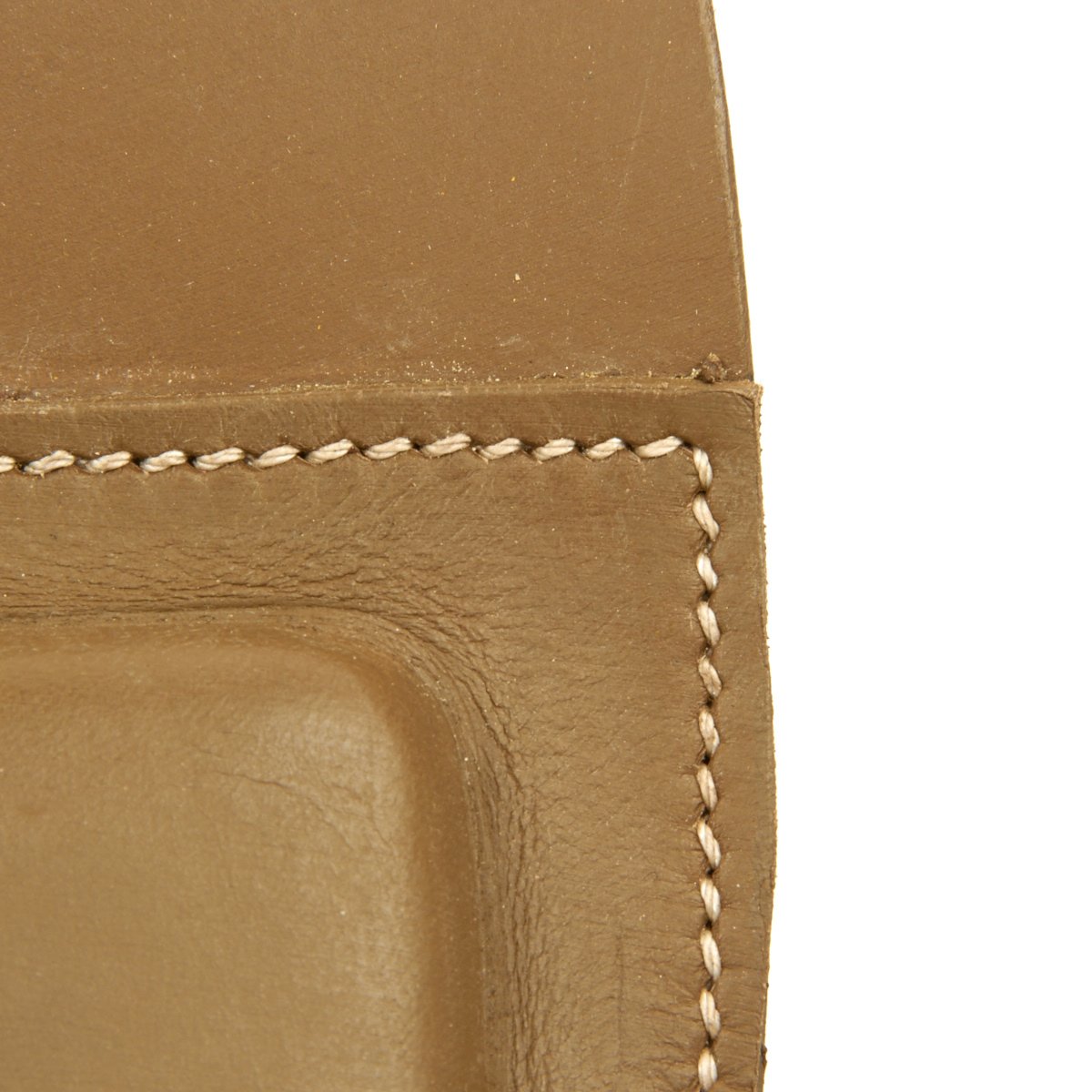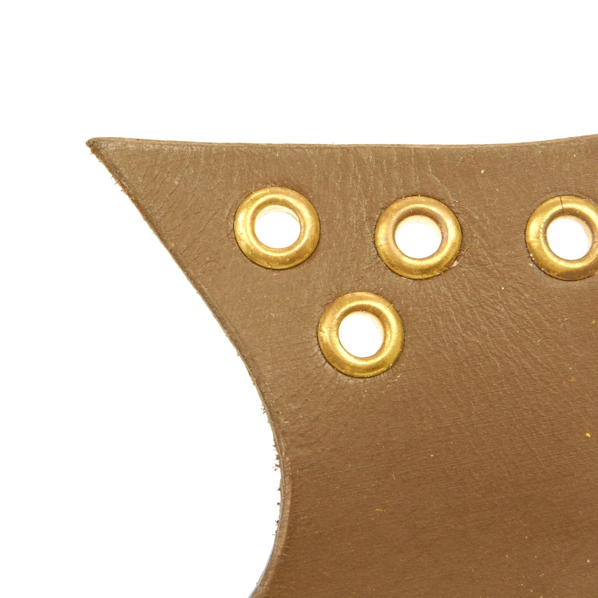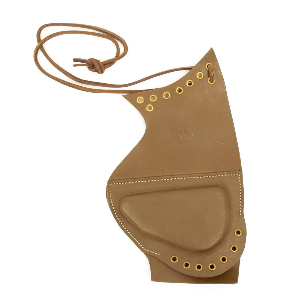 This is a thick high-quality milk chocolate medium brown genuine leather cheek pad secured by heavy stitching and 16 all brass grommets. Comes complete with a genuine leather thong for attaching to the wood rifle stock and a replicated WWII maker marking.