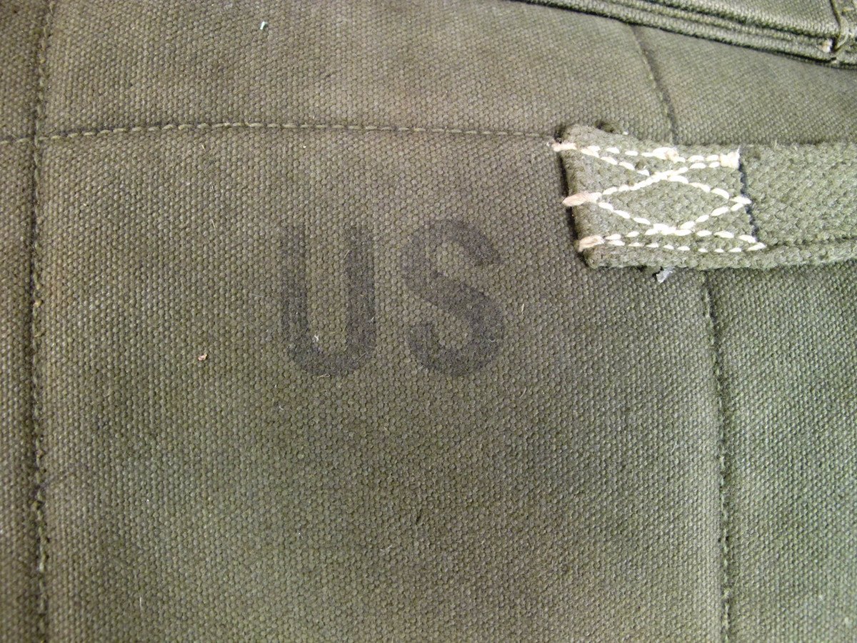 Original Item: US WWII Heavy Padded M1 Garand drop bag. Worn by US paratroopers when jumping with the M-1 Garand rifle. Marked CASE INDUVIDUAL WEAPON PARACHUTIST M1950. Manufactured by JQMD, this jump case was for airborne troops to safely jump from a plane with their M1 Garand inside.