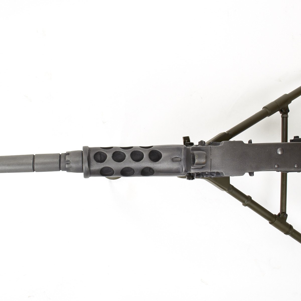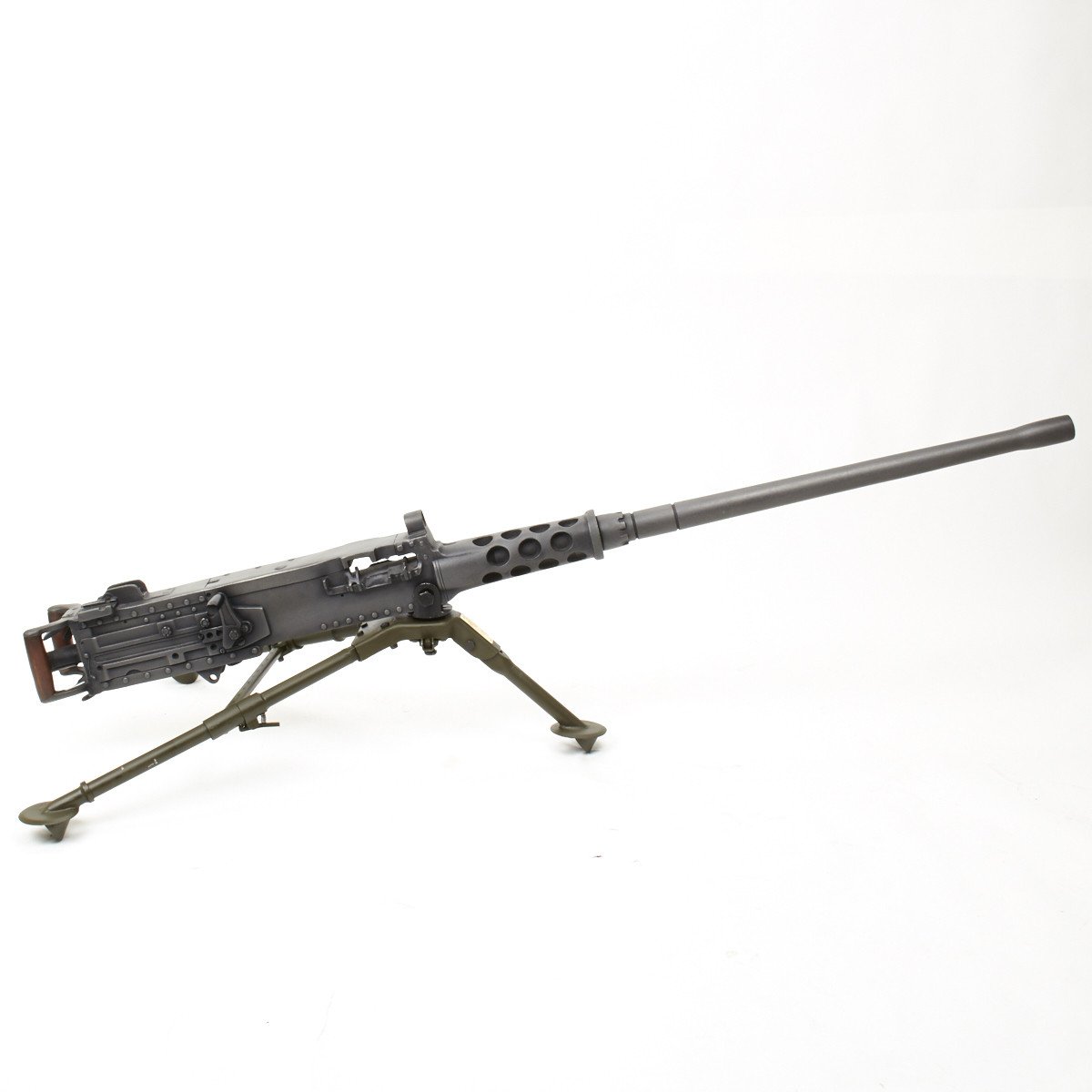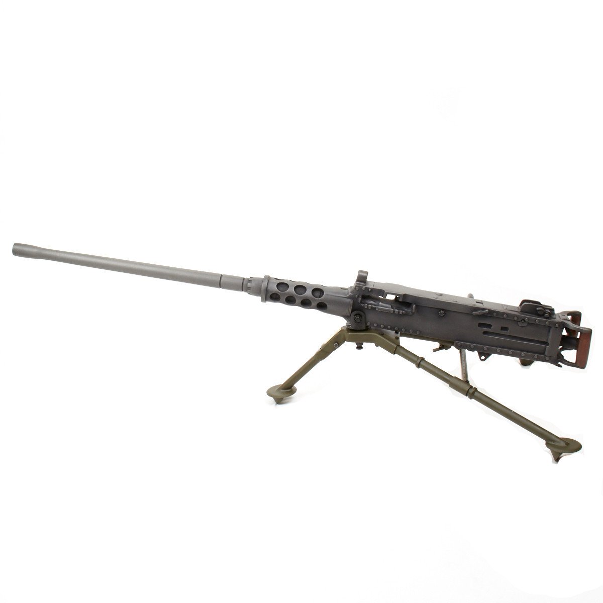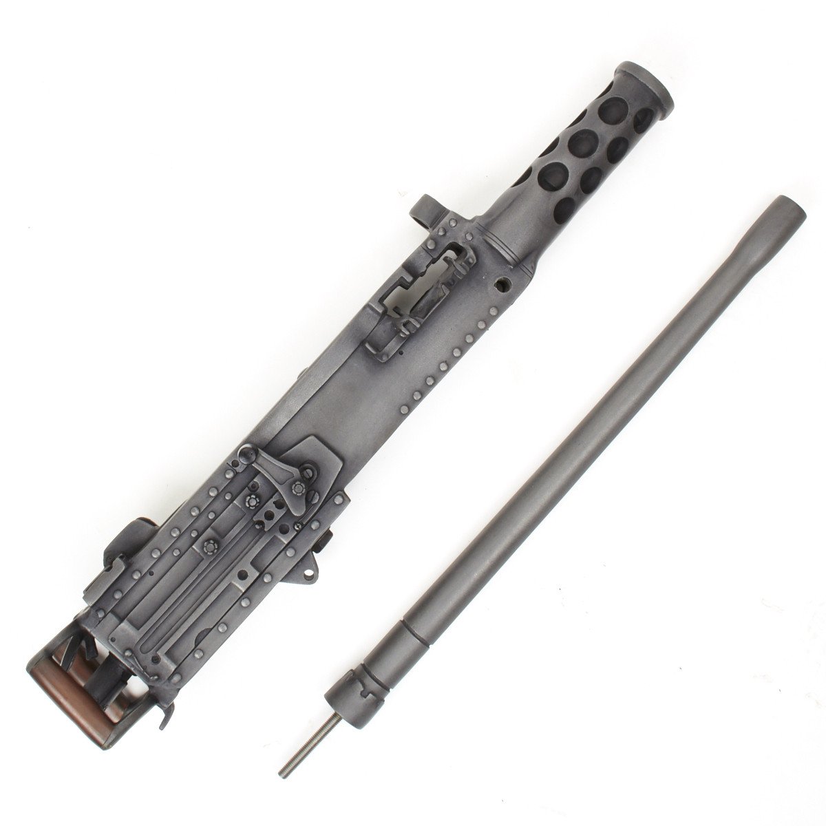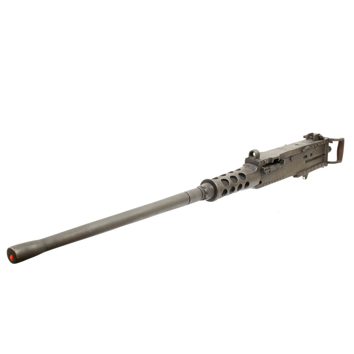 Our solid resin non-firing display gun is nothing short of stunning. It really does look like the real thing from just a few feet away. It was cast from a silicone mold of an original M-2 in the IMA collection and therefore is not only an accurate full size 1:1 scale but has all the details of the real thing. It has been expertly air brushed to provide the cold glimmering look of steel and the warm richness of walnut wood grips. For added authenticity we have used metal fittings at the pintle point to allow you to correctly mount this weapon (we have ours mounted on an M2 tripod for the sake of space) as well as an added metal wire frame that runs through most of the more delicate areas of the gun, and used a 6 INCH STEEL BOLT with large washer at the detachable barrel joint, as well a a STEEL INNER BARREL with resin over-wrap to insure ease of transport and strength of display, be it in your show room or on the back of a Jeep!
