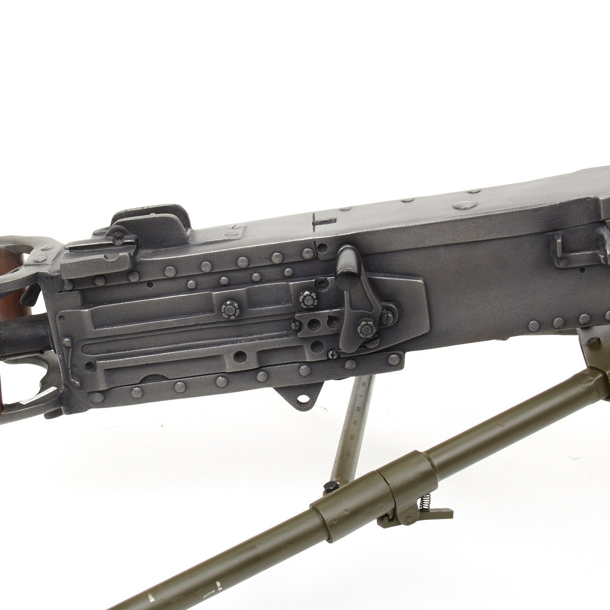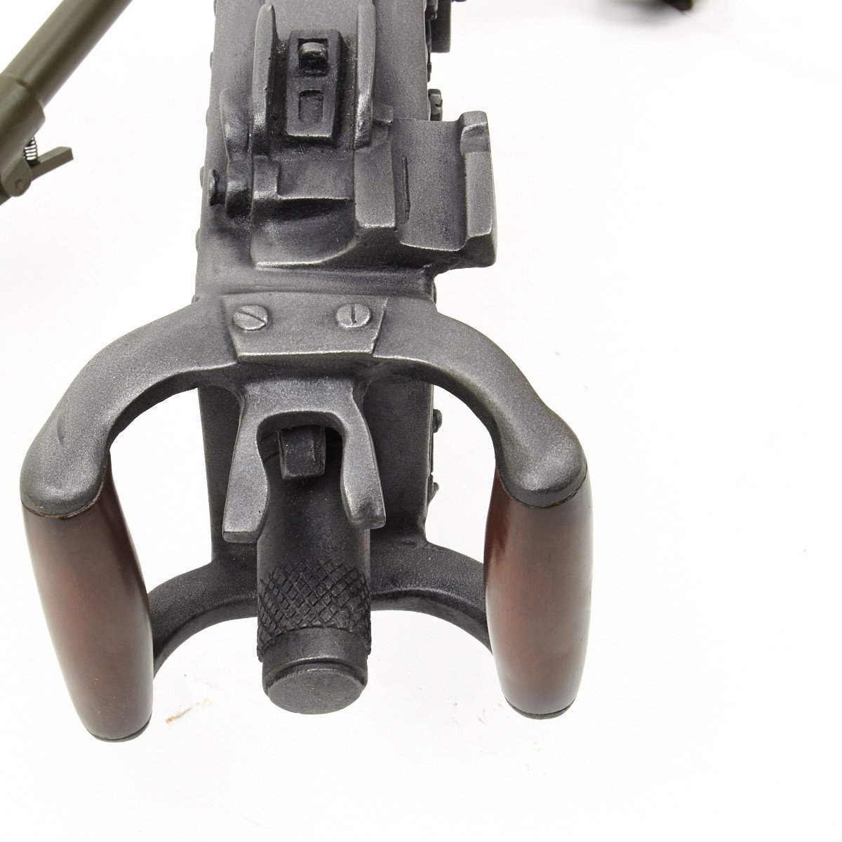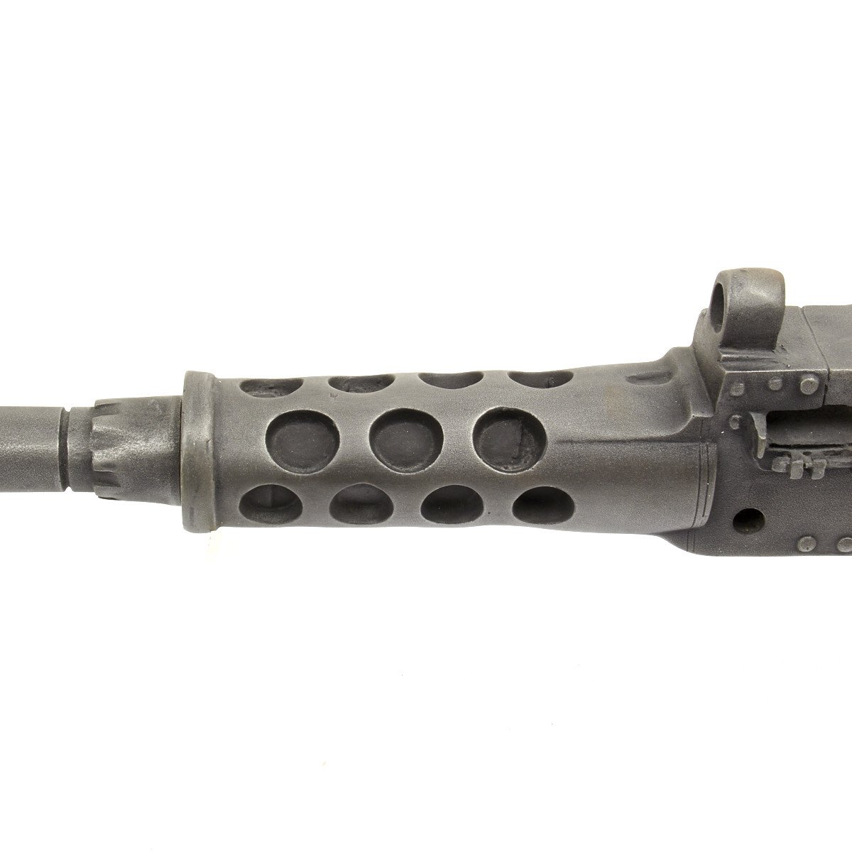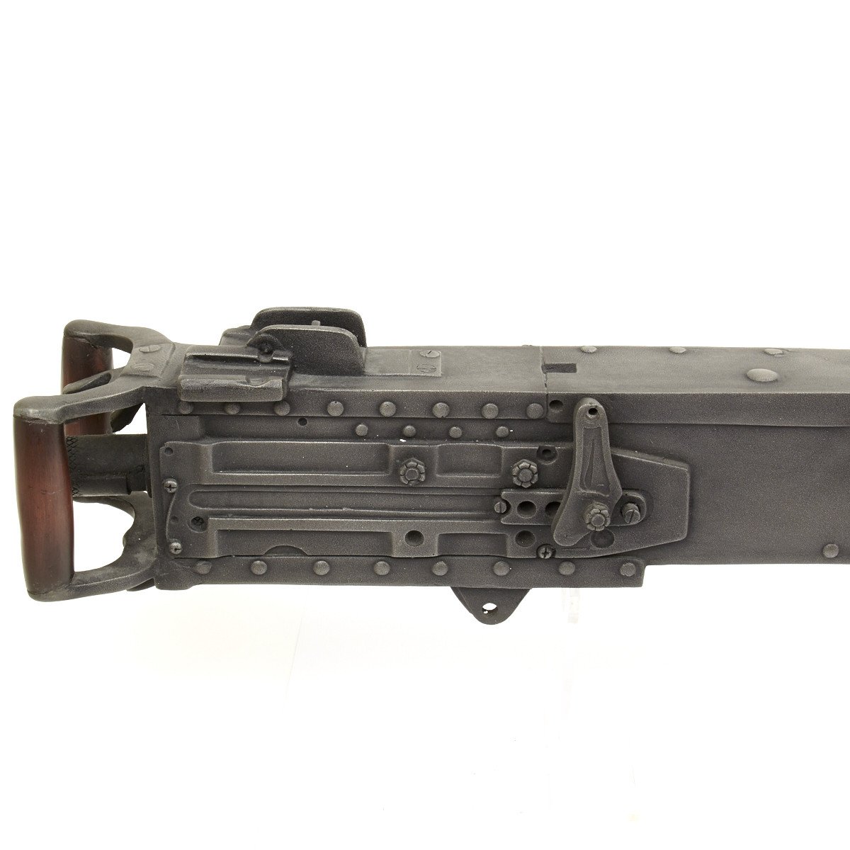 Our solid resin non-firing display gun is nothing short of stunning. It really does look like the real thing from just a few feet away. It was cast from a silicone mold of an original M-2 in the IMA collection and therefore is not only an accurate full size 1:1 scale but has all the details of the real thing. It has been expertly air brushed to provide the cold glimmering look of steel and the warm richness of walnut wood grips. For added authenticity we have used metal fittings at the pintle point to allow you to correctly mount this weapon (we have ours mounted on an M2 tripod for the sake of space) as well as an added metal wire frame that runs through most of the more delicate areas of the gun, and used a 6 INCH STEEL BOLT with large washer at the detachable barrel joint, as well a a STEEL INNER BARREL with resin over-wrap to insure ease of transport and strength of display, be it in your show room or on the back of a Jeep!