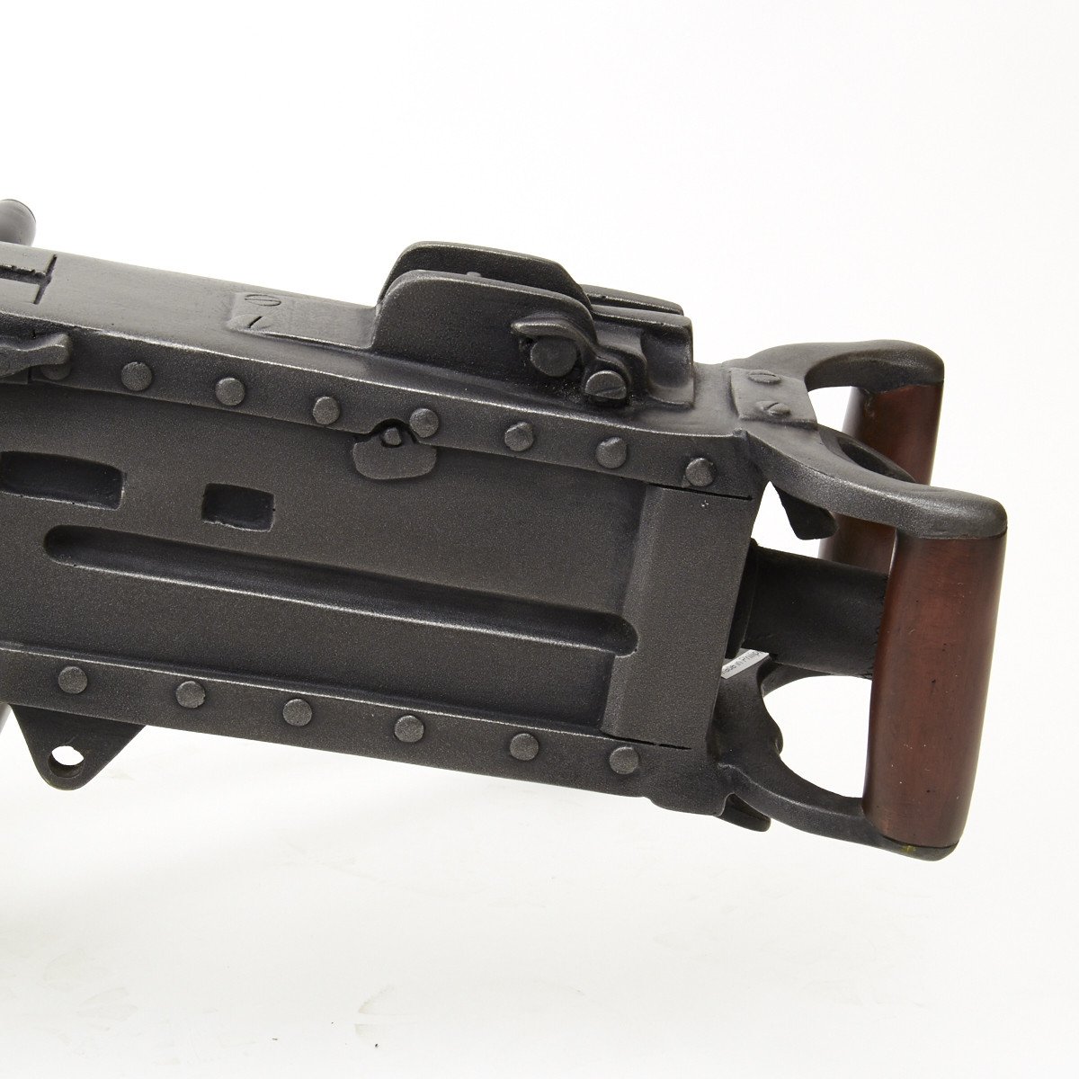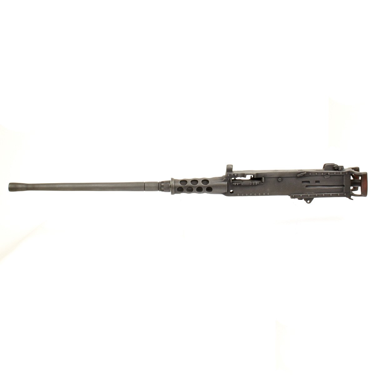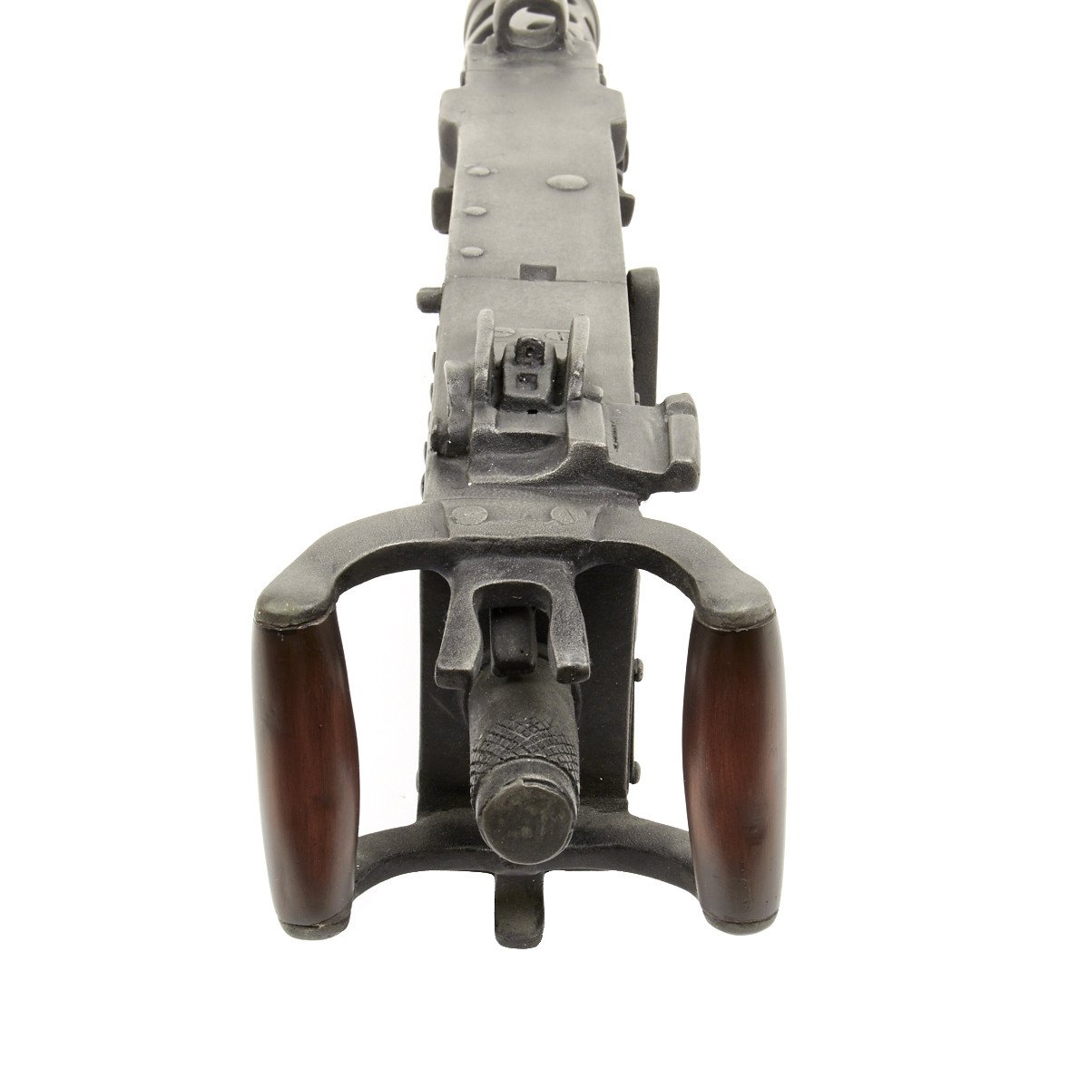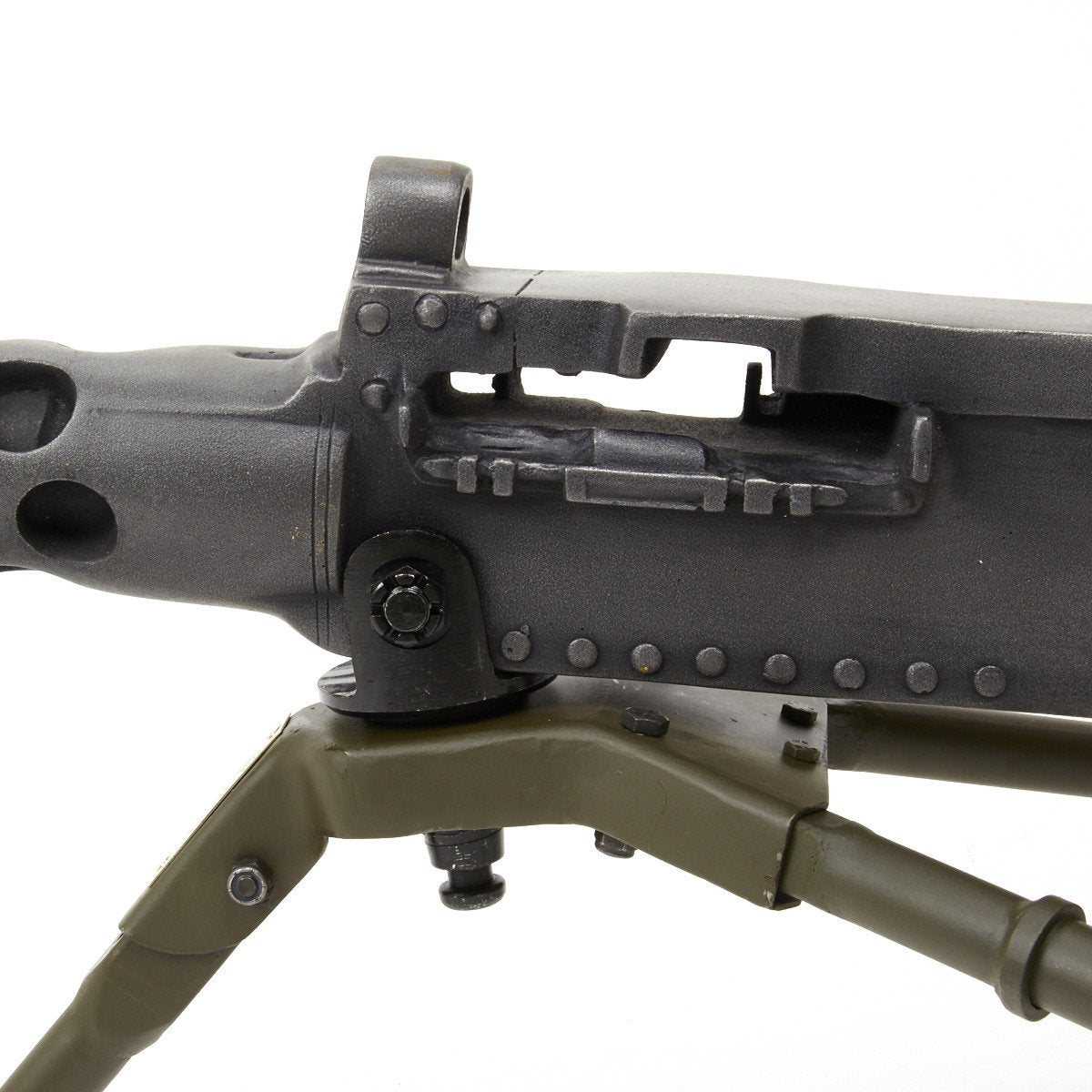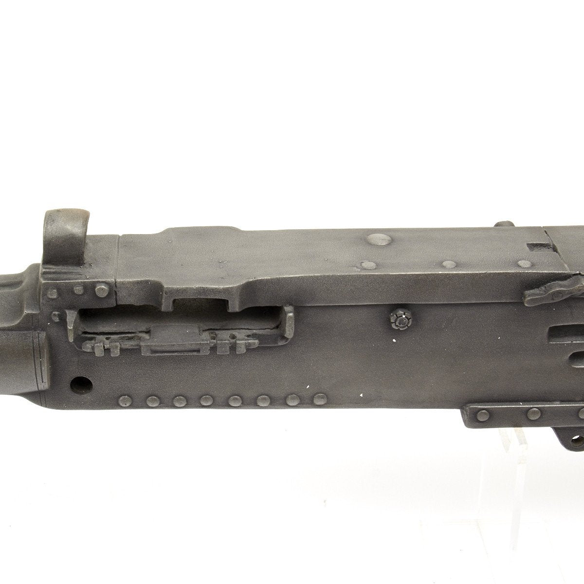 Our solid resin non-firing display gun is nothing short of stunning. It really does look like the real thing from just a few feet away. It was cast from a silicone mold of an original M-2 in the IMA collection and therefore is not only an accurate full size 1:1 scale but has all the details of the real thing. It has been expertly air brushed to provide the cold glimmering look of steel and the warm richness of walnut wood grips. For added authenticity we have used metal fittings at the pintle point to allow you to correctly mount this weapon (we have ours mounted on an M2 tripod for the sake of space) as well as an added metal wire frame that runs through most of the more delicate areas of the gun, and used a 6 INCH STEEL BOLT with large washer at the detachable barrel joint, as well a a STEEL INNER BARREL with resin over-wrap to insure ease of transport and strength of display, be it in your show room or on the back of a Jeep!