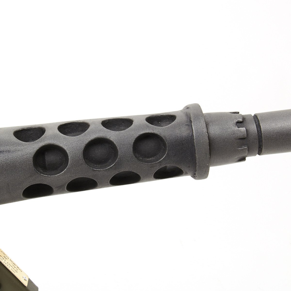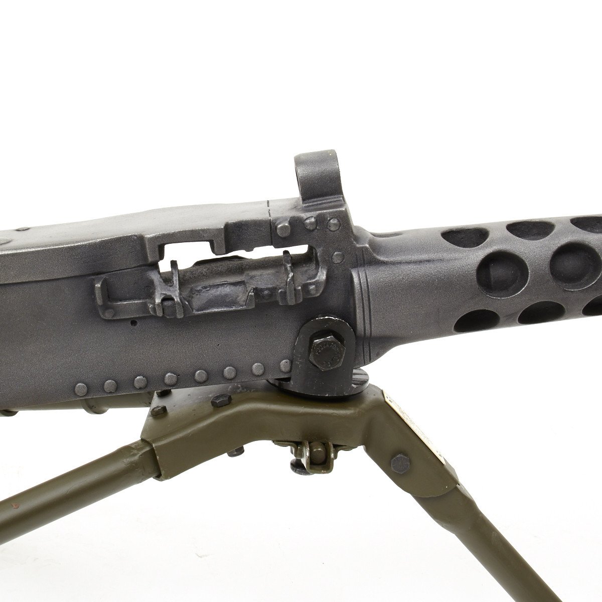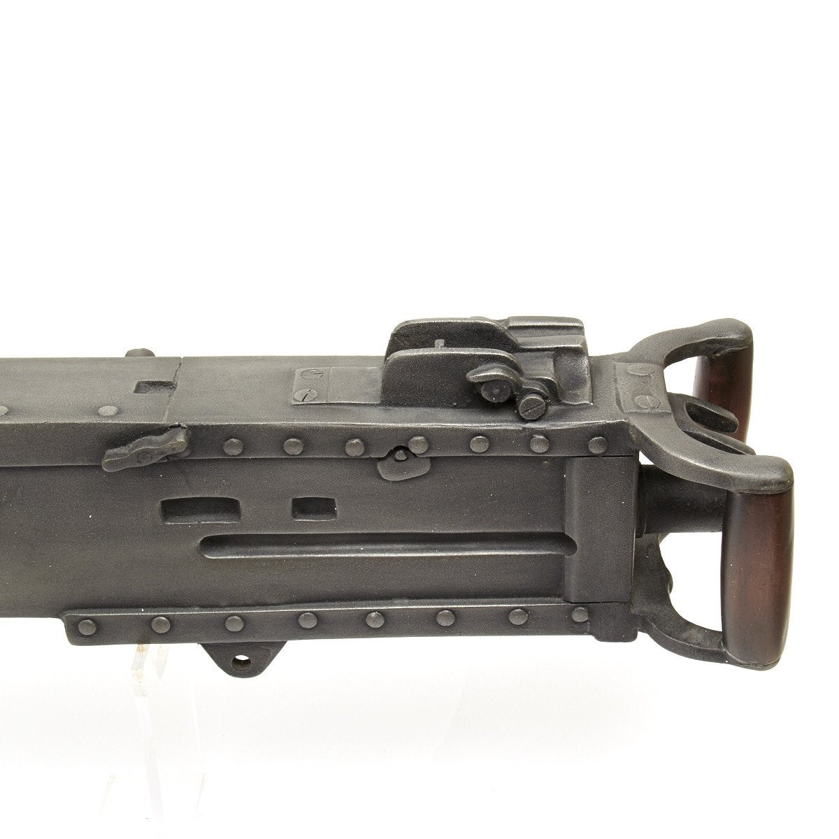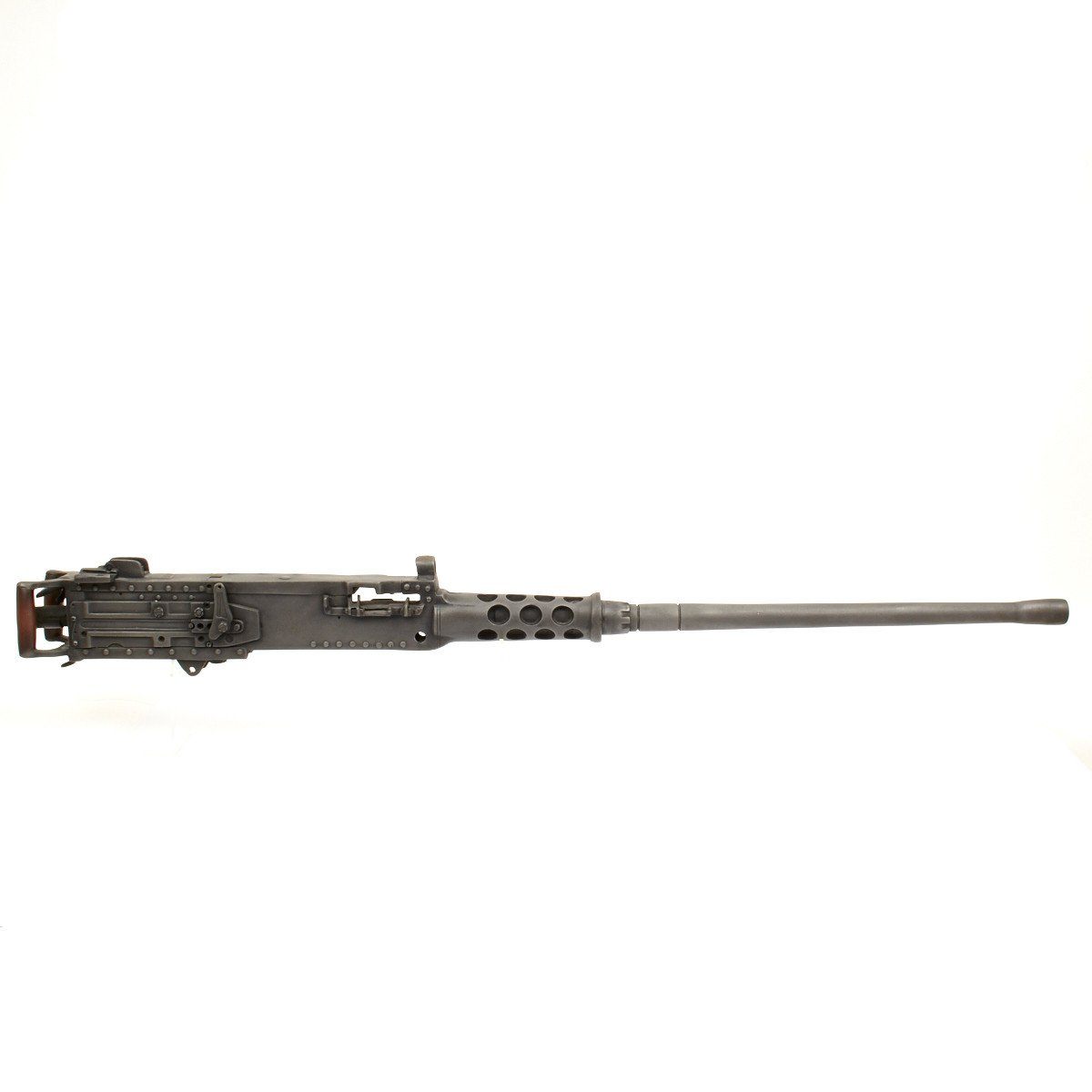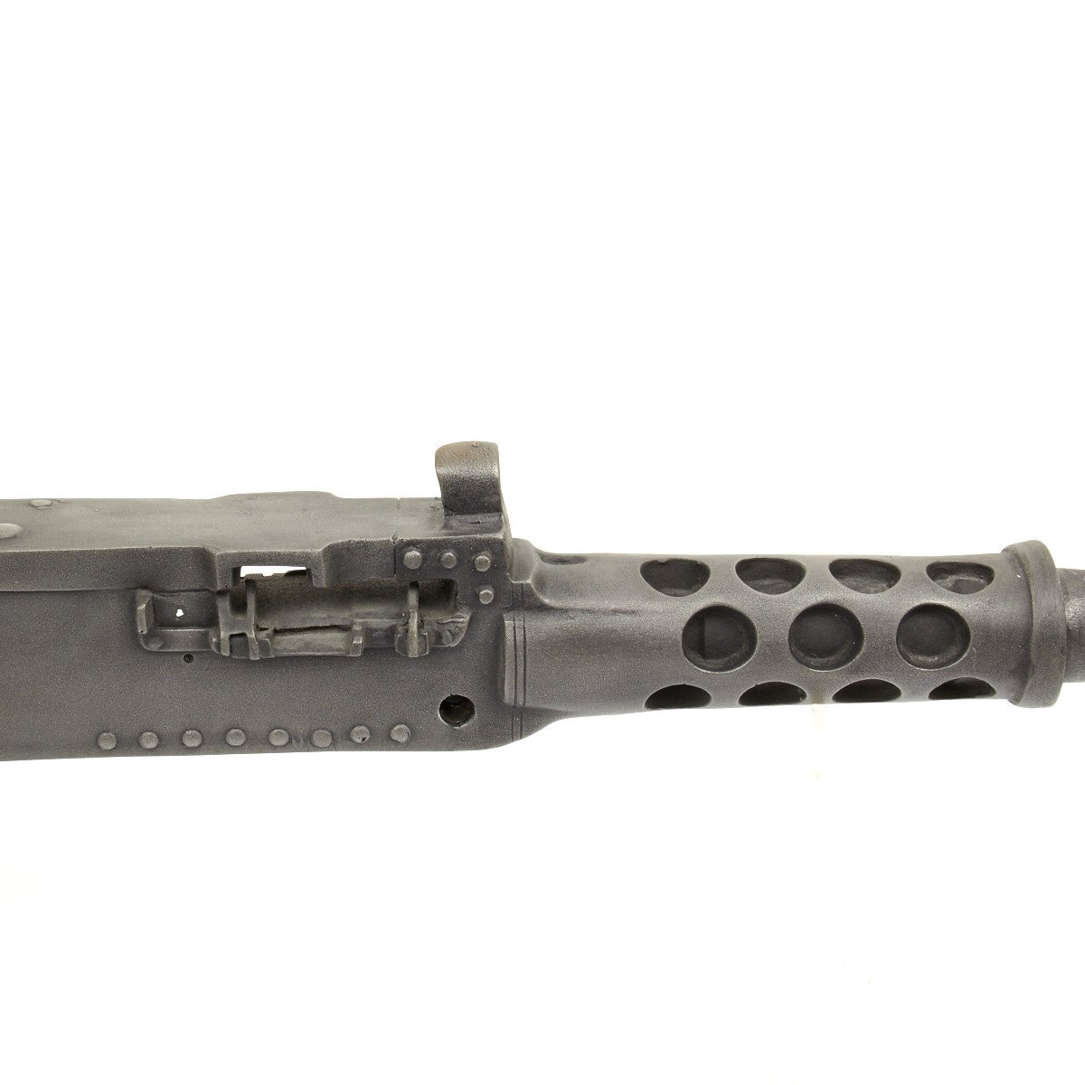 Our solid resin non-firing display gun is nothing short of stunning. It really does look like the real thing from just a few feet away. It was cast from a silicone mold of an original M-2 in the IMA collection and therefore is not only an accurate full size 1:1 scale but has all the details of the real thing. It has been expertly air brushed to provide the cold glimmering look of steel and the warm richness of walnut wood grips. For added authenticity we have used metal fittings at the pintle point to allow you to correctly mount this weapon (we have ours mounted on an M2 tripod for the sake of space) as well as an added metal wire frame that runs through most of the more delicate areas of the gun, and used a 6 INCH STEEL BOLT with large washer at the detachable barrel joint, as well a a STEEL INNER BARREL with resin over-wrap to insure ease of transport and strength of display, be it in your show room or on the back of a Jeep!