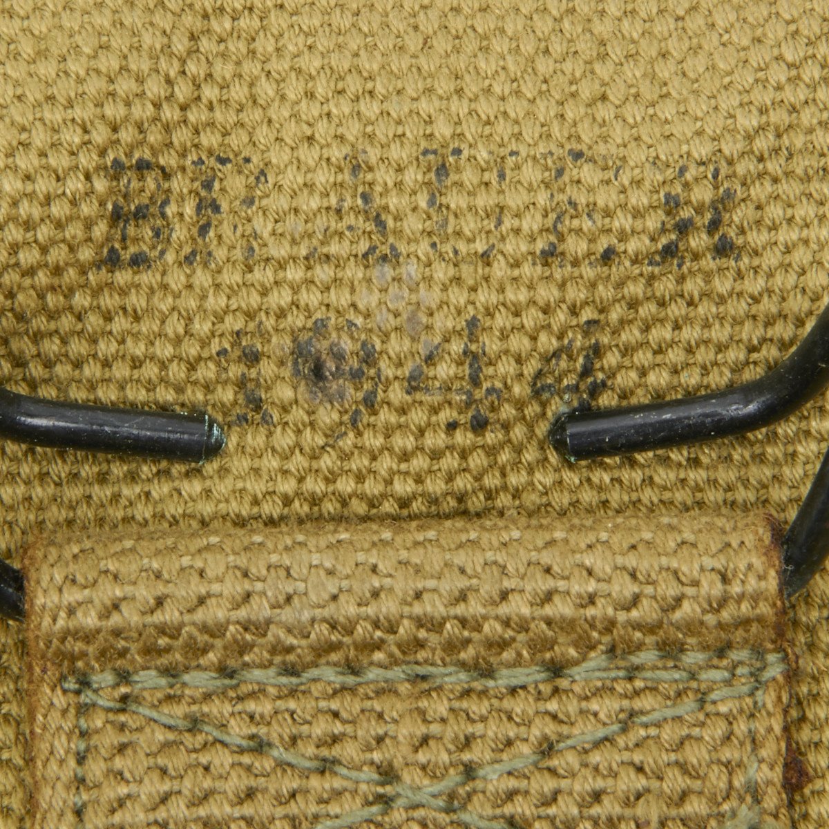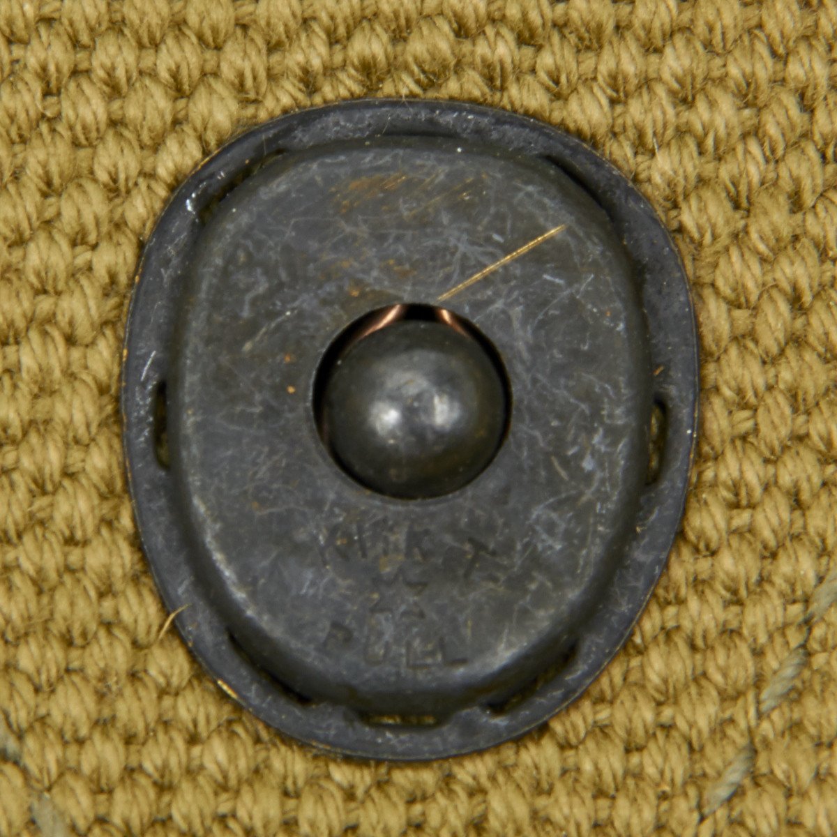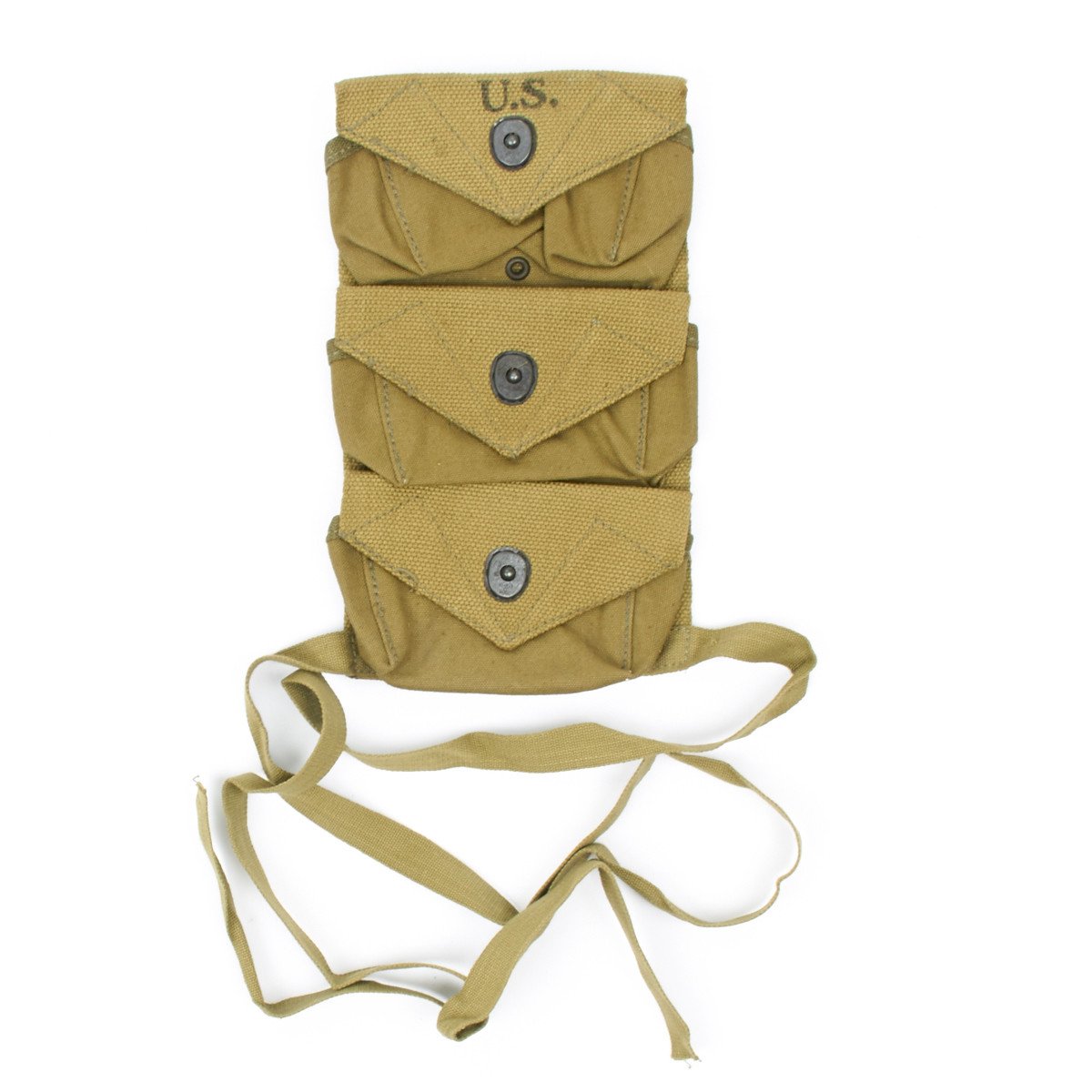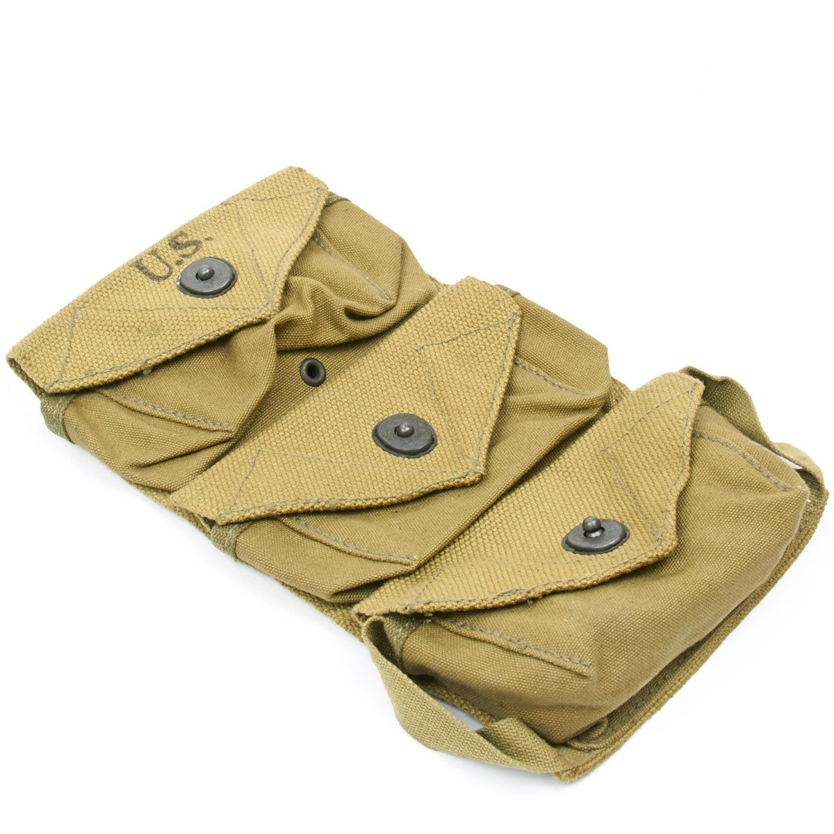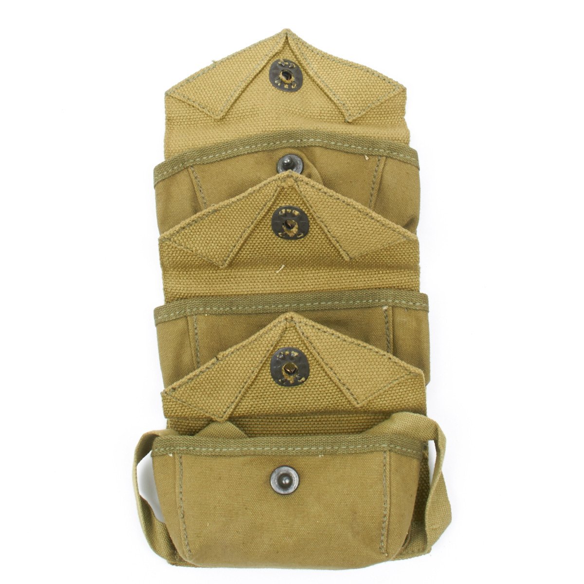 Original Item: Absolutely Original WW2 production recently released from Military Stores these are Maker marked and WW2 dated early style Khaki single "lift-the-dot" strapped triple pocket grenade pouches. With rear steel fitting for use with standard Infantry belt each comes with original tie down leg straps. Top pocket stamped U.S. in excellent almost unissued