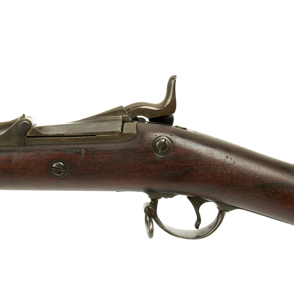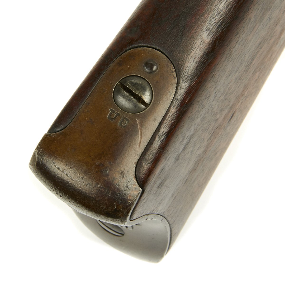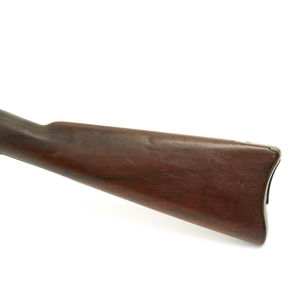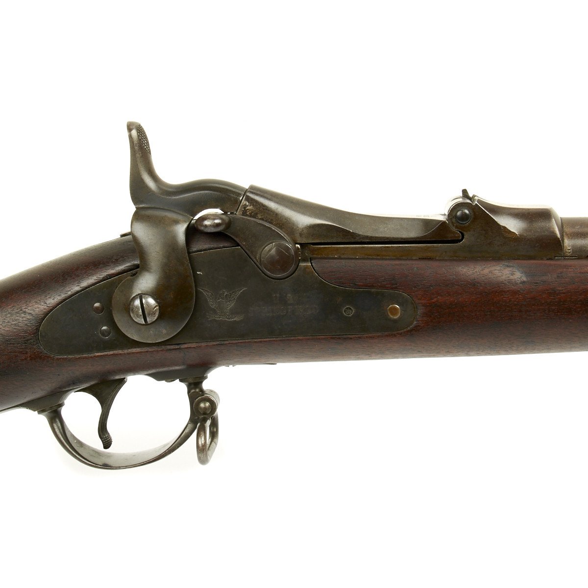 The butt plate is marked U.S. and both barrel bands are "U" marked. The rifle features an excellent un-sanded stock. Center fire breechloader, .45 cal., two bands, two sling swivels, Buffington sight, sliding ramrod bayonet. Lock is marked with an eagle and "US SPRINGFIELD" manufactured by Springfield Armory, Springfield Massachusetts. Breechblock is marked US Model 1884.