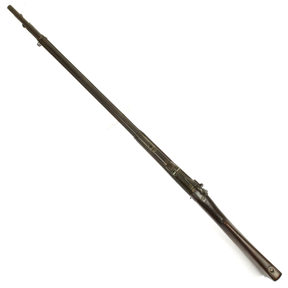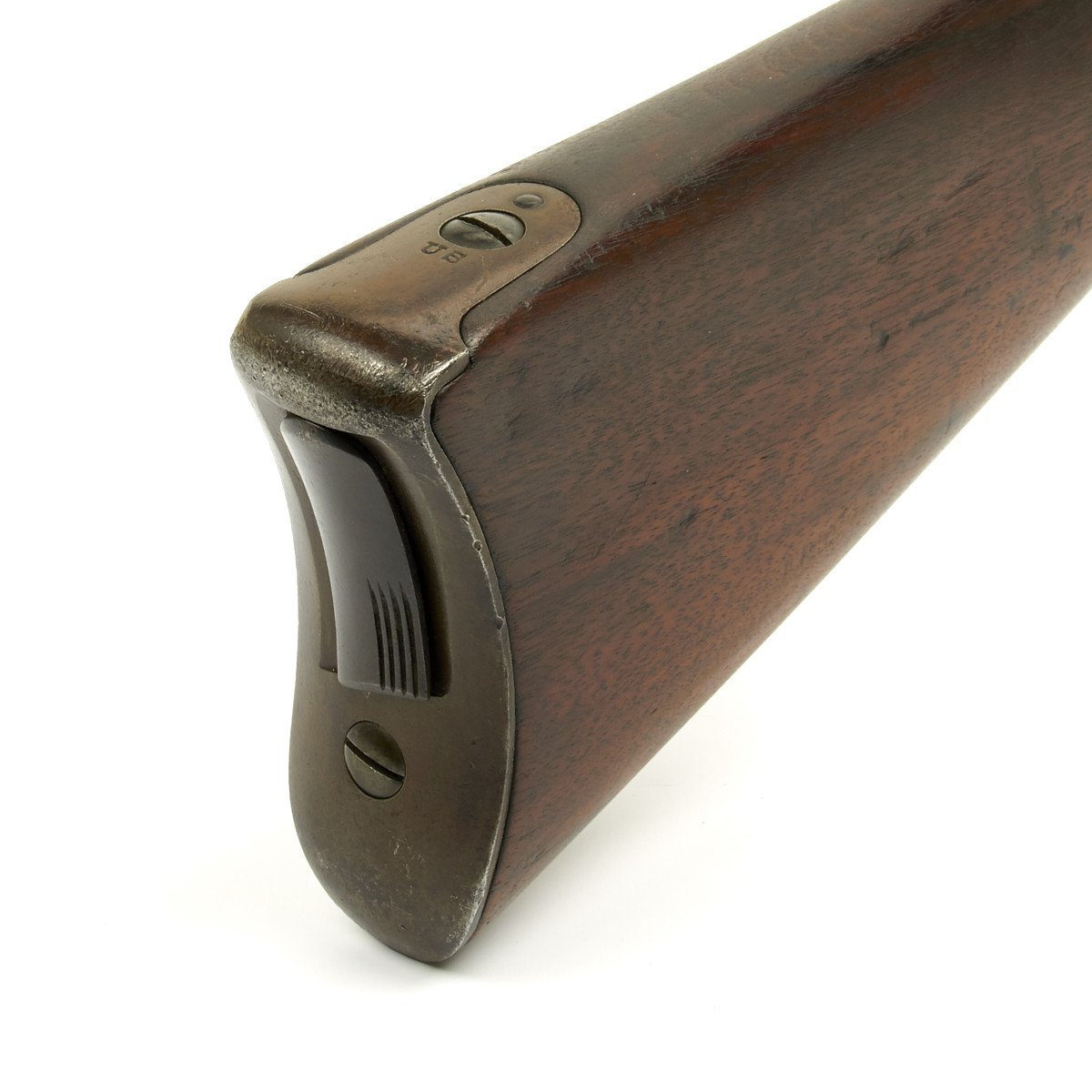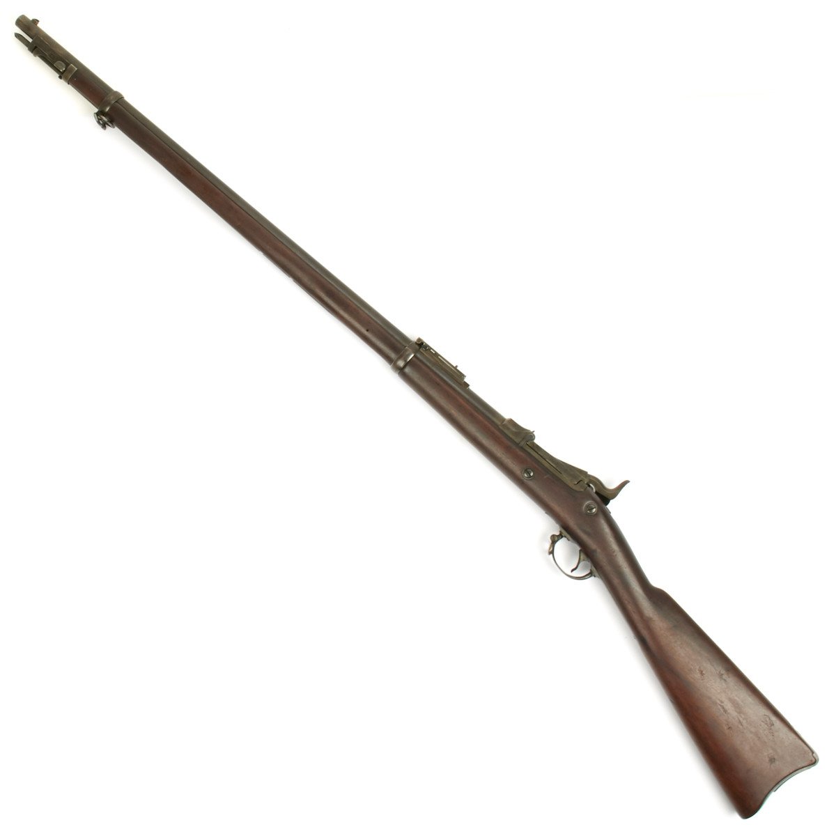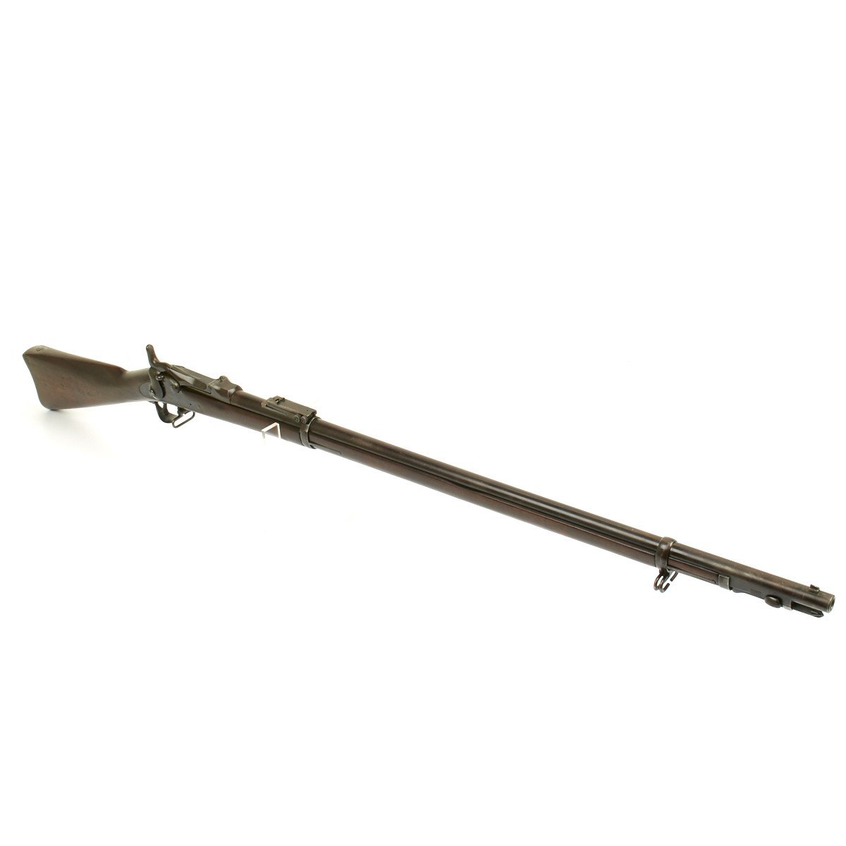 The butt plate is marked U.S. and both barrel bands are "U" marked. The rifle features an excellent un-sanded stock. Center fire breechloader, .45 cal., two bands, two sling swivels, Buffington sight, sliding ramrod bayonet. Lock is marked with an eagle and "US SPRINGFIELD" manufactured by Springfield Armory, Springfield Massachusetts. Breechblock is marked US Model 1884.