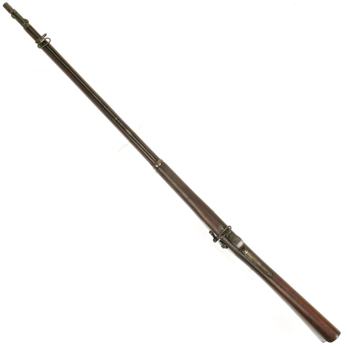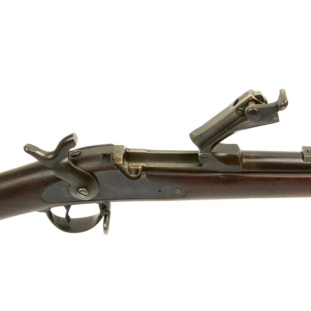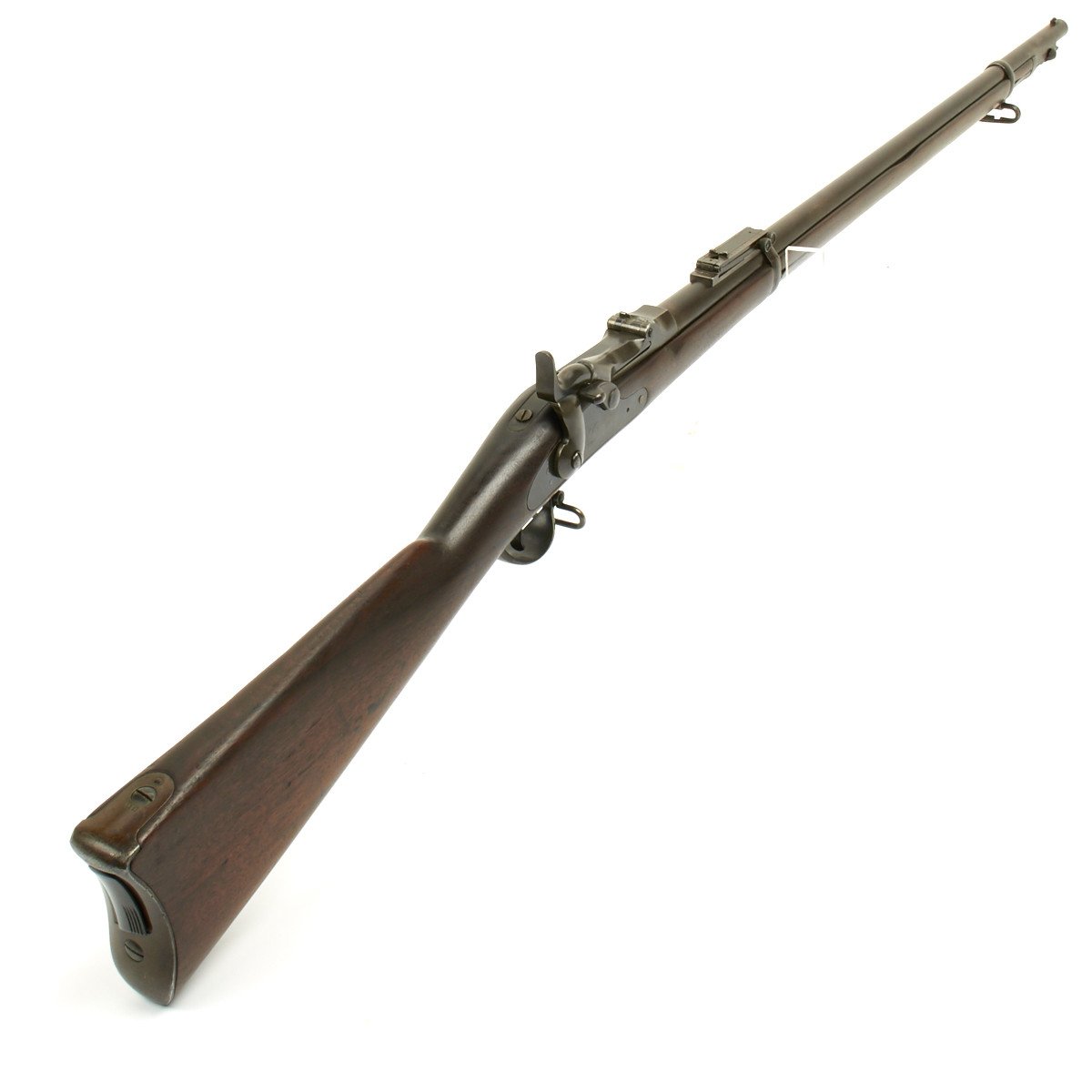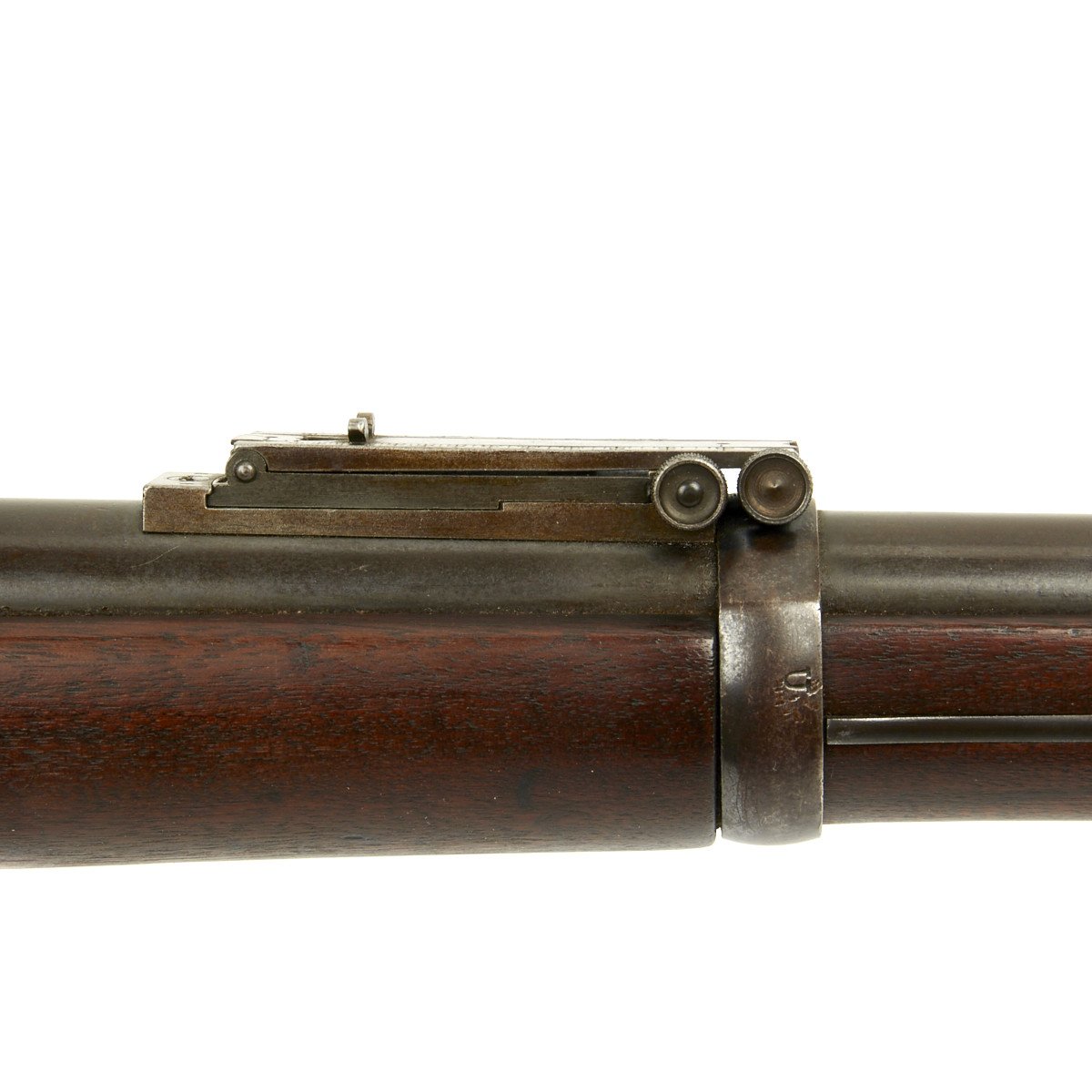 The butt plate is marked U.S. and both barrel bands are "U" marked. The rifle features an excellent un-sanded stock. Center fire breechloader, .45 cal., two bands, two sling swivels, Buffington sight, sliding ramrod bayonet. Lock is marked with an eagle and "US SPRINGFIELD" manufactured by Springfield Armory, Springfield Massachusetts. Breechblock is marked US Model 1884.