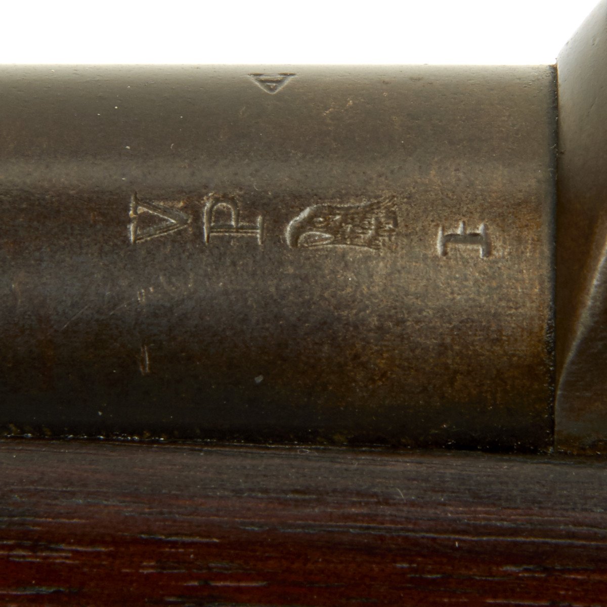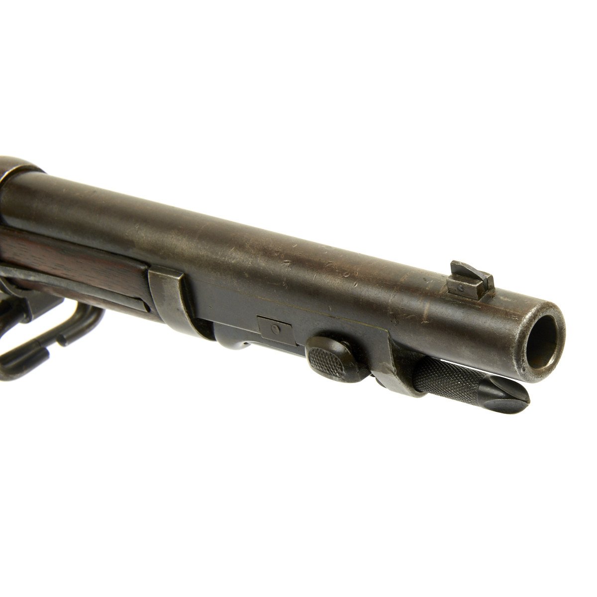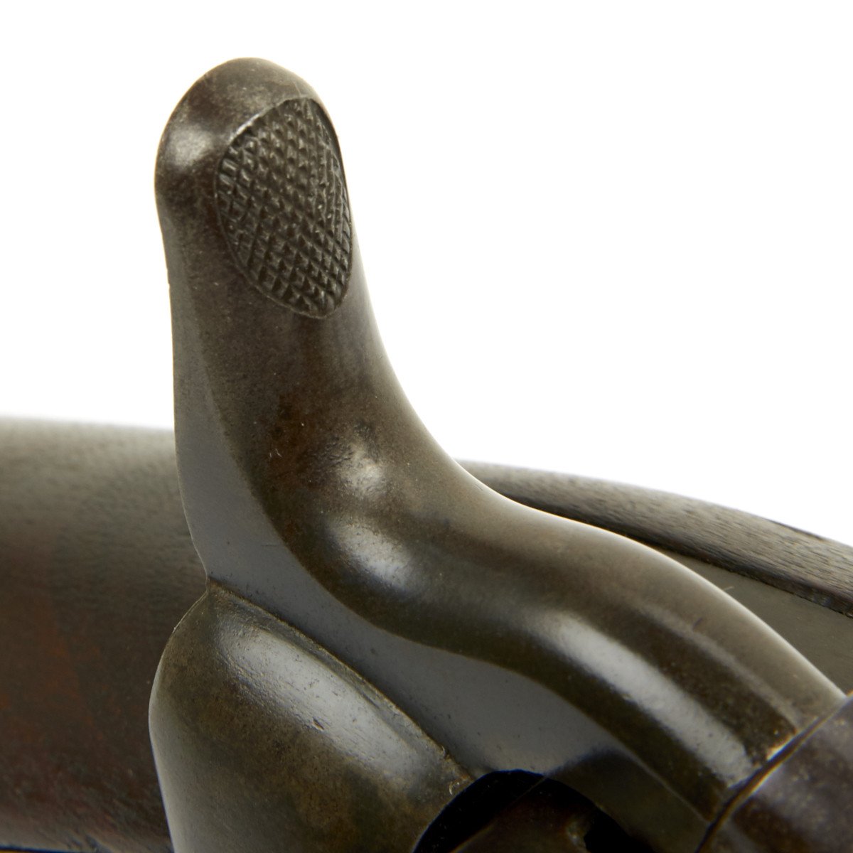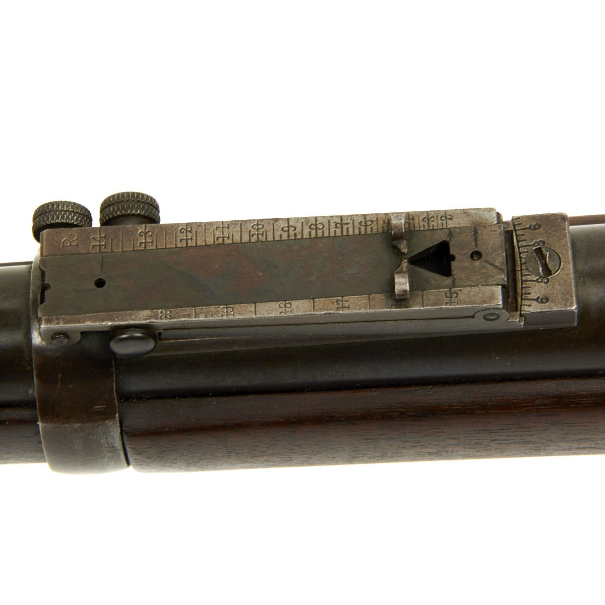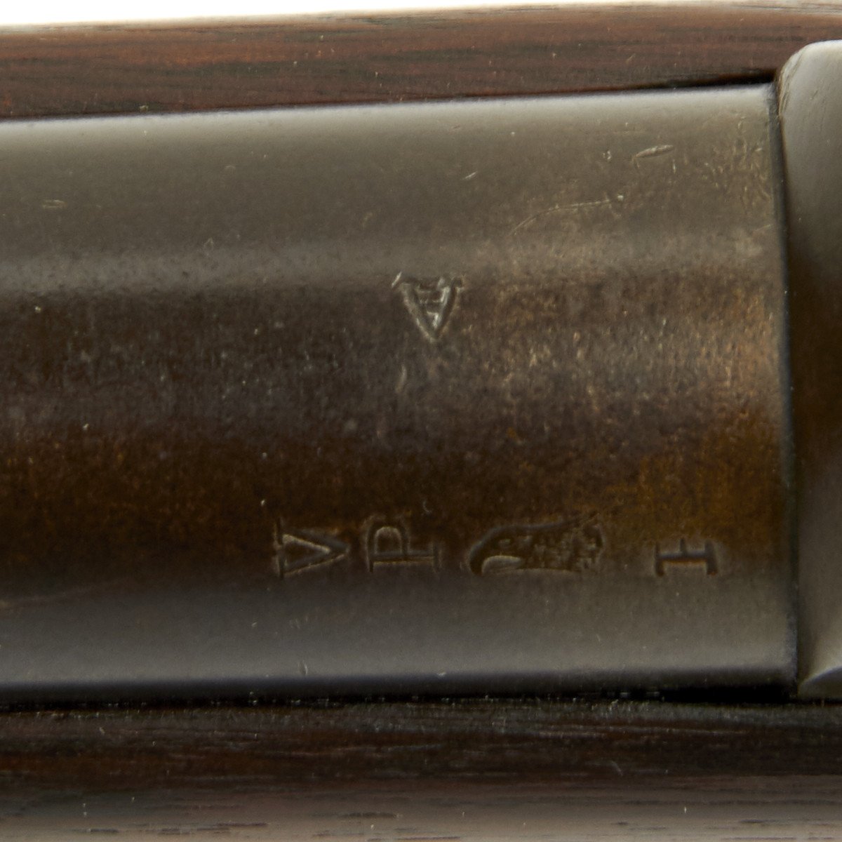 Additional marks of interest include inspectors’ and proof marks around the breech end of the barrel: a capital A on top; and a V over a P over an eagle’s head over another P on the left side just above the stock. The upper right corner of the Buffington sight leaf is marked R to indicate that the sight graduations are for a rifle and not a carbine.
