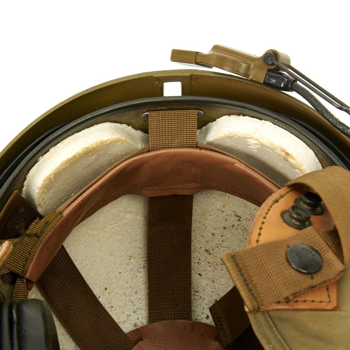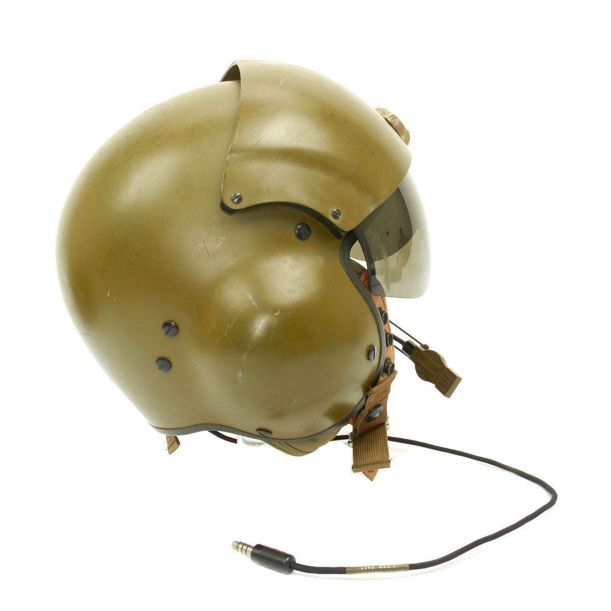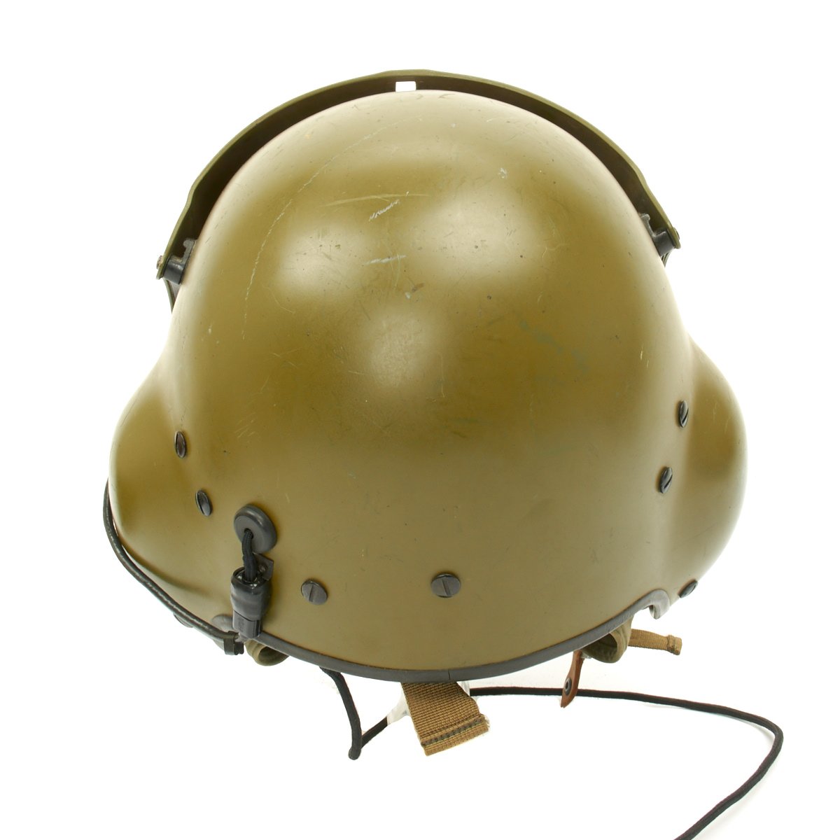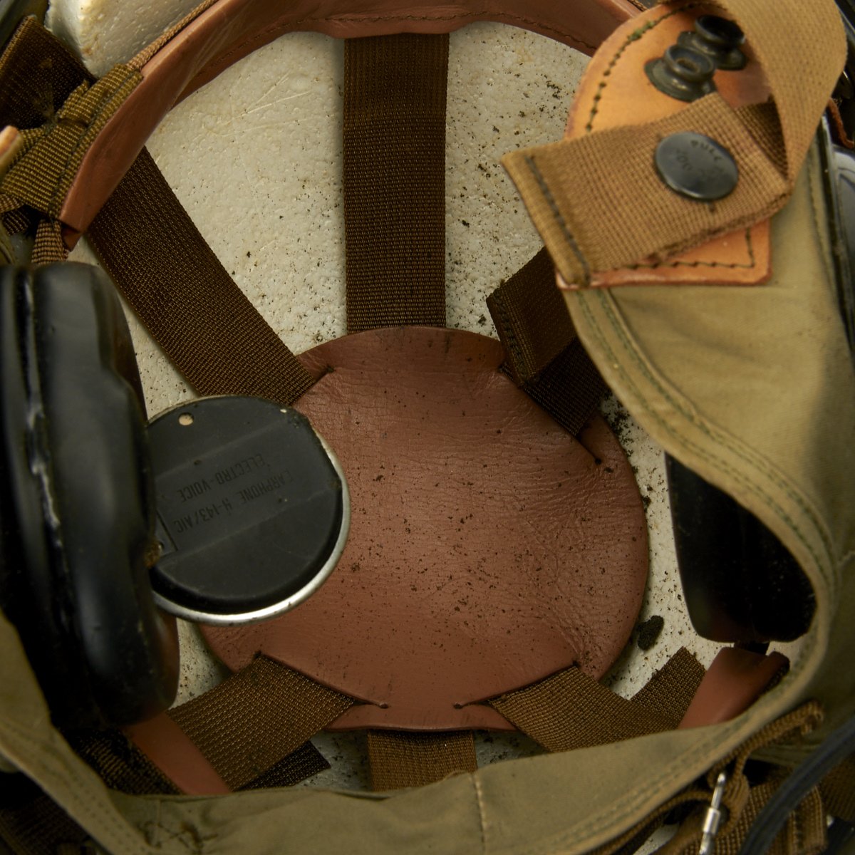 The original SPH-4 had a shell made of fibreglass cloth layers bonded by epoxy. The inner polystyrene foam energy absorbing liner was 97 mm (0.38") thick with a density of 5.2 lb/ft3. The helmet was fitted with a sling suspension liner and had a nape strap with a single snap on each side fitting to studs on a retention harness. The chin strap had a design strength of 150 lbs. The headset was mounted in 6 mm thick moulded plastic ear cups with excellent sound attenuation characteristics. A size regular helmet weighed 1.54 kg (3.4 lbs).